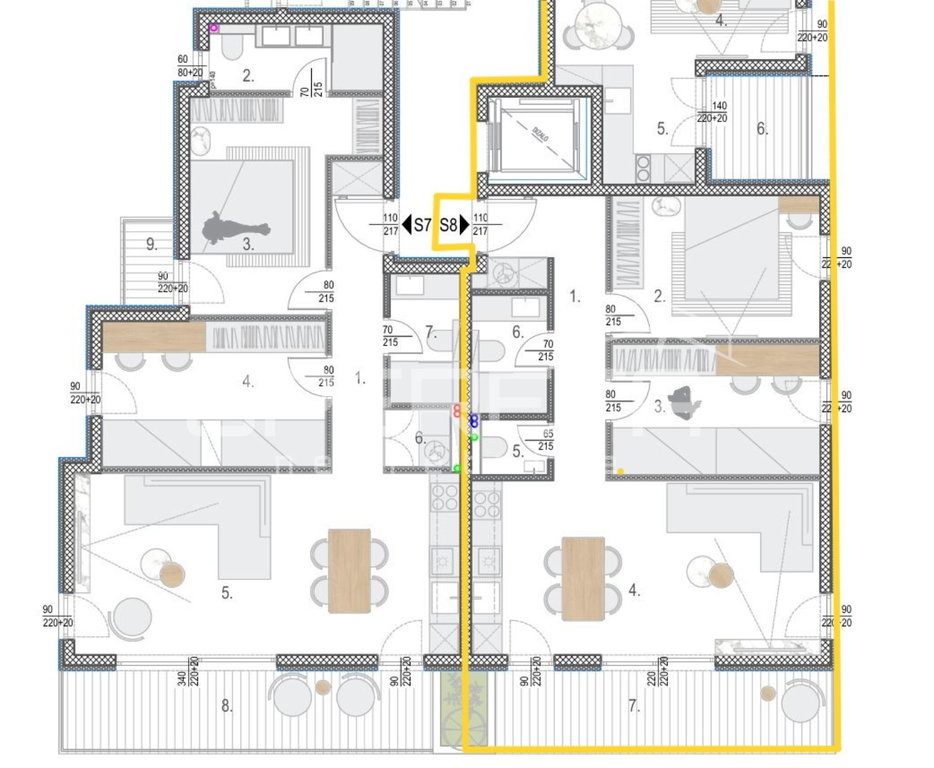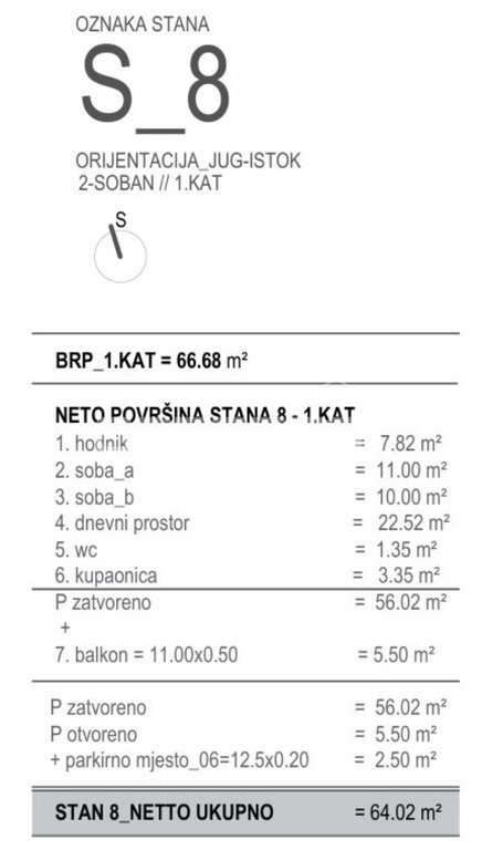 Stan S8 nalazi se na 1. katu i ima neto obračunsku površinu 64,02 m². Sastoji se od: hodnik = 7.82 m², soba_1 = 11.00 m², soba_2 = 10.00 m², dnevni prostor = 22.52 m², wc = 1.35 m², kupaonica = 3.35 m², balkon = 11.00x0.50 = 5.50 m², parkirno mjesto_06=12.5x0.20 = 2.50 m²