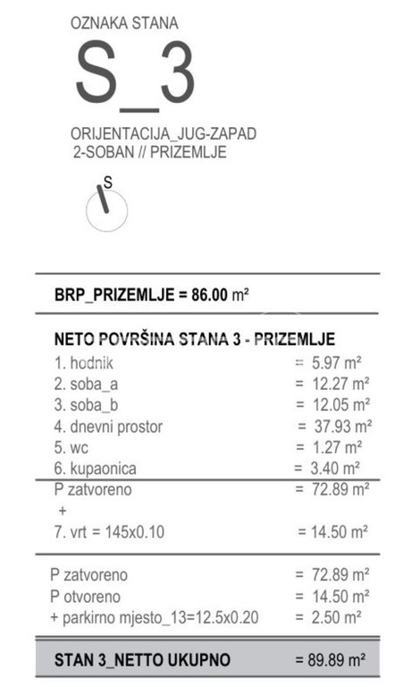 Apartment S3 is located on the ground floor and has a net floor area of 89.89 m². It consists of a hallway of 5.97 m², bedroom 1 of 12.27 m², bedroom 2 of 12.05 m², a living area of 37.93 m², a toilet of 1.27 m², a bathroom of 3.40 m², a garden of 14.50 m² (145×0.10), and a parking space of 2.50 m² (12.5×0.20).