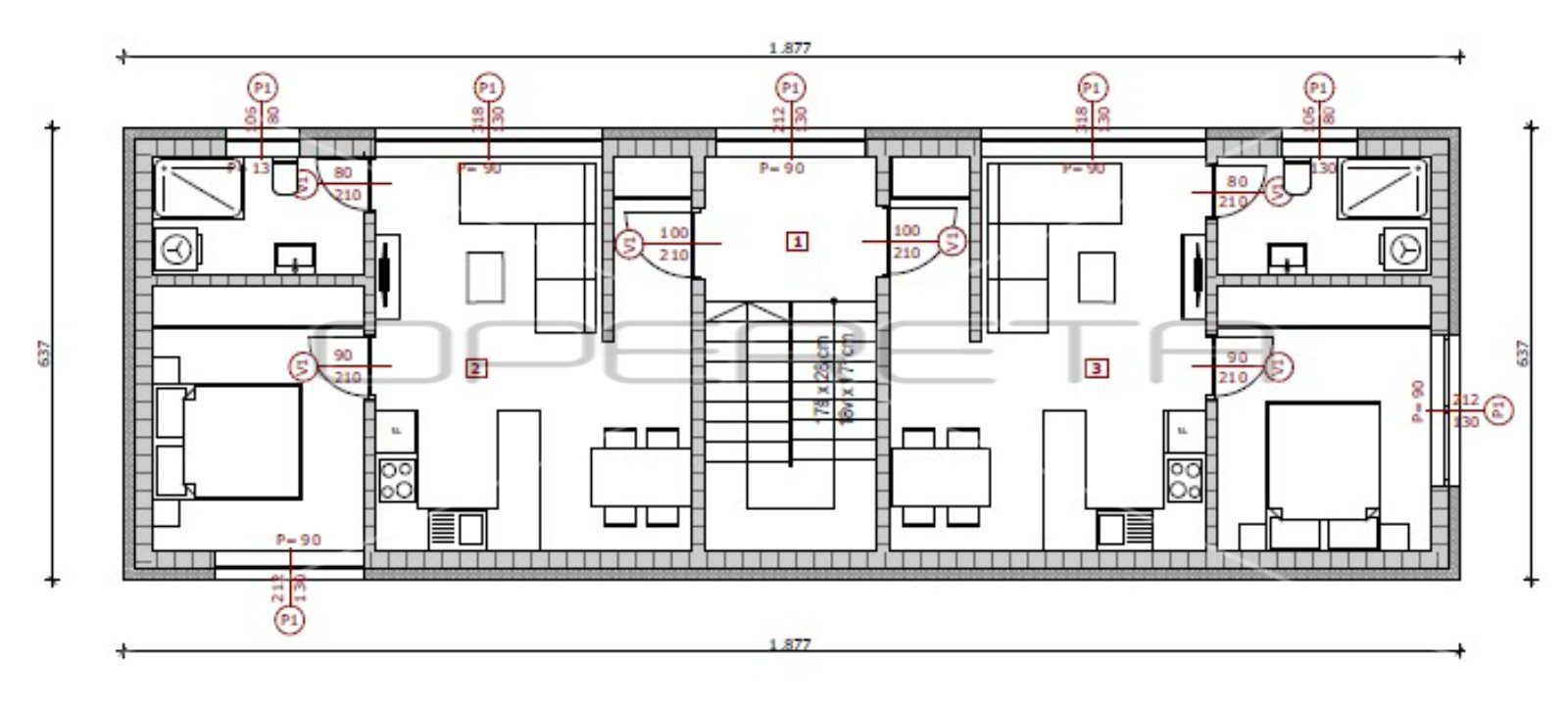 Idejni projekt obuhvaća poslovni prostor u prizemlju površine 40,84 m2 kao i dva manja dvosobna stana od 40,53 m2. Za svaki stan je zamišljena i galerija u potkrovlju koja će dodatno doprinijeti većem dojmu stanova. Predviđeno je 5 parkirališnih mjesta.