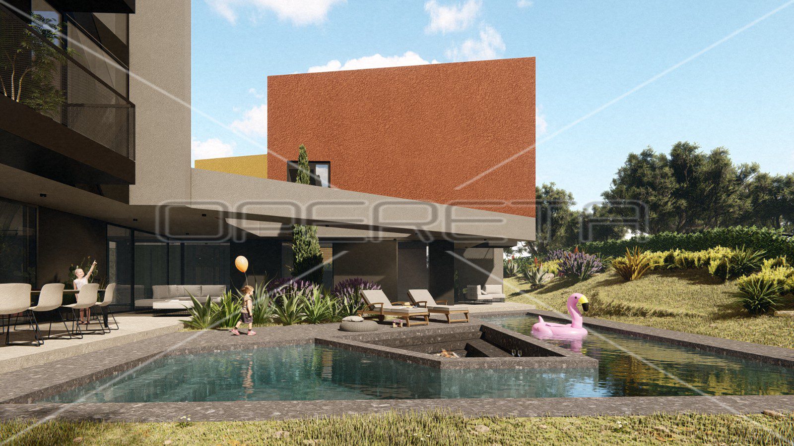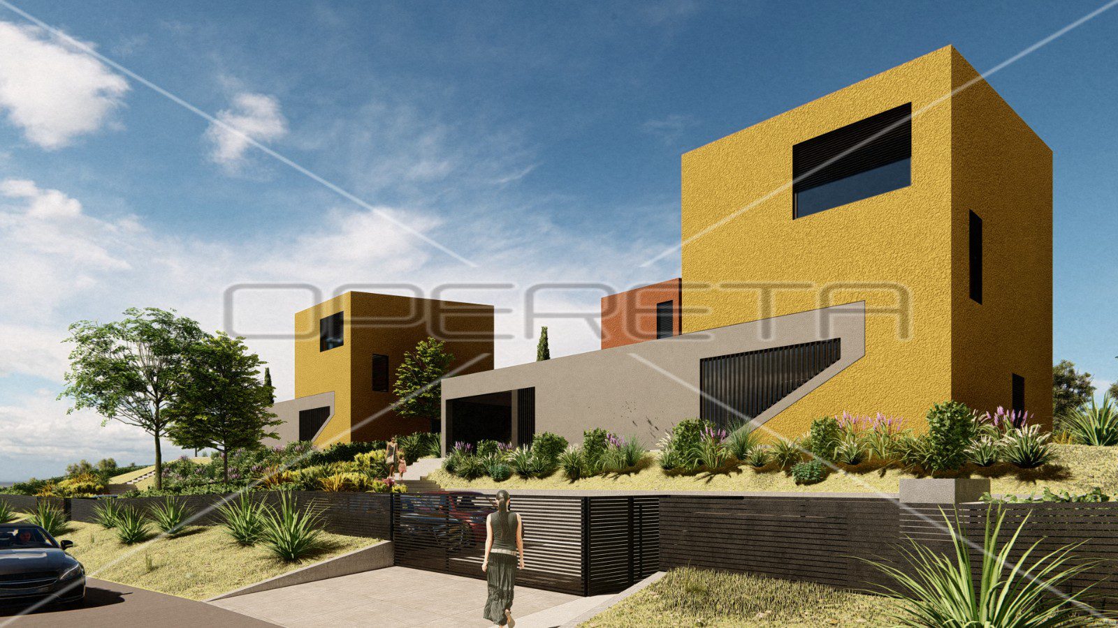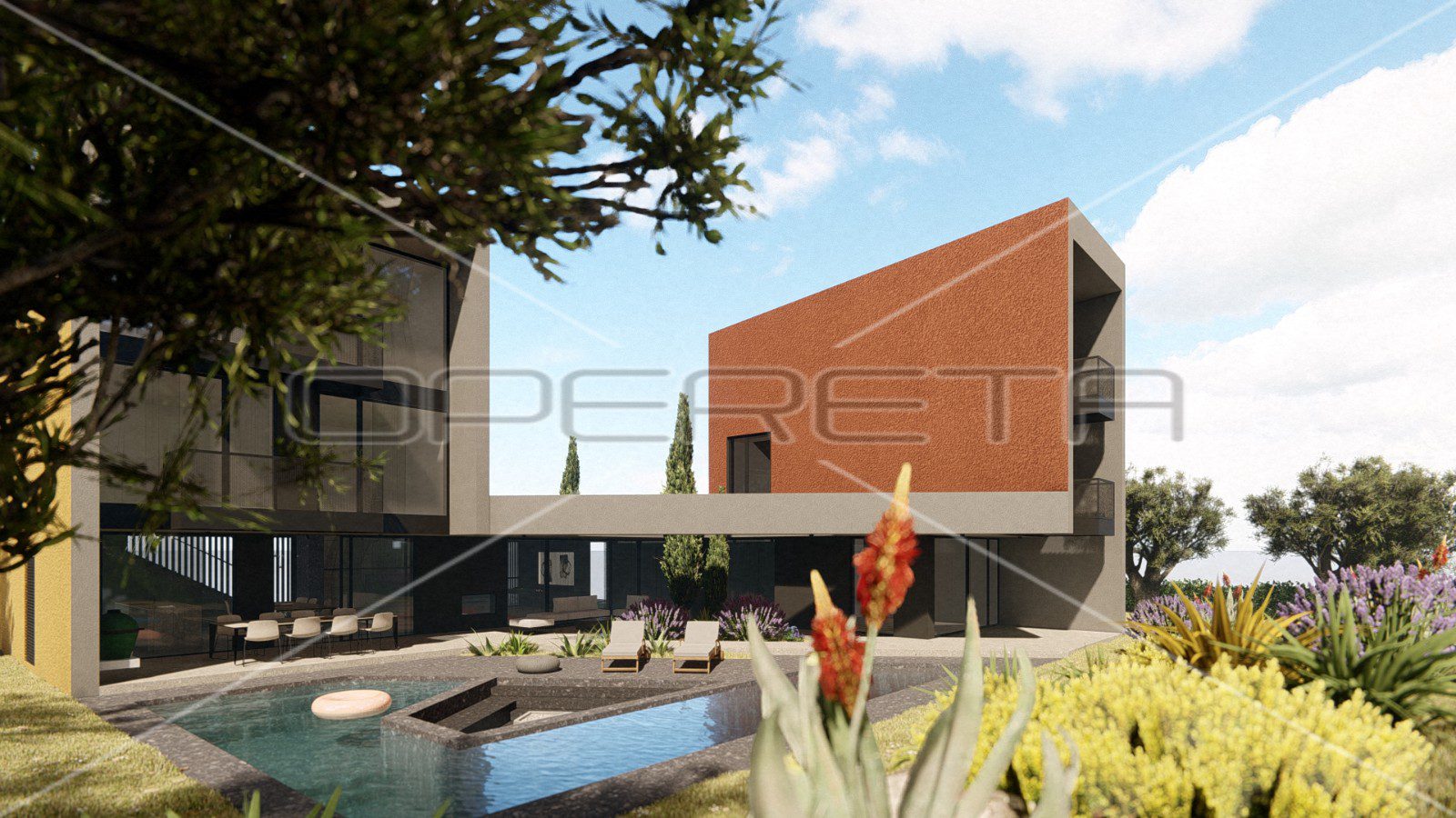 Zemljište se nalazi na lijepoj poziciji s blagim padom. Moderne urbane vile s raskošnim bazenima i zamišljene su na P+2 etaže, imaju 6 spavaćih soba sa ensuite kupaonama na gornjim etažama, prostrani dnevni boravak, modernu opremljenu kuhinju, sanitarije, servisne prostorije, te opuštajuću terasu i bazen okružen mediteranskim zelenilom. Ukupna tlocrtna površina kuće s bazenom je 330m2, a netto tlocrtna površina s koeficijentima 356m2 (prizemlje 180m2, 1. kat 91m2, 2.kat 85m2). Površina bazena je 56m2.