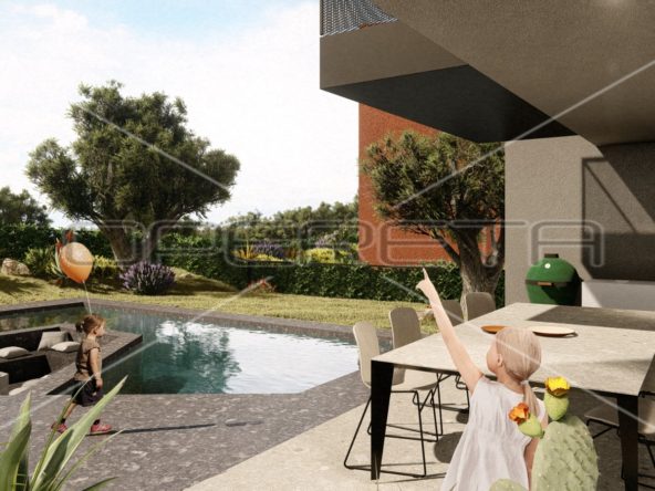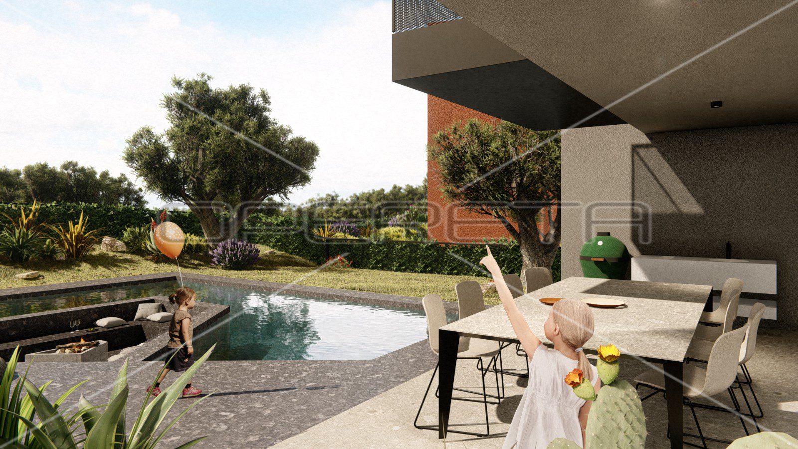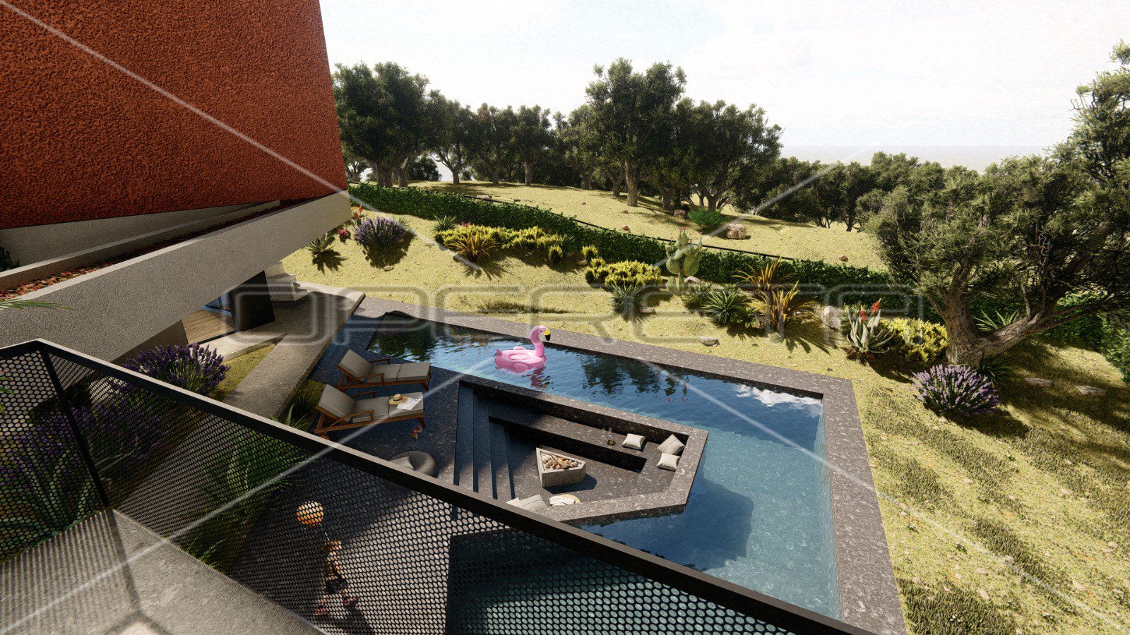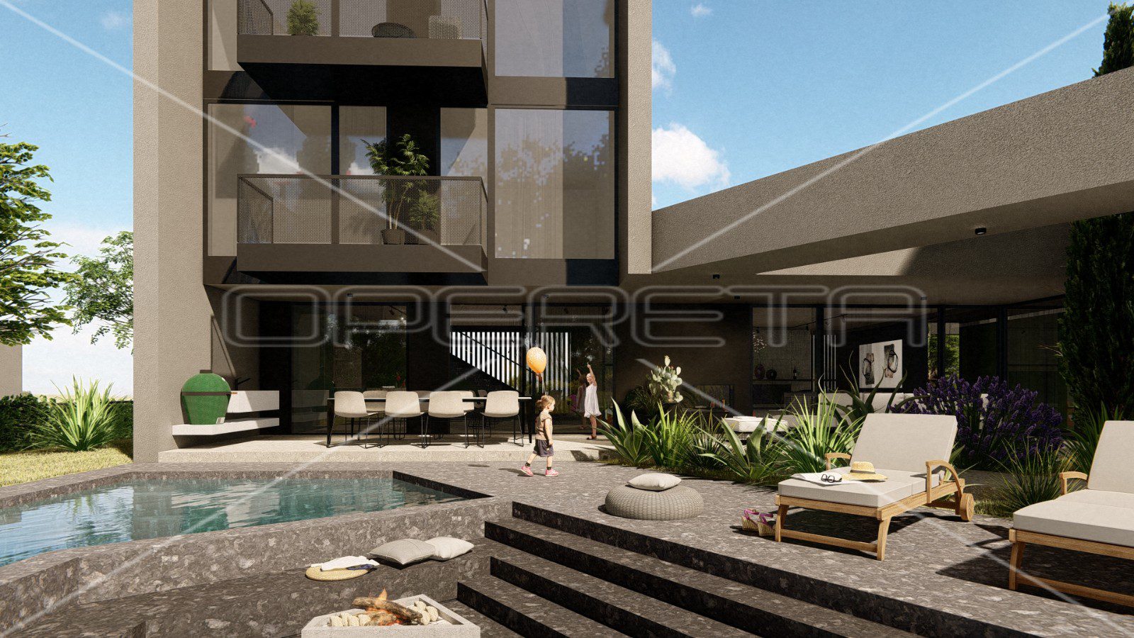 Zemljište se nalazi na lijepoj poziciji s blagim padom. Moderne urbane vile s raskošnim bazenima i zamišljene su na P+2 etaže, imaju 6 spavaćih soba sa ensuite kupaonama na gornjim etažama, prostrani dnevni boravak, modernu opremljenu kuhinju, sanitarije, servisne prostorije, te opuštajuću terasu i bazen okružen mediteranskim zelenilom. Ukupna tlocrtna površina kuće s bazenom je 330m2, a netto tlocrtna površina s koeficijentima 356m2 (prizemlje 180m2, 1. kat 91m2, 2.kat 85m2). Površina bazena je 56m2.