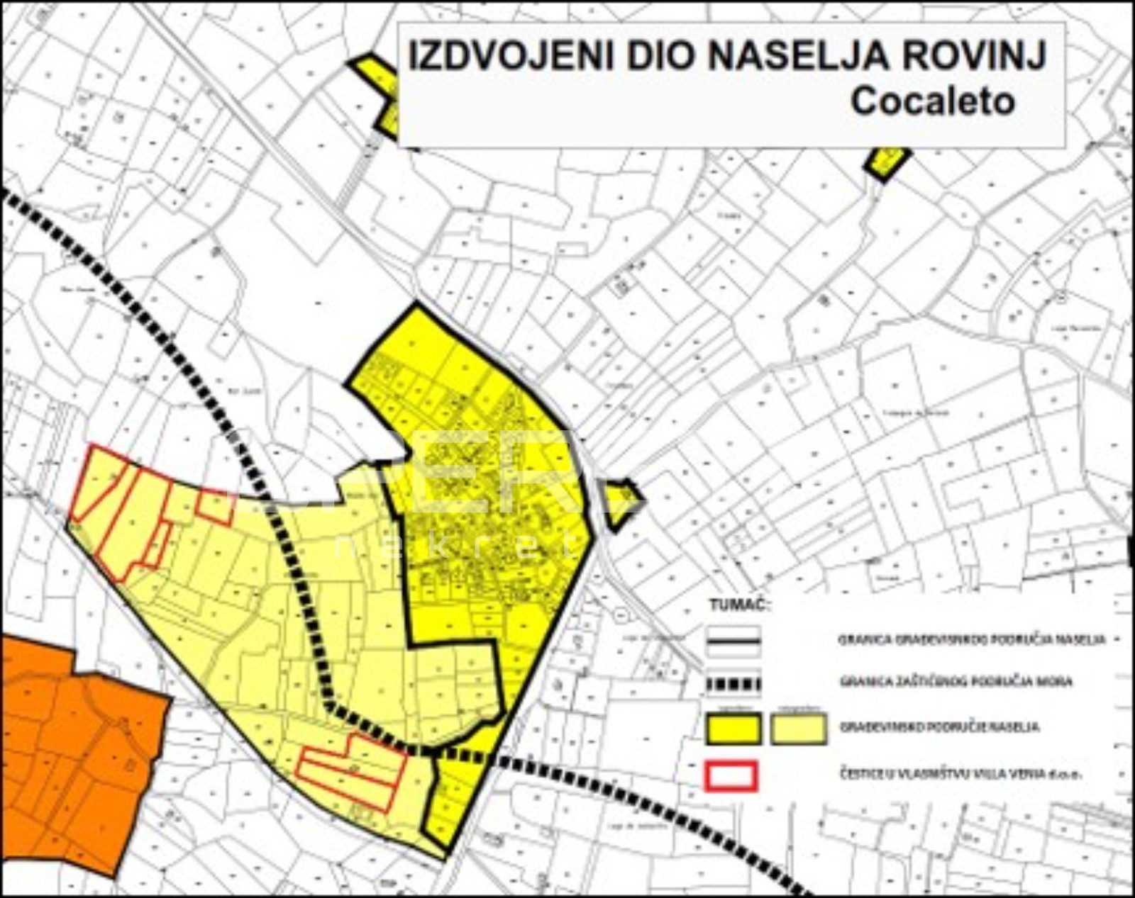 Prodaje se zemljište koje se sastoji od 6 čestica ukupne površine 24.788 m2 u naselju Cocaletto. Naselje je smješteno u okolici grada Rovinja, a samo zemljište je udaljeno 1.100 metara od mora. Prostornim planom uređenja naselje Cocaletto tretira se kao izdvojeno područje grada Rovinja na kojem će se detaljnijim planom odrediti visina gradnje i vrsta objekata s obzirom na broj stambenih jedinica, s mogućnošću da to bude zona s obiteljskim i višeobiteljskim objektima (maksimalno 4 stambene jedinice) maksimalne katnosti 3 nadzemne etaže. Minimalna veličina građevinske čestice za obiteljske građevine je 500 m2,
