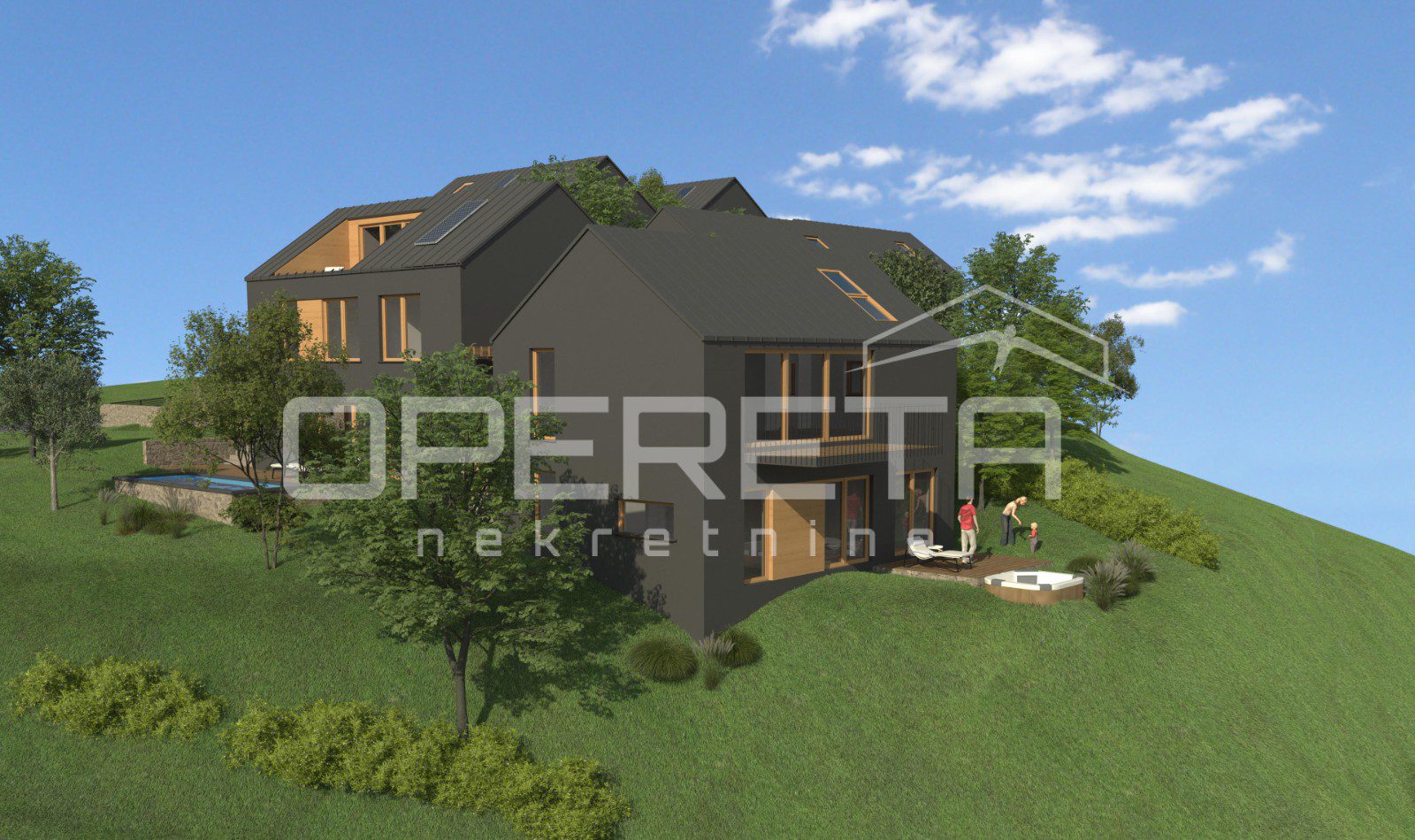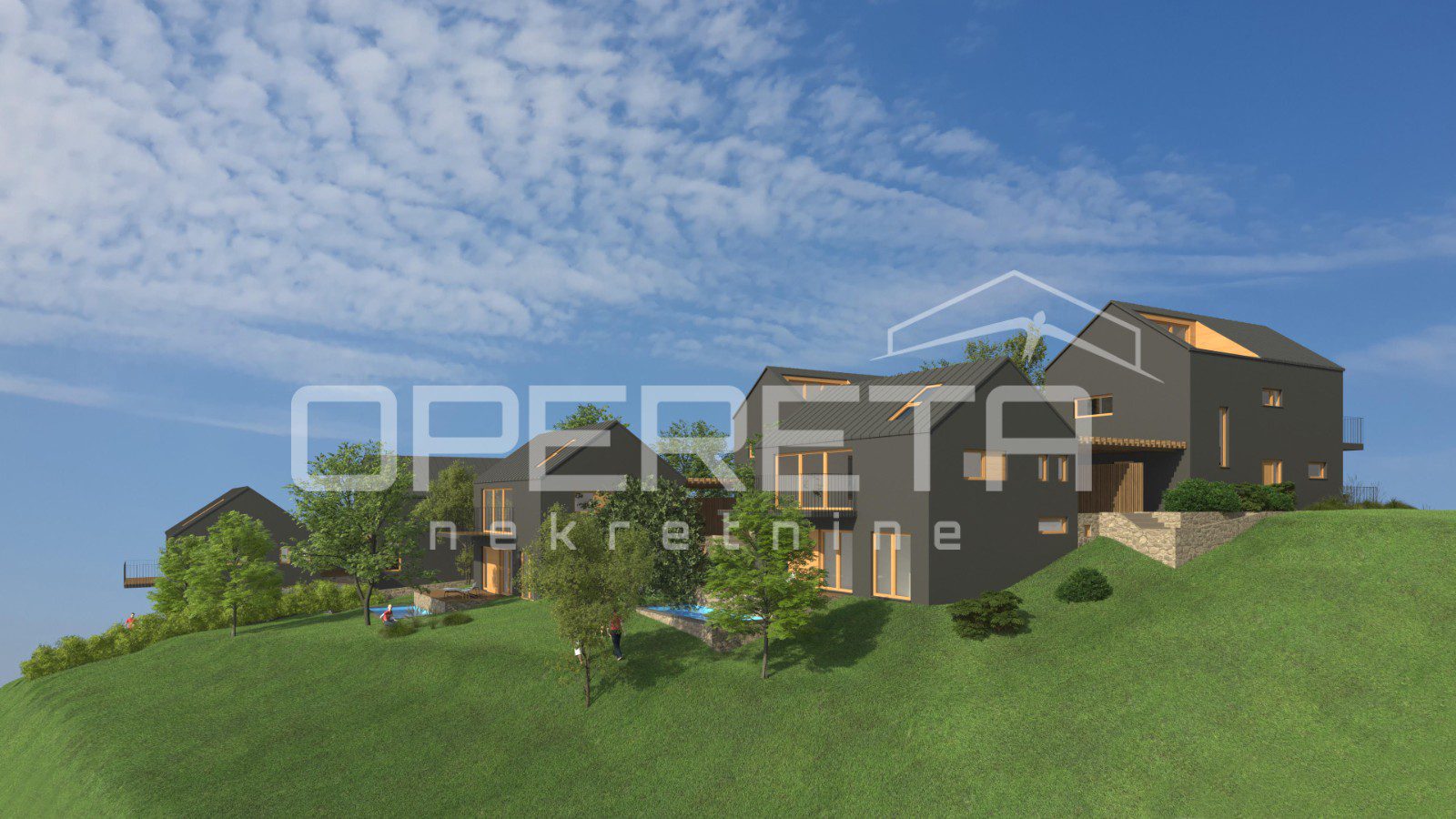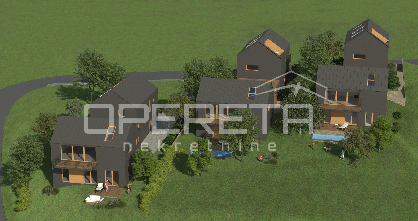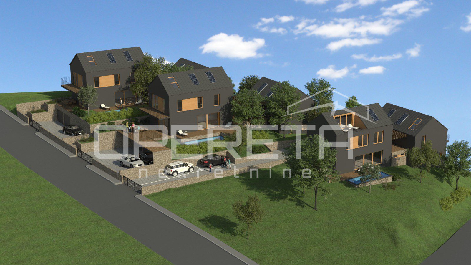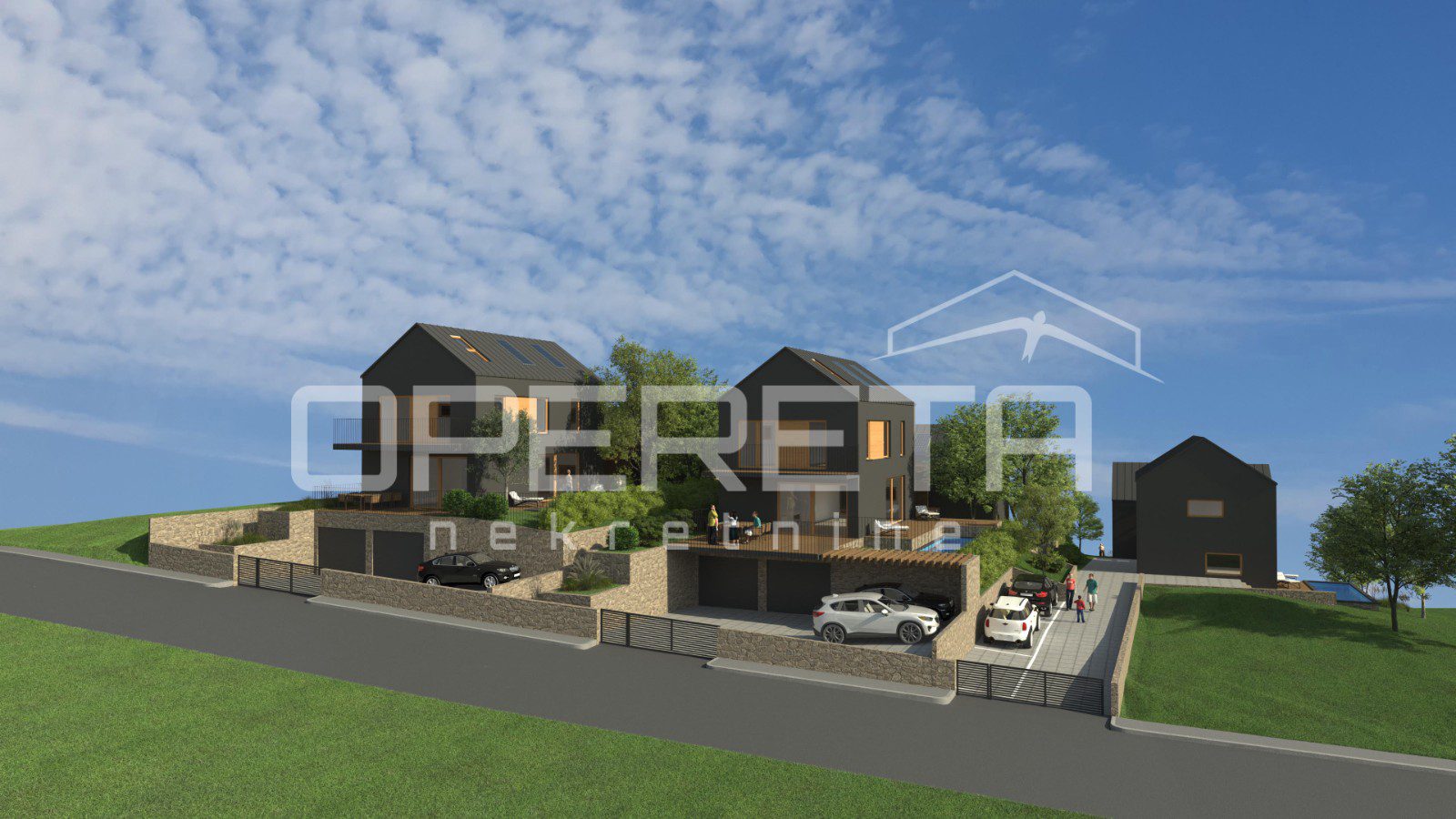 Prodaje se investicijsko zemljište na uzdignutoj lokaciji sa pogledom na Žumberak koje se sastoji od 3 čestica. Za parcele je izdana građevinska dozvola za izgradnju ukupno 6 obiteljskih kuća sa bazenima. Predviđeni energetski certifikat kuća je A+ te su plaćeni komunalni doprinosi. Prema projektu, neto površine kuća su 130 m2, 150m2, dvije kuće po 180 m2 te preostale dvije kuće po 220 m2 sveukupno 1080 m2. Za svaku kuću je predviđeni bazen.