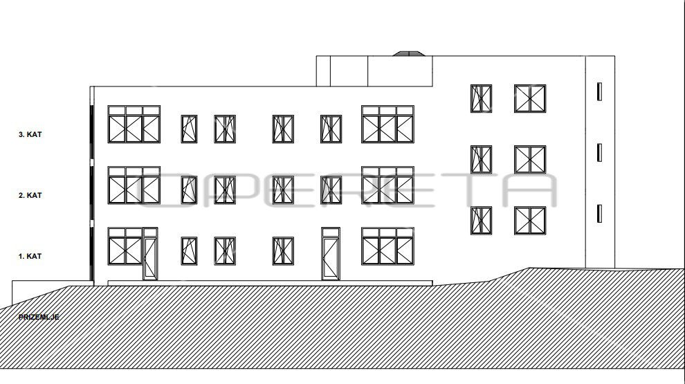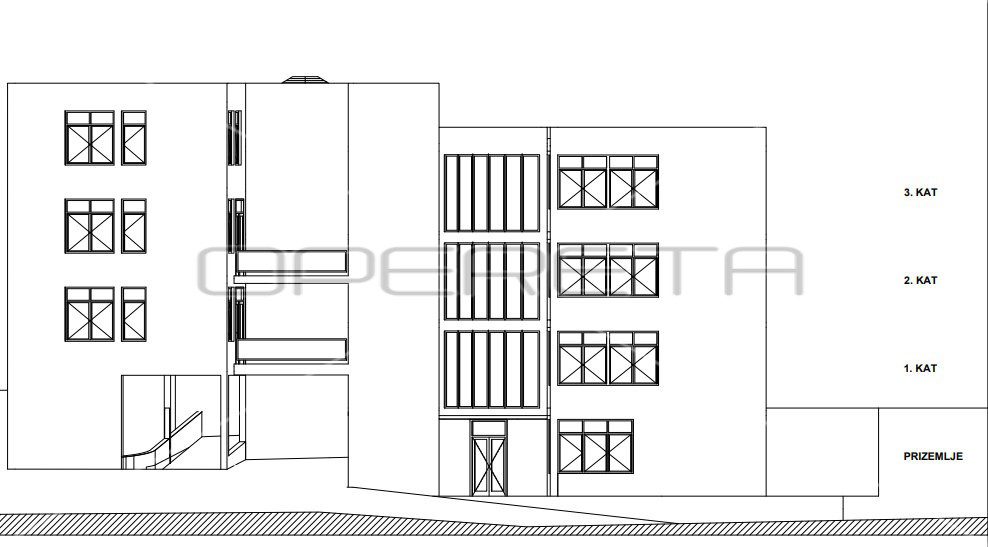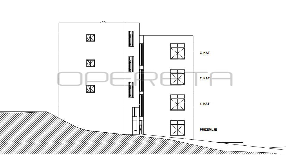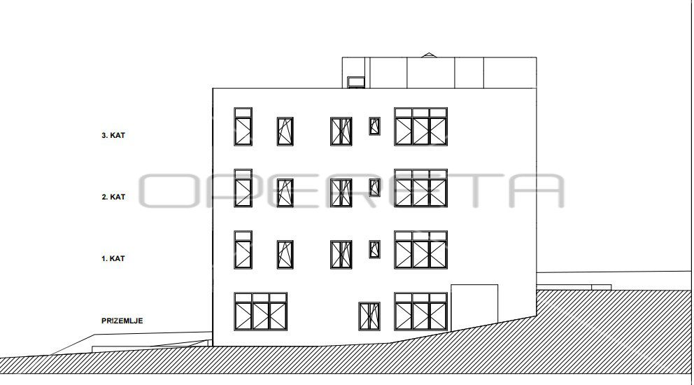 u podrumu organizacija spremišta. U prizemlju se predlaže izgradnja jednog velikog stana kojem je moguće dodijeliti i terase dvorišta. Osim stana u prizemlju se nalazi i hobi prostor za potrebe stanara zgrade u kojem je moguće organizirati igraonice za djecu, praonicu, sobu za sastanke i slično. Na katovima se predlaže izgradnja po četiri stana na etaži. Stanovima na 1. katu koji su sa istočne strane u ravnini terena je moguće dodijeliti vrtove.