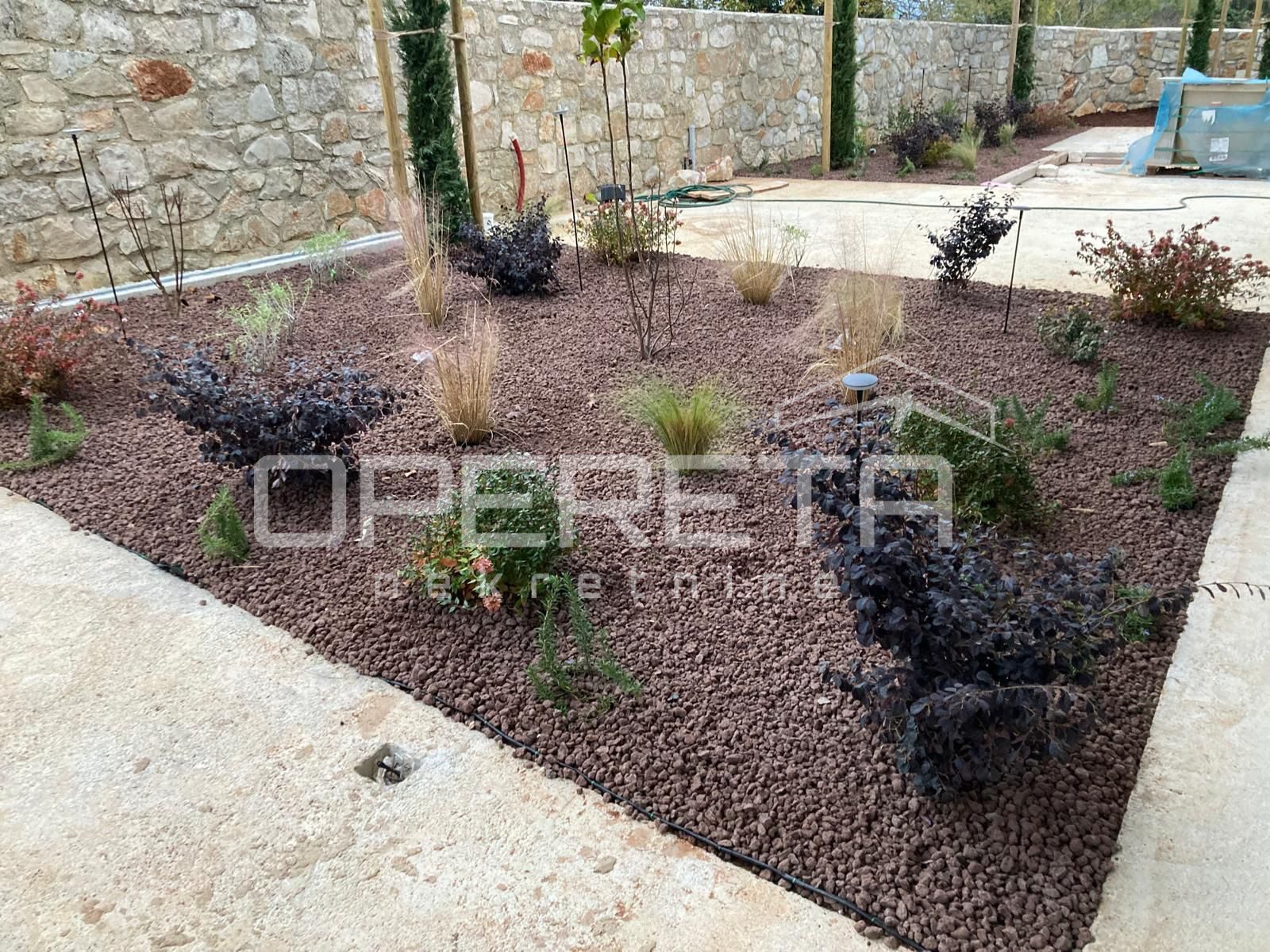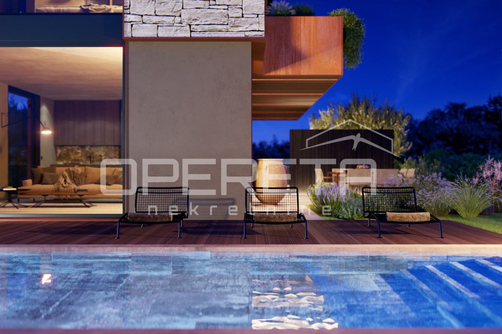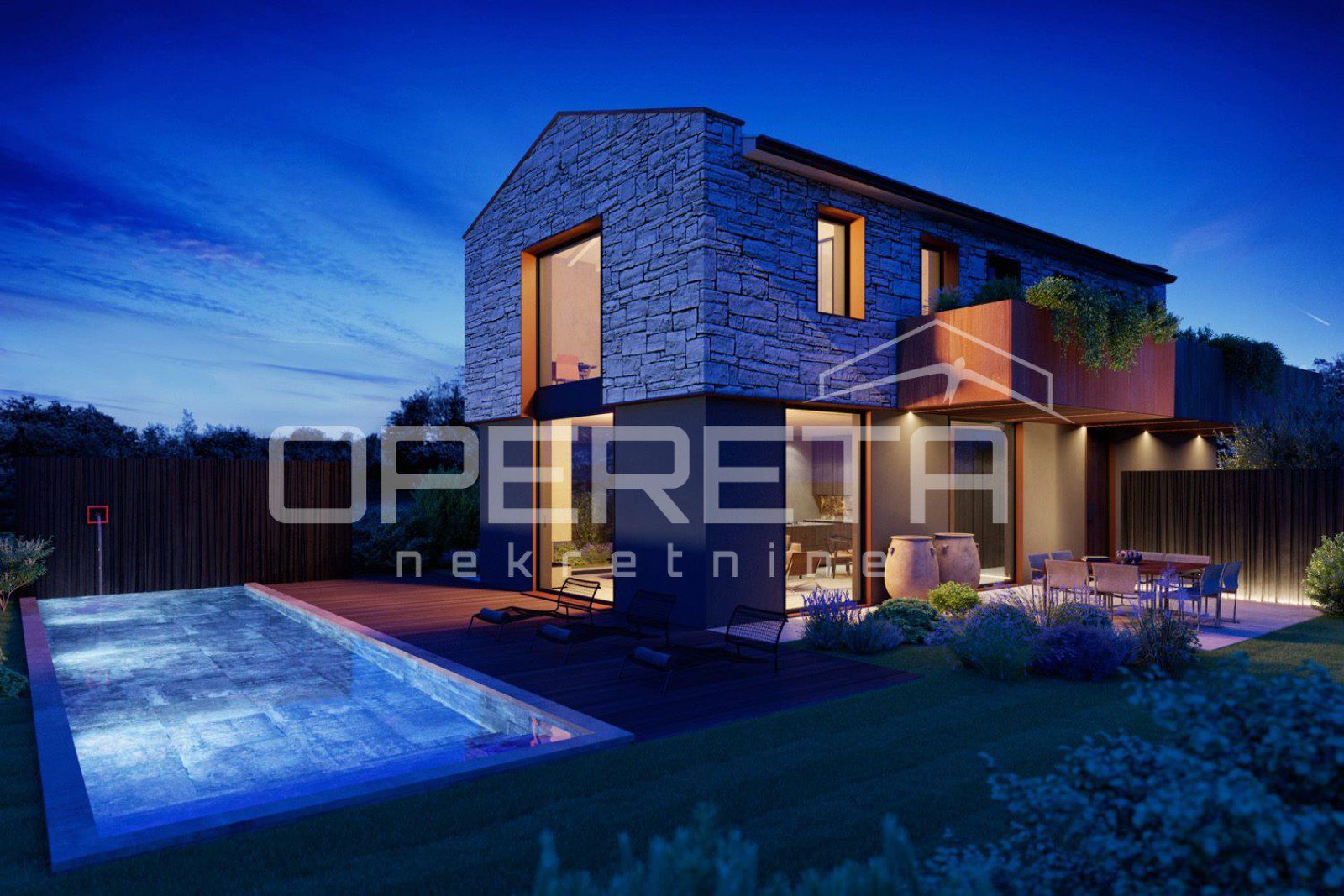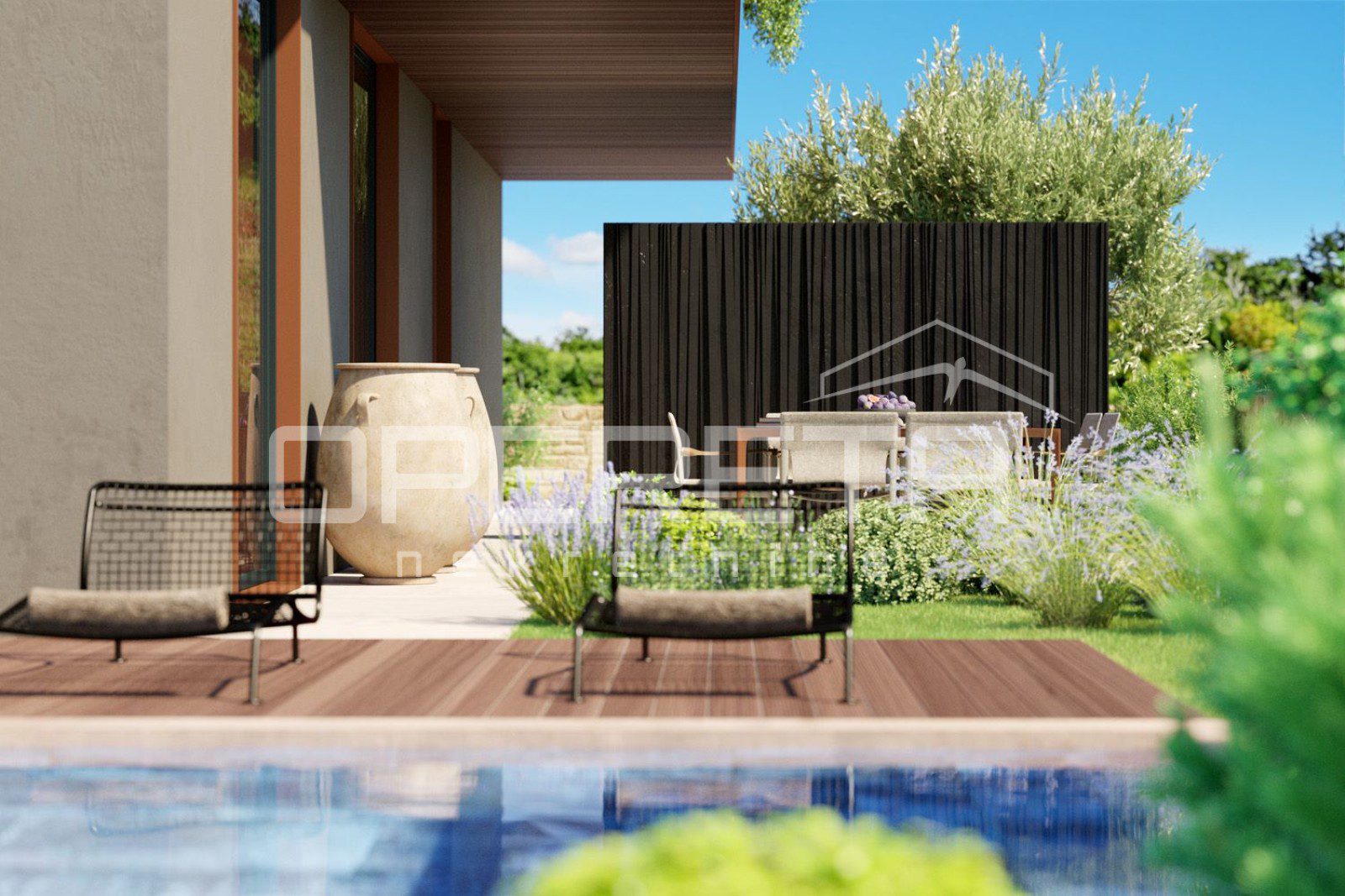 U vanjskom dijelu nalazi se bazen s pripadajućim sunčalištem, vrt te osigurana parkirna mjesta. Okućnica će biti uređena i ograđena, što pruža dodatni osjećaj privatnosti.