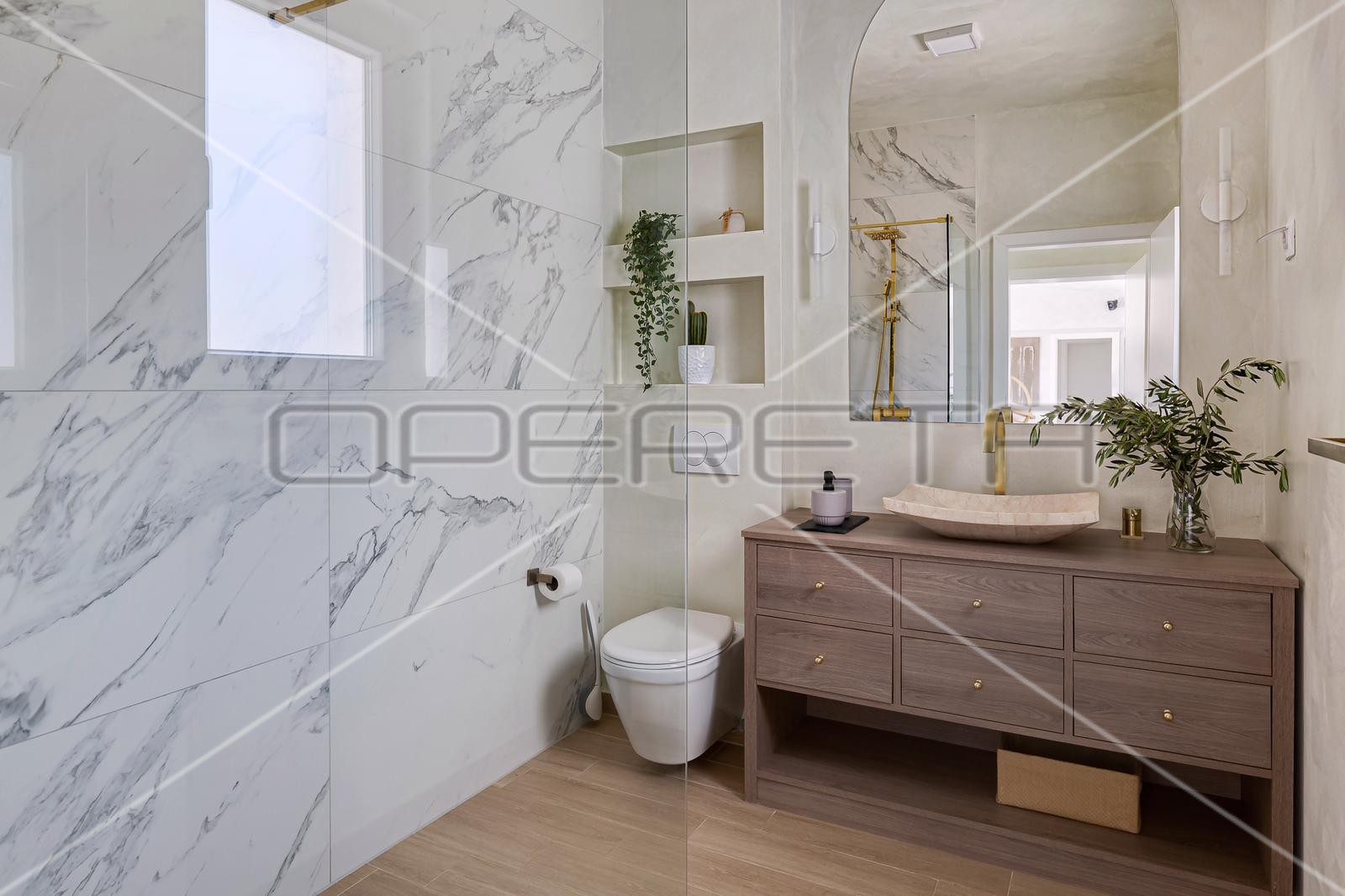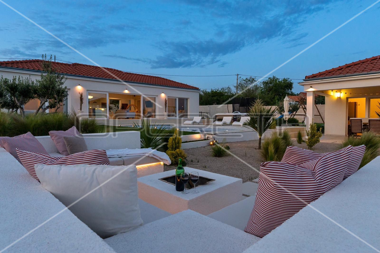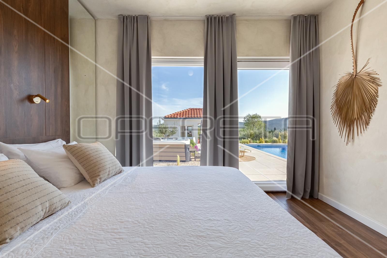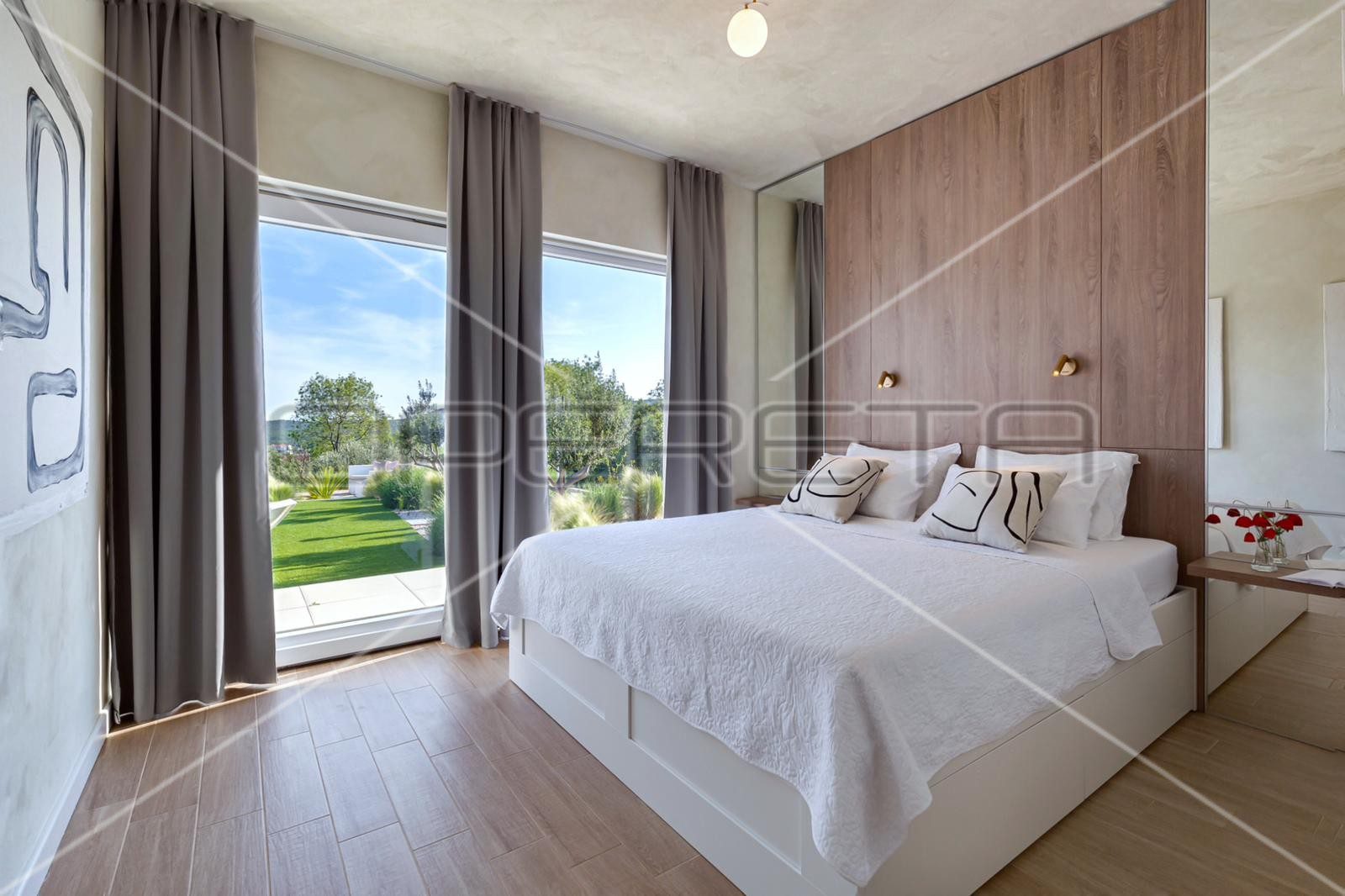 Vila se prostire na prostranom zemljištu od 1034 m², nudeći luksuzni stambeni prostor od 120 m². Elegantno dizajnirani interijer obuhvaća dvije luksuzne spavaće sobe, svaka s vlastitom modernom kupaonicom i direktnim izlazom na terasu. Prostrani dnevni boravak otvorenog koncepta, s velikim staklenim stijenkama i kaminom, povezuje unutarnji i vanjski prostor, pružajući obilje prirodne svjetlosti i osjećaj prostranosti. Kuhinja je opremljena suvremenim uređajima, čime nudi maksimalnu funkcionalnost i udobnost. Sve prostorije su klimatizirane, dok kupaonice imaju podno grijanje za dodatnu razinu luksuza.