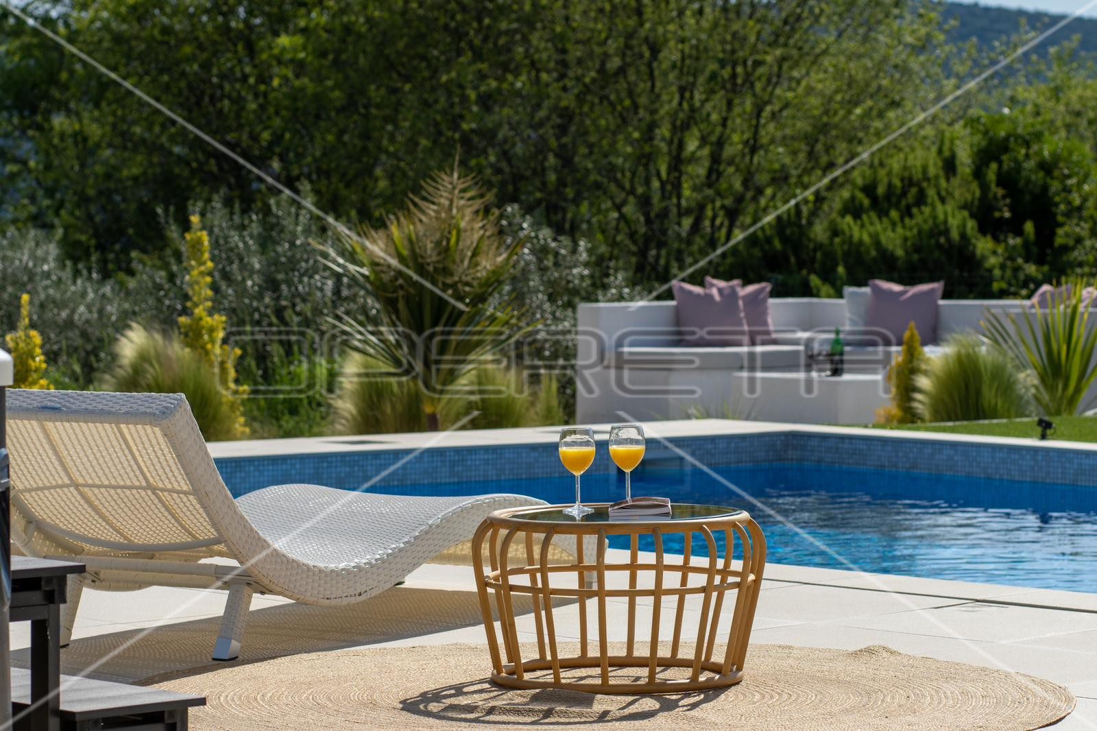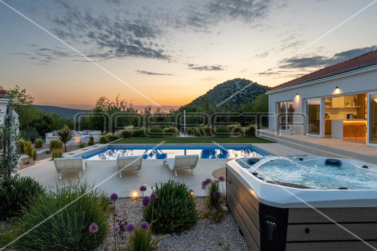 Pažljivo uređena okućnica s bazenom, jacuzzijem i dječjim igralištem stvara idealno mjesto za opuštanje i uživanje na otvorenom. Ljetna kuhinja s roštiljem i natkrivenim prostorom za sjedenje savršena je za društvena okupljanja i obiteljska druženja. Energetska neovisnost vile osigurana je solarnim panelima, što je čini ekološki održivom i ekonomičnom. Kombinacija prirodnog okruženja, luksuznih sadržaja i moderne tehnologije čini ovu vilu atraktivnim izborom za one koji traže mir i udobnost.