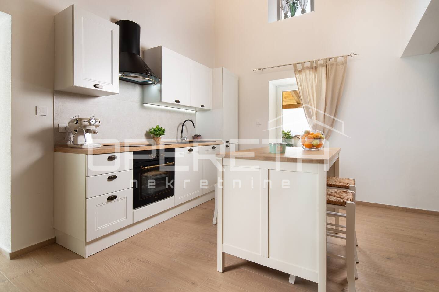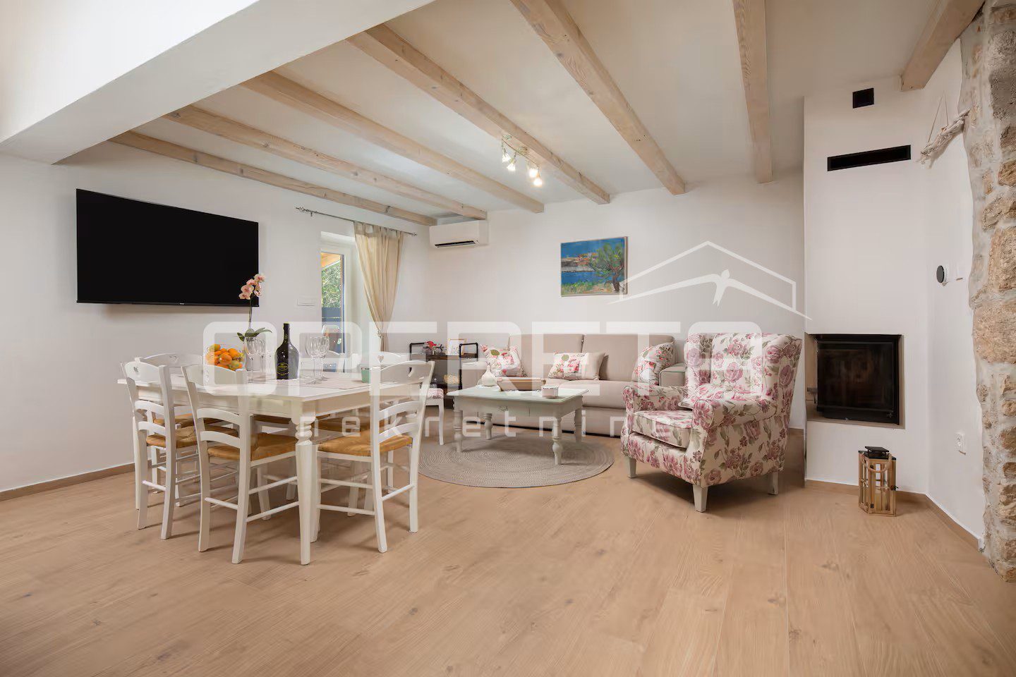 Natkrivena terasa s roštiljem i prostorom za objedovanje na otvorenom savršena je za ljetna druženja, dok autentični detalji poput kamenih zidova, drvenih greda i kamina unose toplinu i karakter u svaki kutak doma.