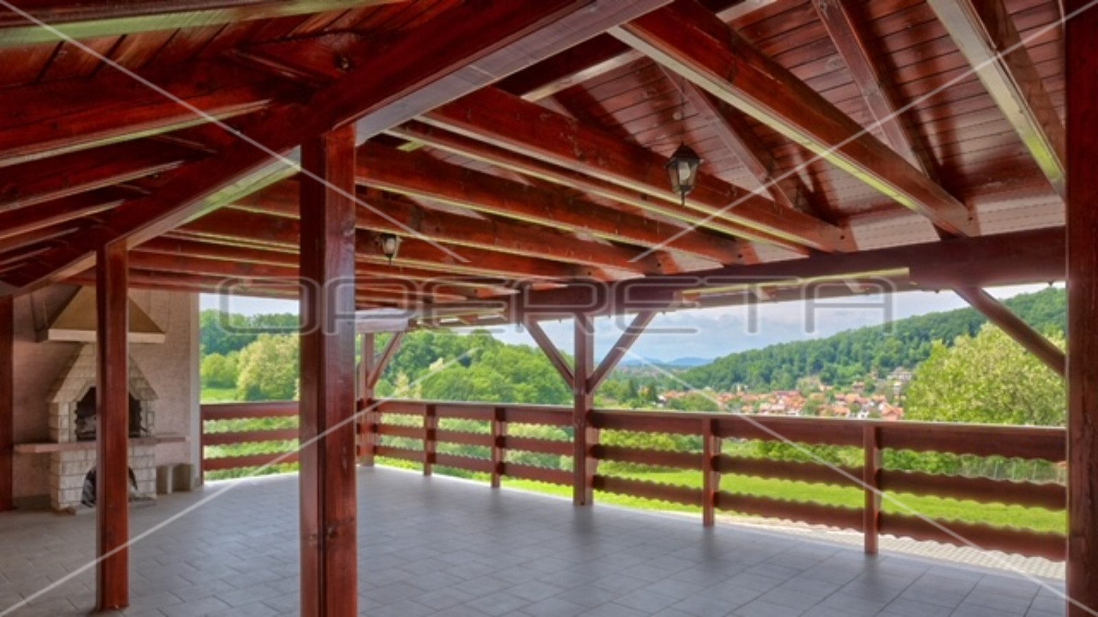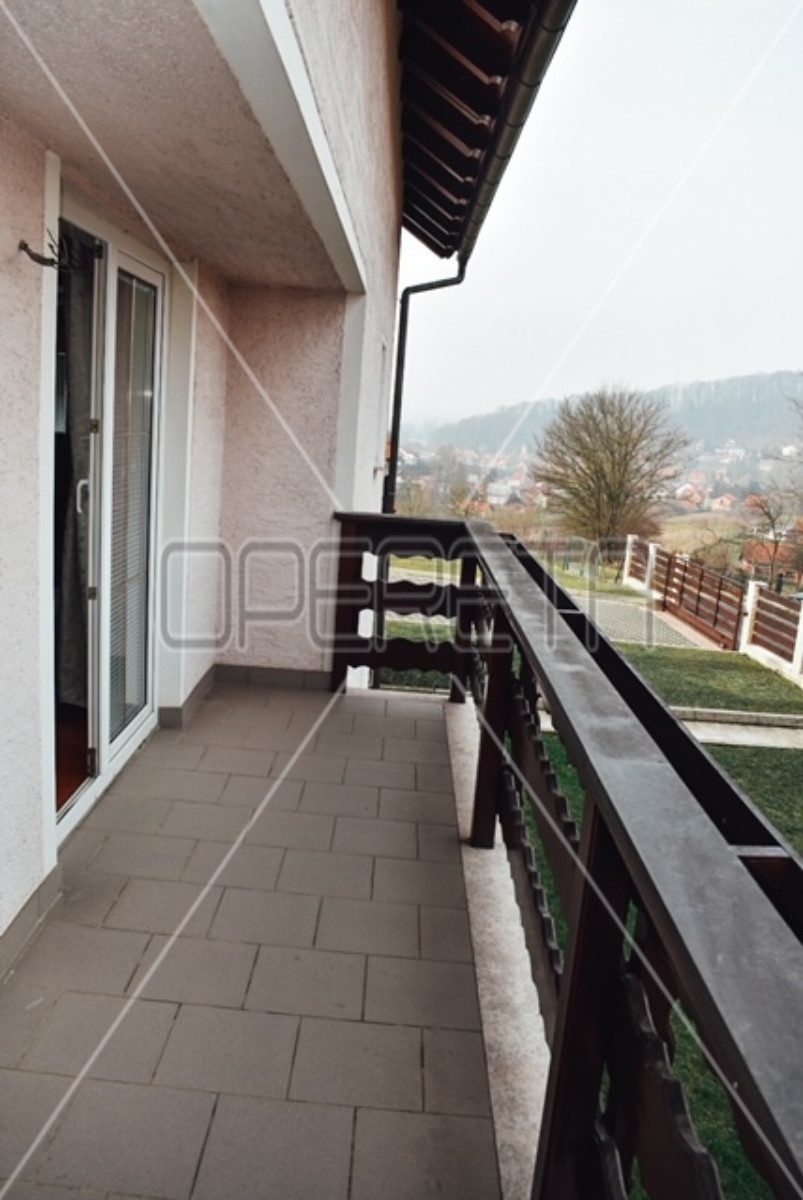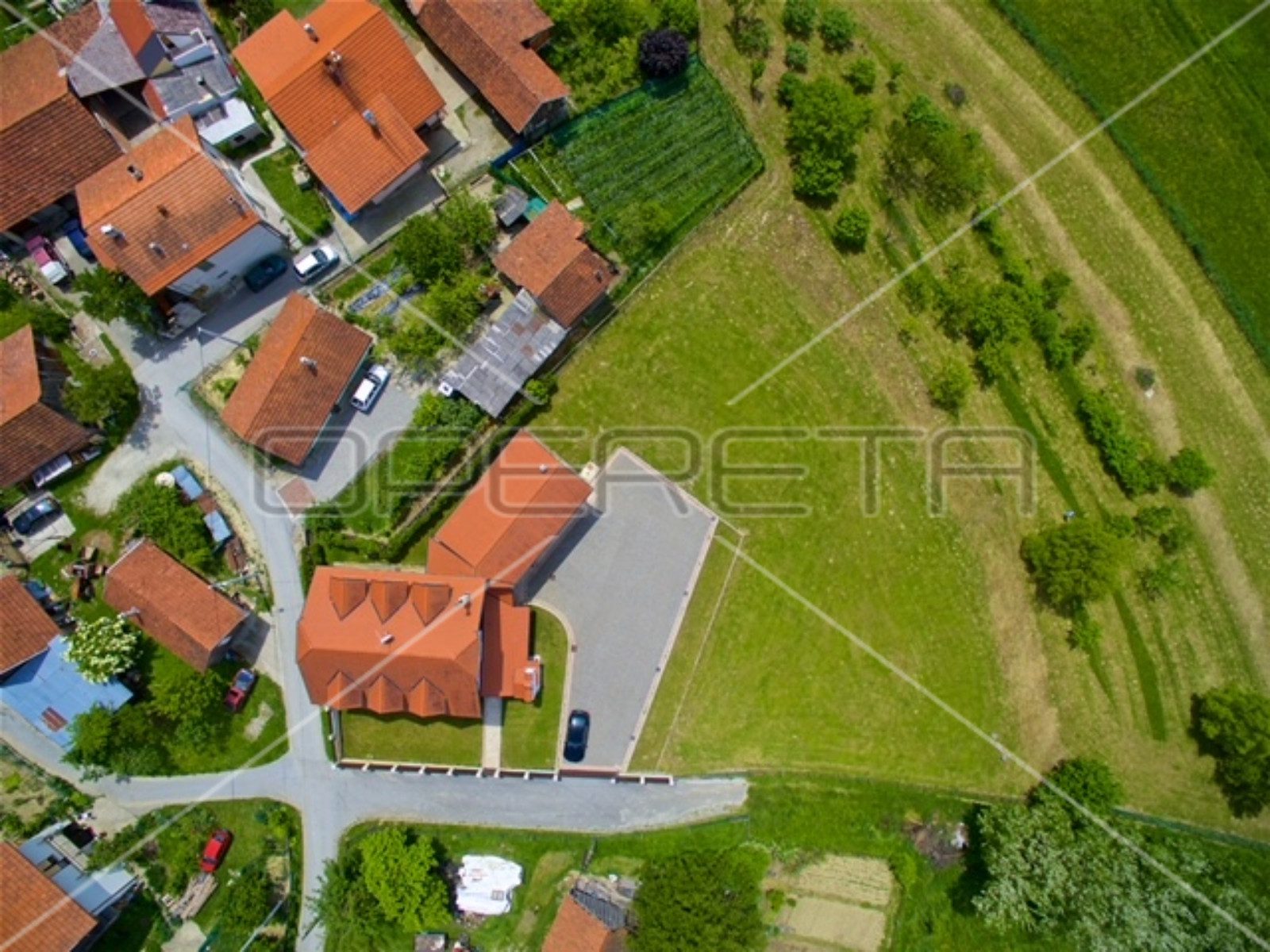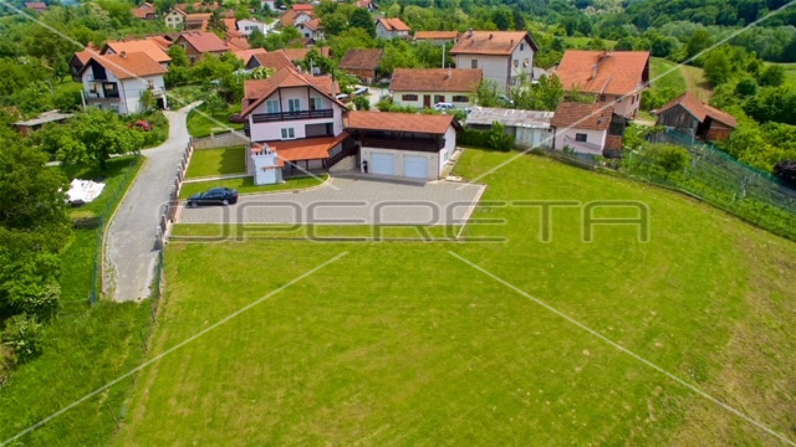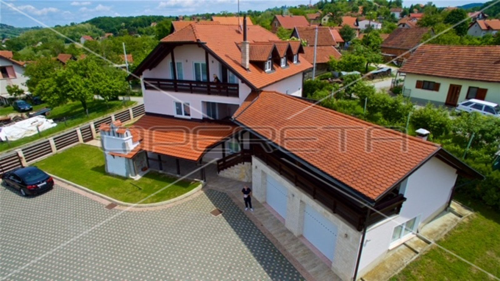 Raskošna kuća na proplanku, prodaje se potpuno opremljena i odlična je prilika za kvalitetan život ili turistički najam. Proteže se na 3 etaže: u prizemlju se nalazi prostorija za druženje na 52m2 s wc-om i izlazom na terasu na kojoj je kamin. Tu je također kotlovnica i dupla garaža. Na 1. katu je open space dnevni boravak s blagovaonicom i kuhinjom, jedna soba, kupaonica s tuš kabinom i wc-om i 124 m2 natkrivene terase. Na 2. katu je 5 soba i kupaonica s kutnom kadom i wc-om, a sobe imaju izlaze na balkone. Prekrasna priroda podno Medvednice, kući pripada voćnjak i 11.000 m2 građevinskog zemljišta. Na minutu od Termi Jezerčica i Stubičkih toplica, nešto više od pola sata od Zagreba,