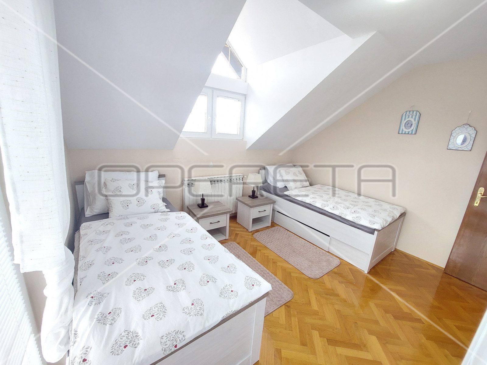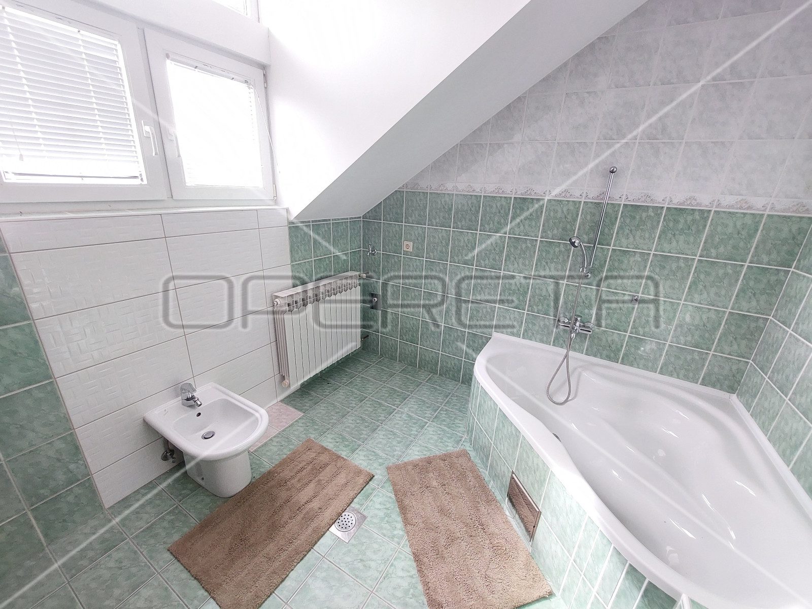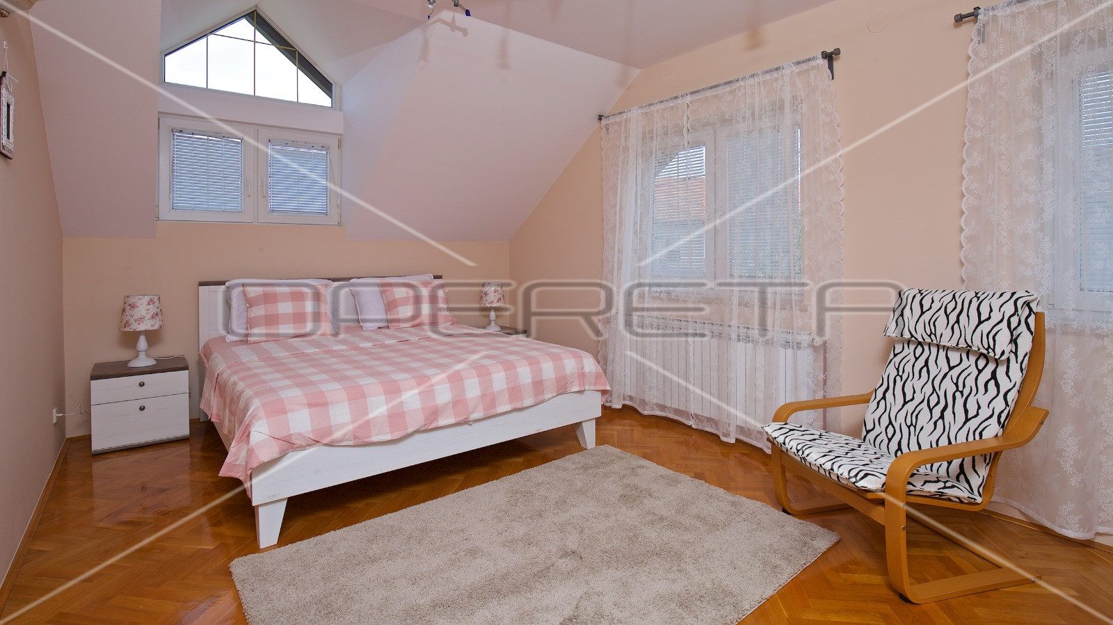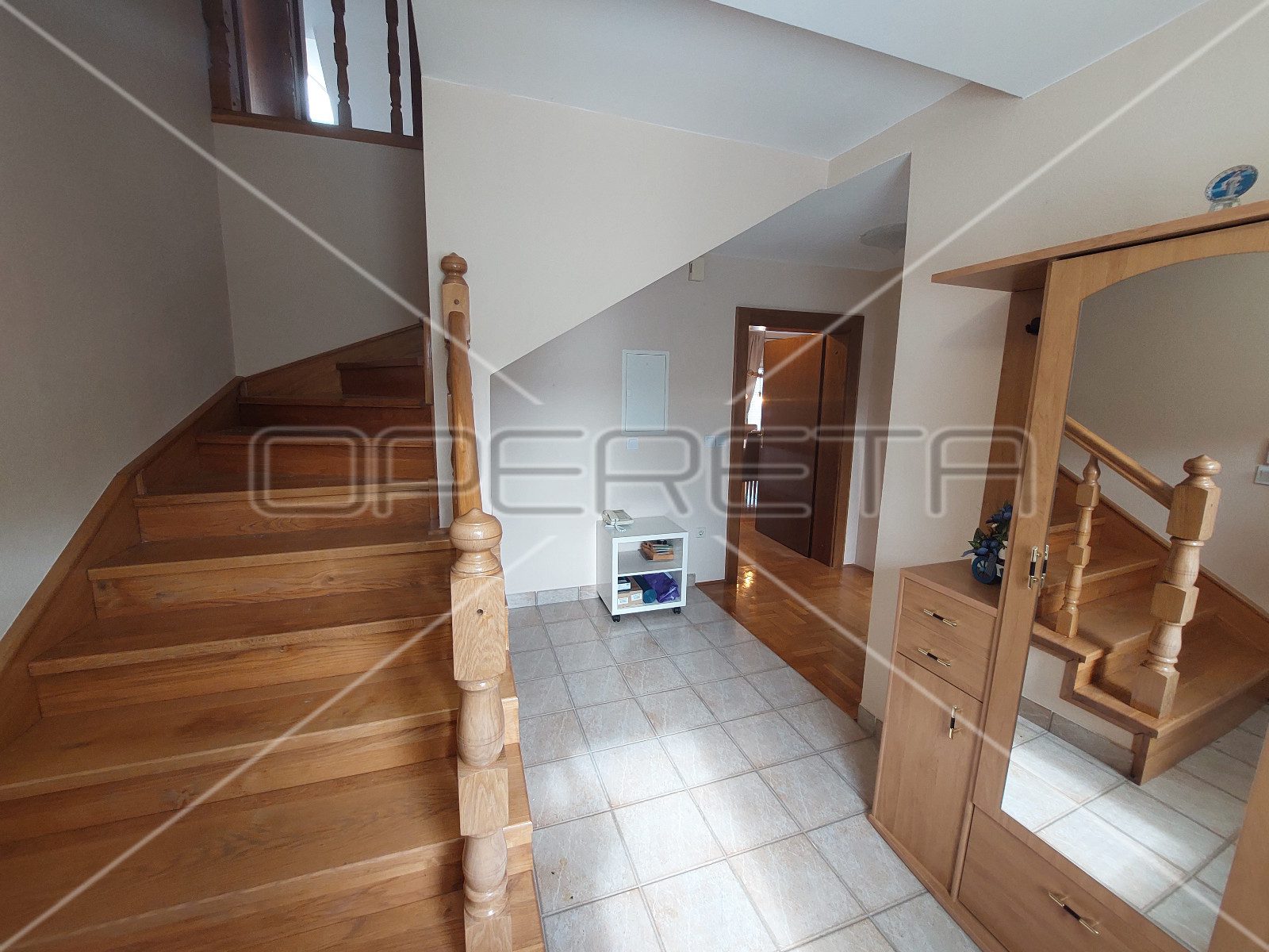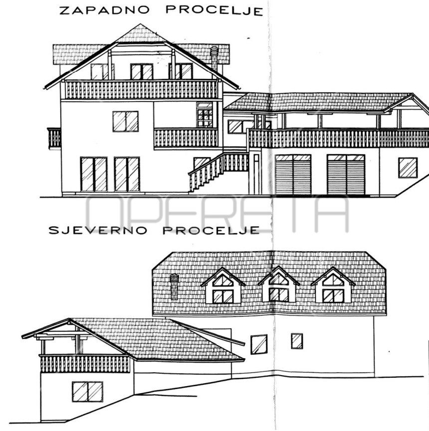 Raskošna kuća na proplanku, prodaje se potpuno opremljena i odlična je prilika za kvalitetan život ili turistički najam. Proteže se na 3 etaže: u prizemlju se nalazi prostorija za druženje na 52m2 s wc-om i izlazom na terasu na kojoj je kamin. Tu je također kotlovnica i dupla garaža. Na 1. katu je open space dnevni boravak s blagovaonicom i kuhinjom, jedna soba, kupaonica s tuš kabinom i wc-om i 124 m2 natkrivene terase. Na 2. katu je 5 soba i kupaonica s kutnom kadom i wc-om, a sobe imaju izlaze na balkone. Prekrasna priroda podno Medvednice, kući pripada voćnjak i 11.000 m2 građevinskog zemljišta. Na minutu od Termi Jezerčica i Stubičkih toplica, nešto više od pola sata od Zagreba,