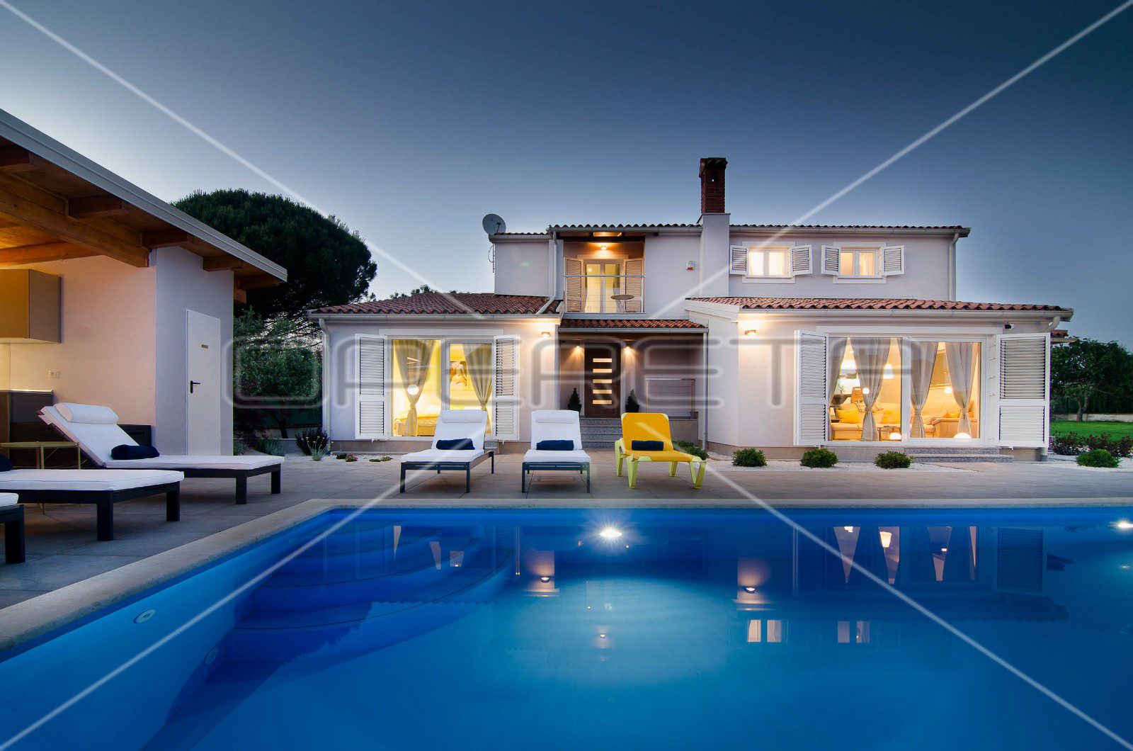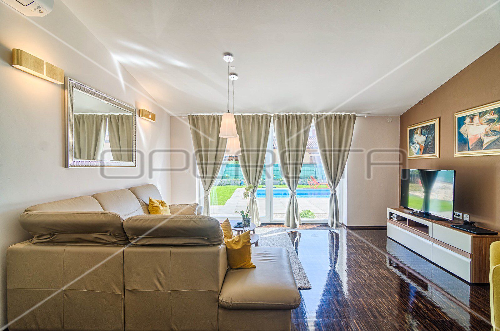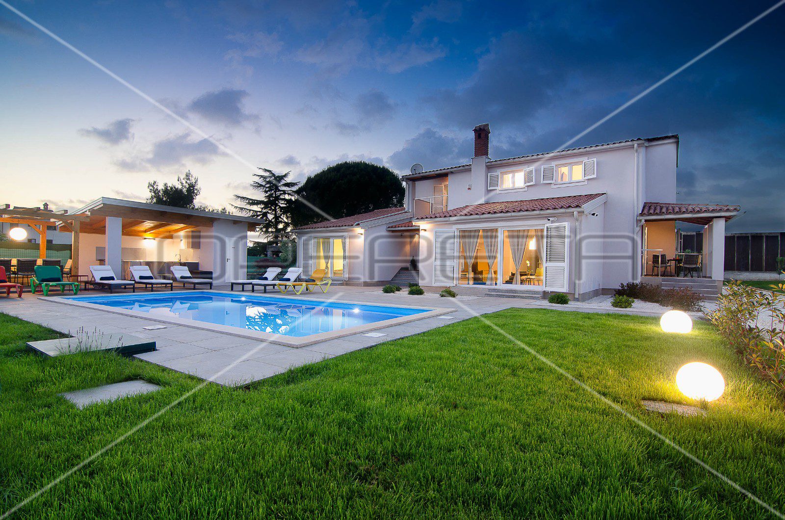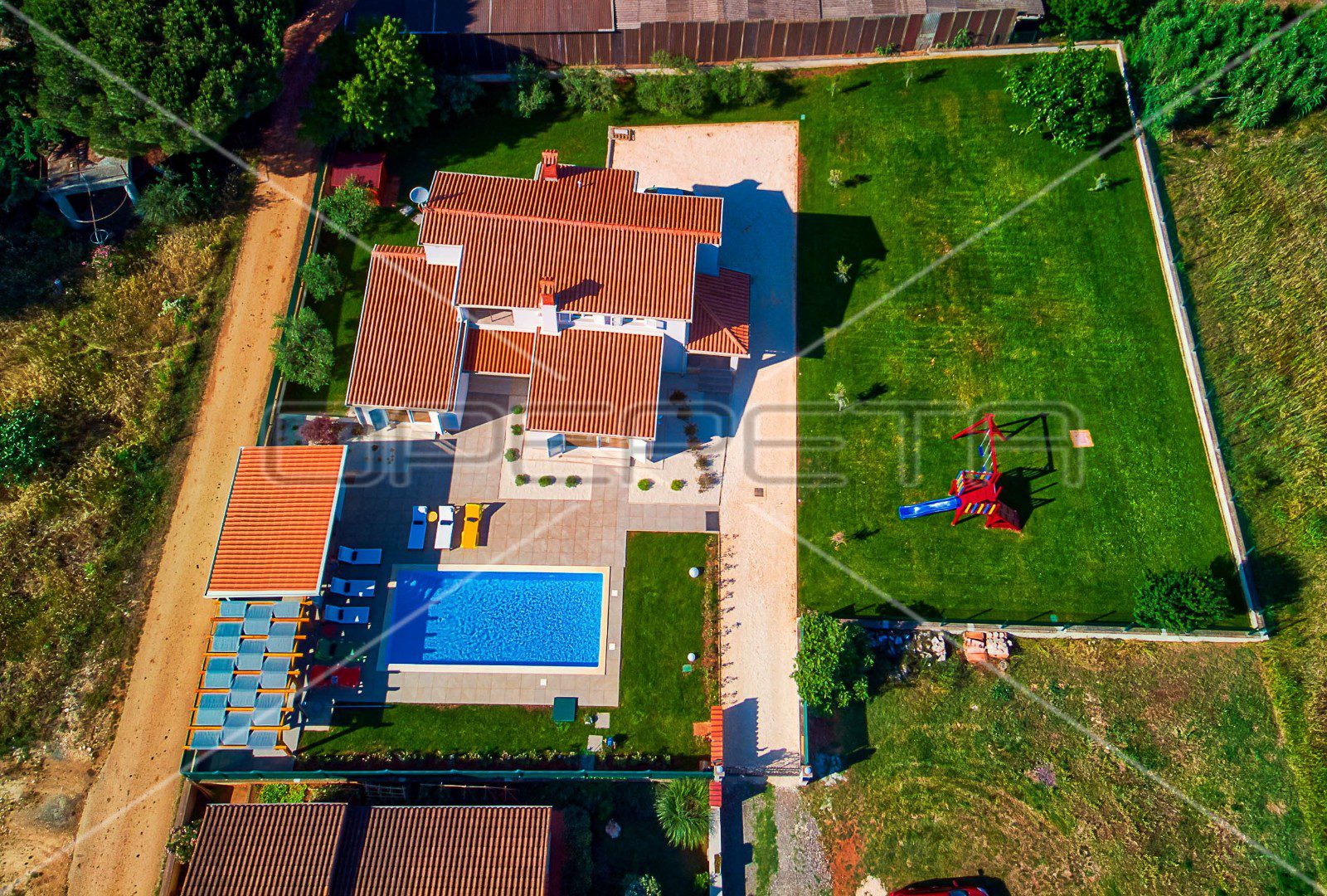 Vanjski dio čine prekrasan, prostran vrt sa sistemom automatskog navodnjavanja, grijani bazen površine 36 m2, natkrivena ljetna kuhinja, dodatan toalet, dječje igralište..