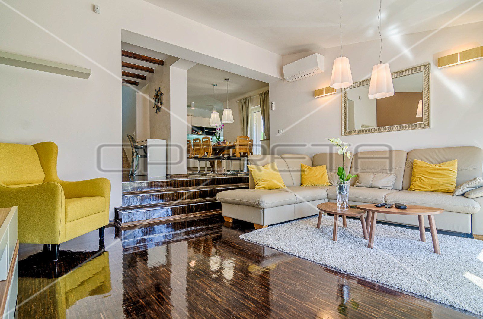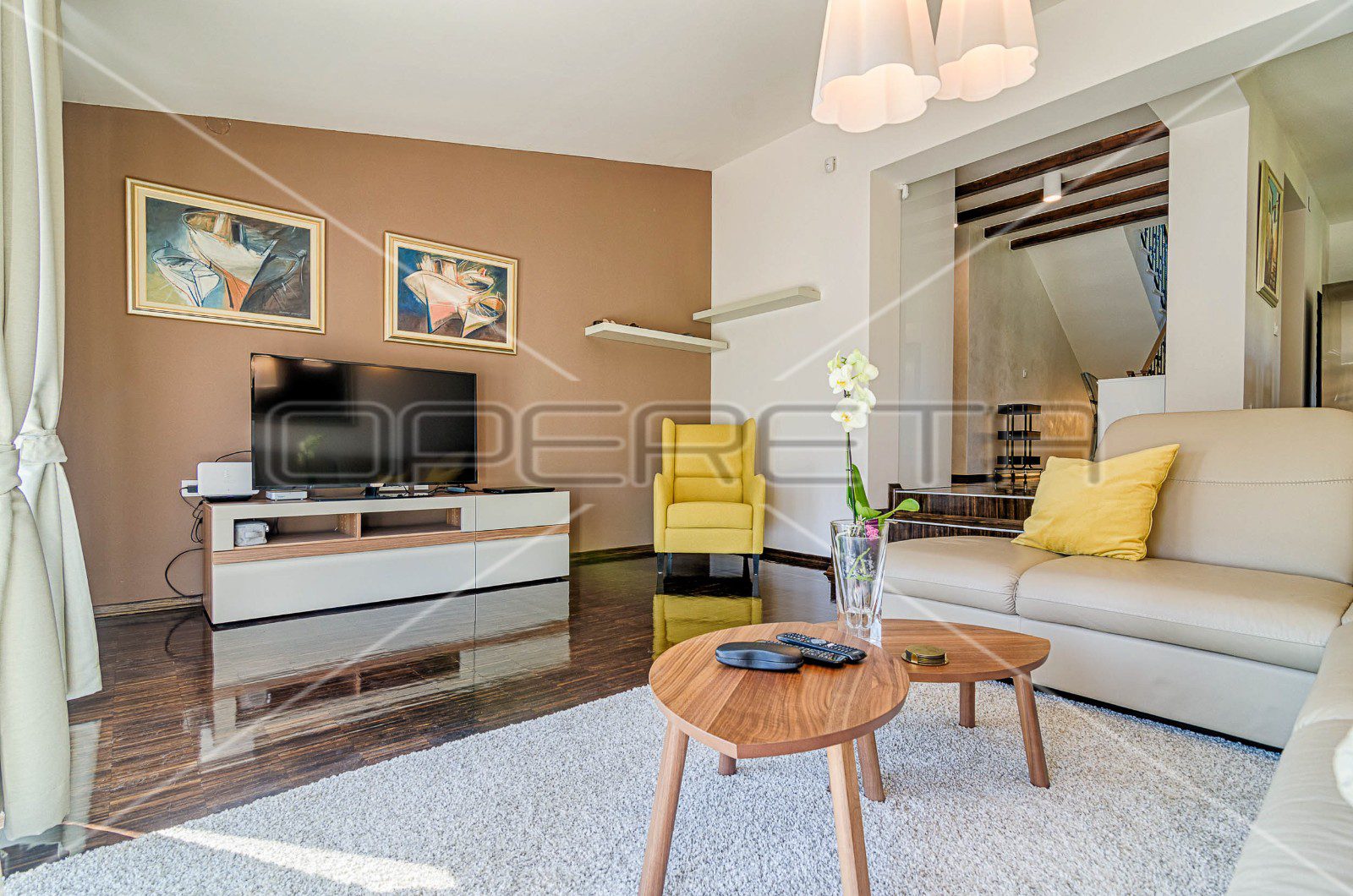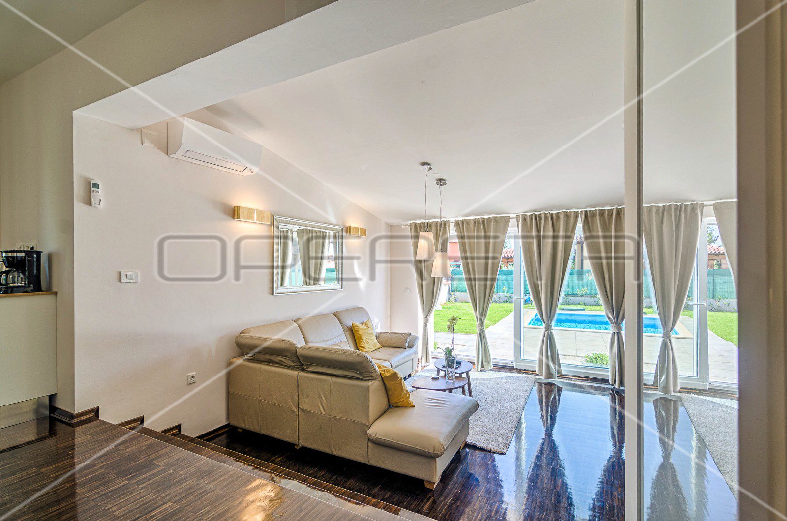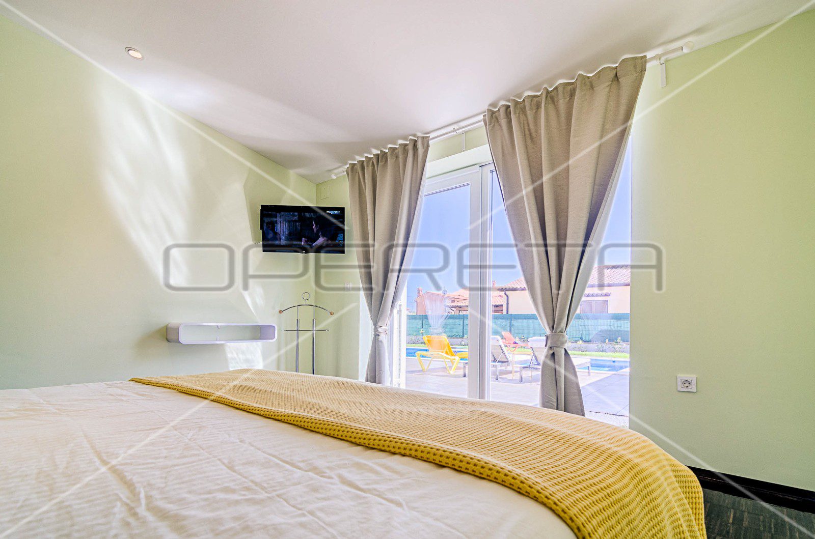 Vanjski dio čine prekrasan, prostran vrt sa sistemom automatskog navodnjavanja, grijani bazen površine 36 m2, natkrivena ljetna kuhinja, dodatan toalet, dječje igralište..