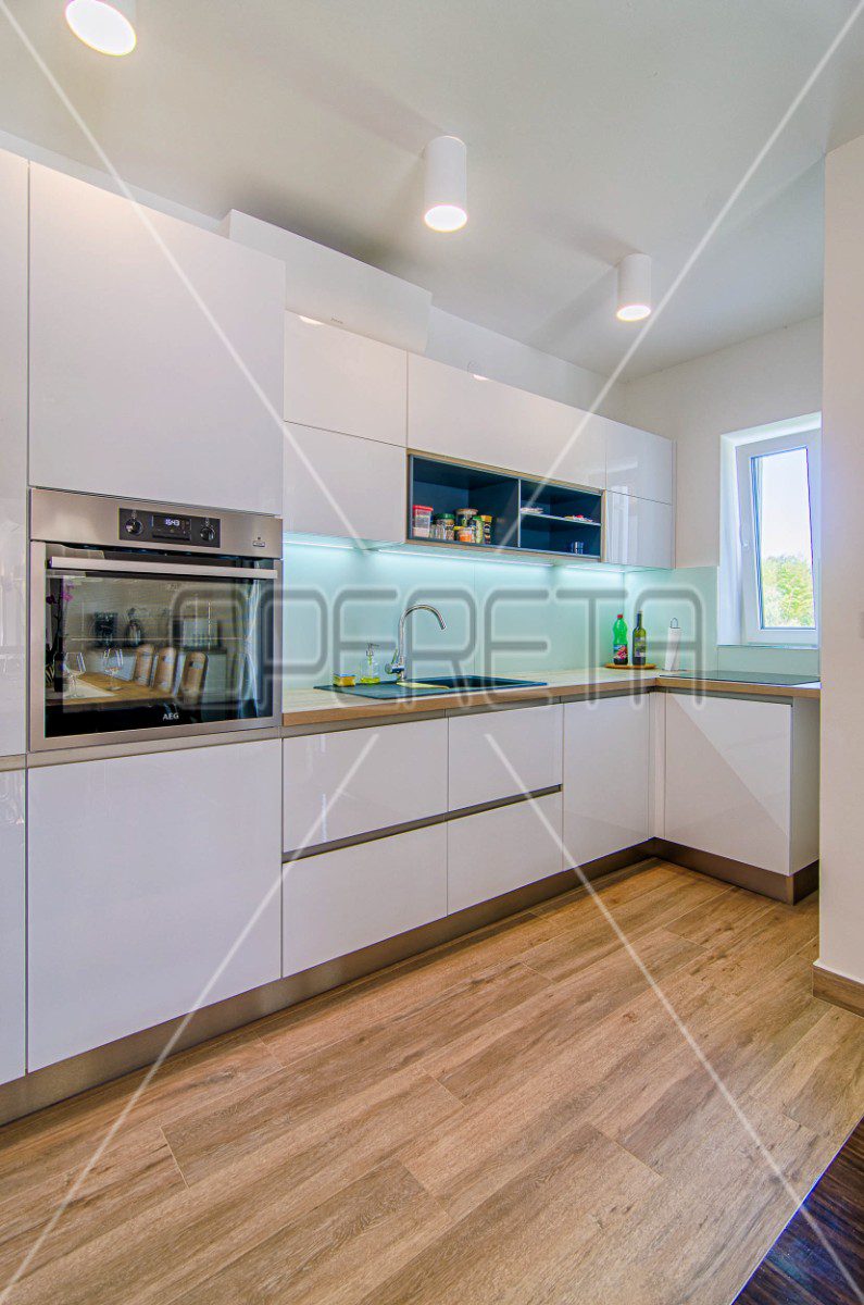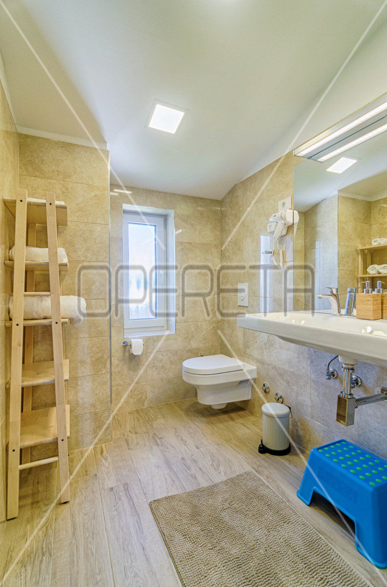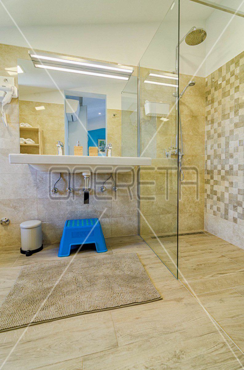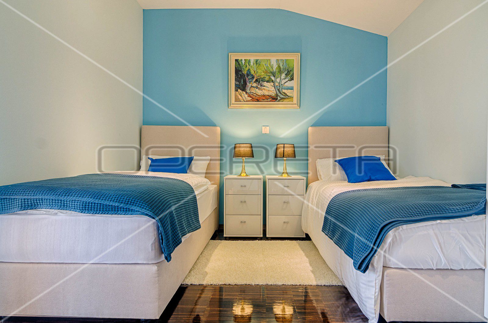 U suterenu se smjestila tehnička soba, sauna i dodatan prostor koji se može koristiti prema vlastitim željama. U prizemlju se nalaze dvije spavaće sobe svaka s vlastitom kupaonicom od kojih jedna ima lijep pogled prema plaži i bazenu, gostinjski wc, predprostor, kuhinja s blagovaonicom i dnevni boravak. Dnevni boravak ima pristup bazenu, dok se iz kuhinje i blagovaonice izlazi na natkrivenu terasu sa pogledom na vrt.