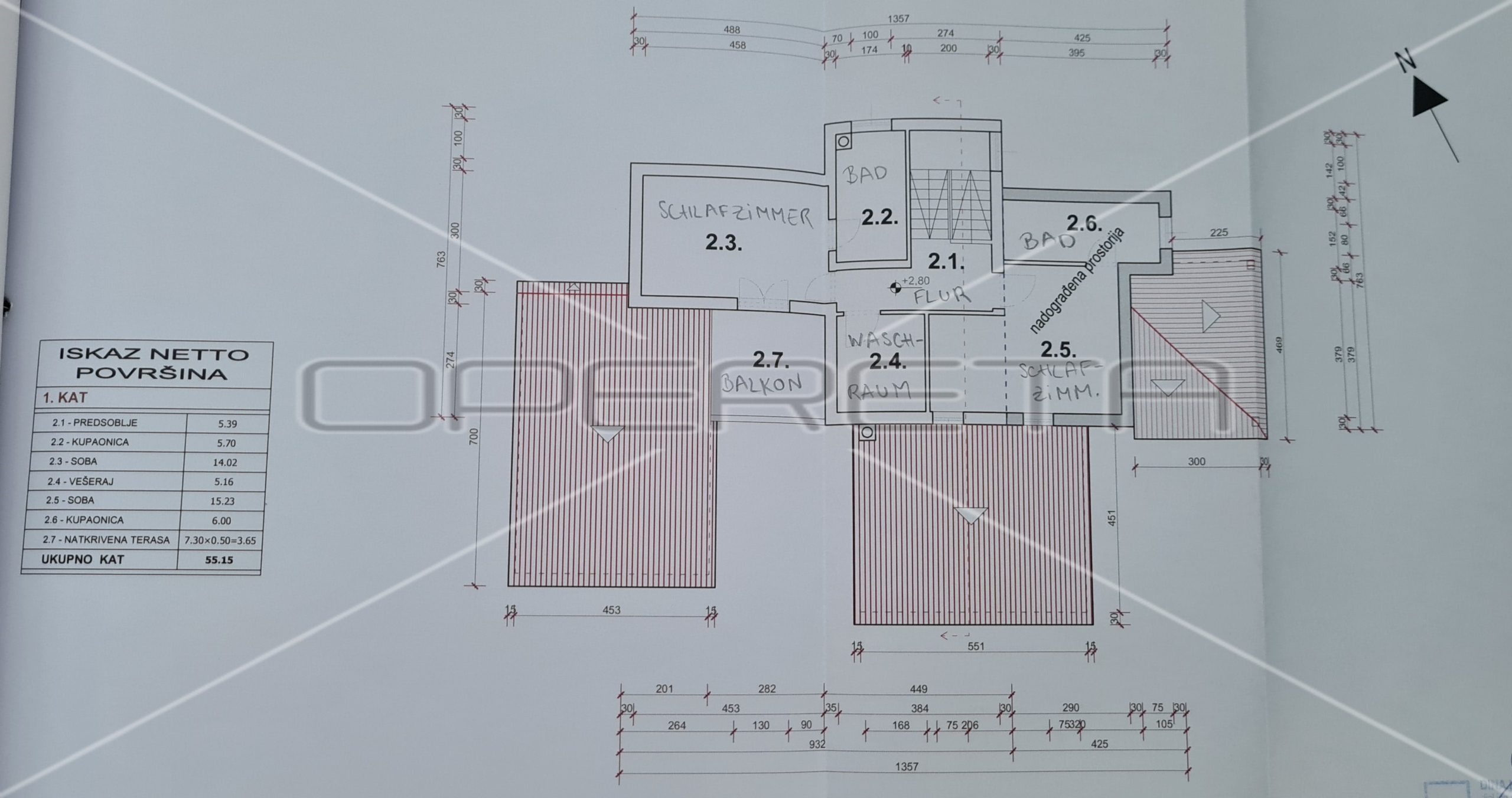 Na katu se nalaze dvije spavaće dvije spavaće sobe, svaka sa svojom kupaonicom, vešeraj. Jedna od soba ima i vlastitu natkrivenu terasom s pogledom na bazen.