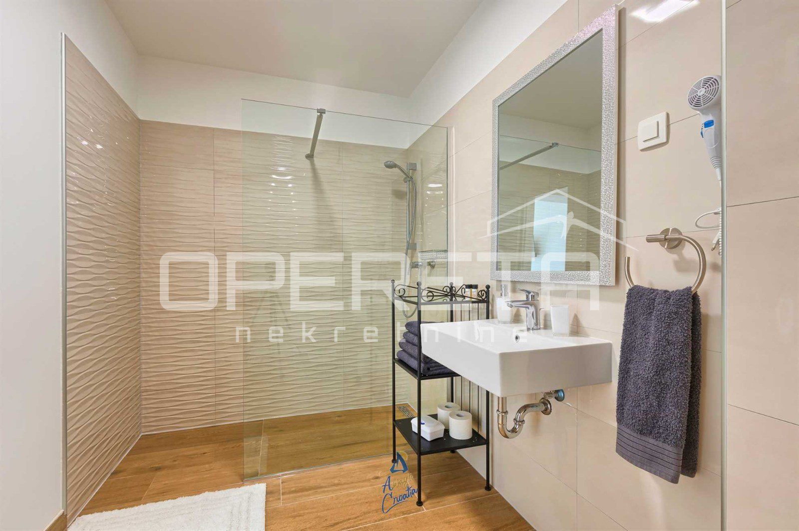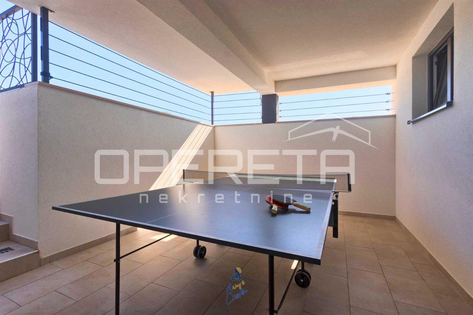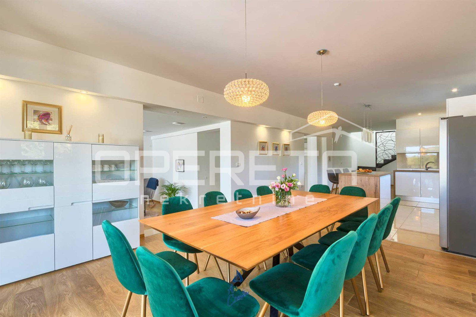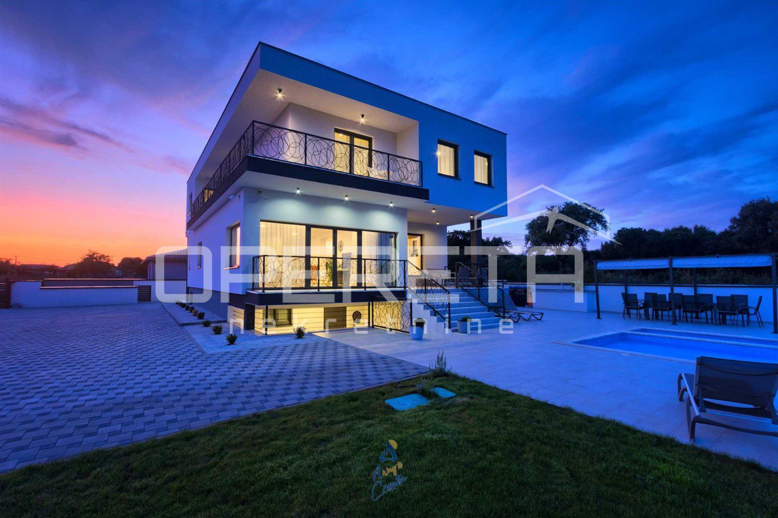 Na predivnoj okućnici nalazi se travnjak sa sistemom automatskog navodnjavanja, 10 maslina, bazen površine 64 m², prostrano sunčalište s vanjskim tušem, prostor za druženje i objed sa kaminom.
