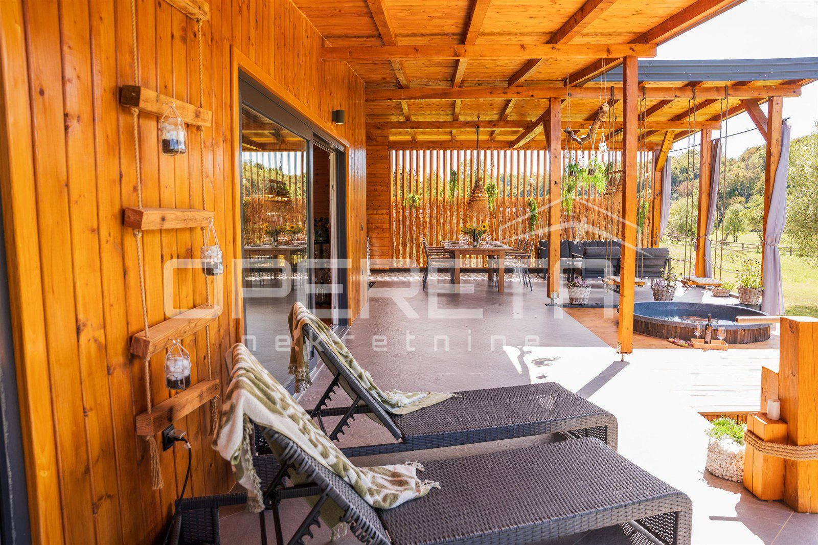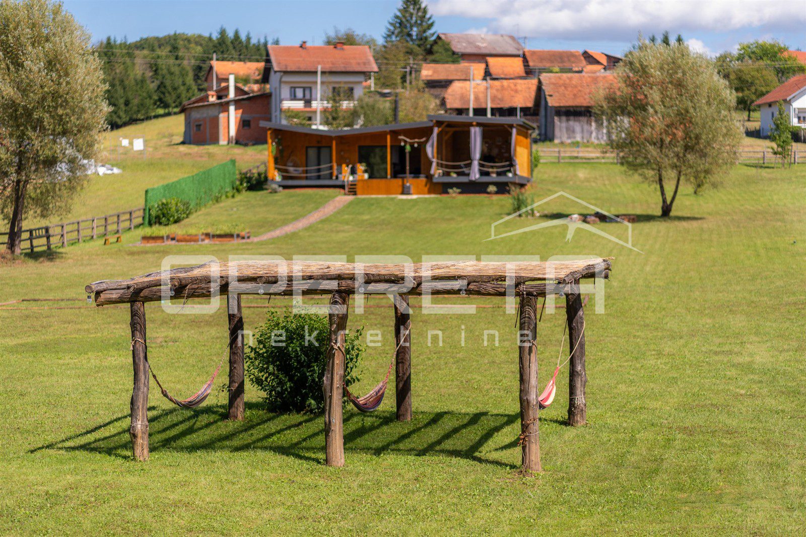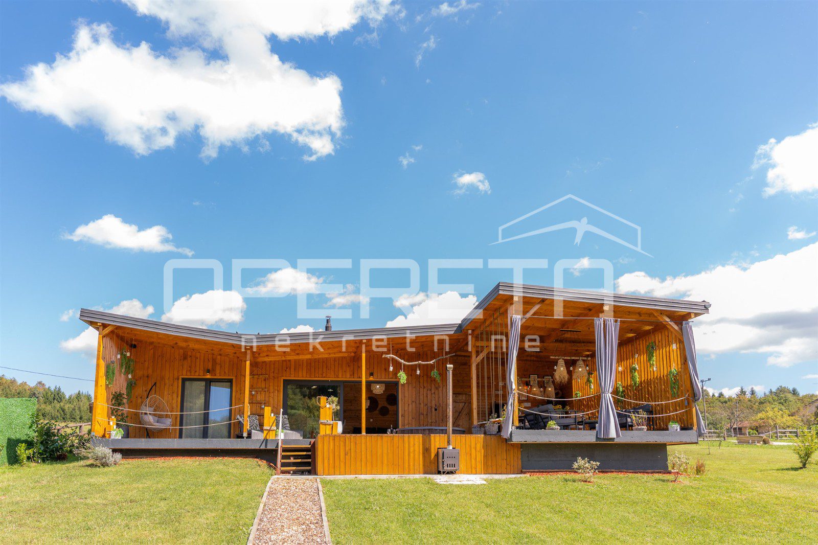 Središnji dio imanja čini luksuzna drvena kuća, novogradnja površine 138m2, izgrađena i opremljena bez kompromisa. Nekretnina ima čisto vlasništvo, uporabnu dozvolu i riješenje o kategorizaciji, te se prodaje u potpunosti namještena i opremljena, spremna za trenutačno korištenje ili turistički najam.