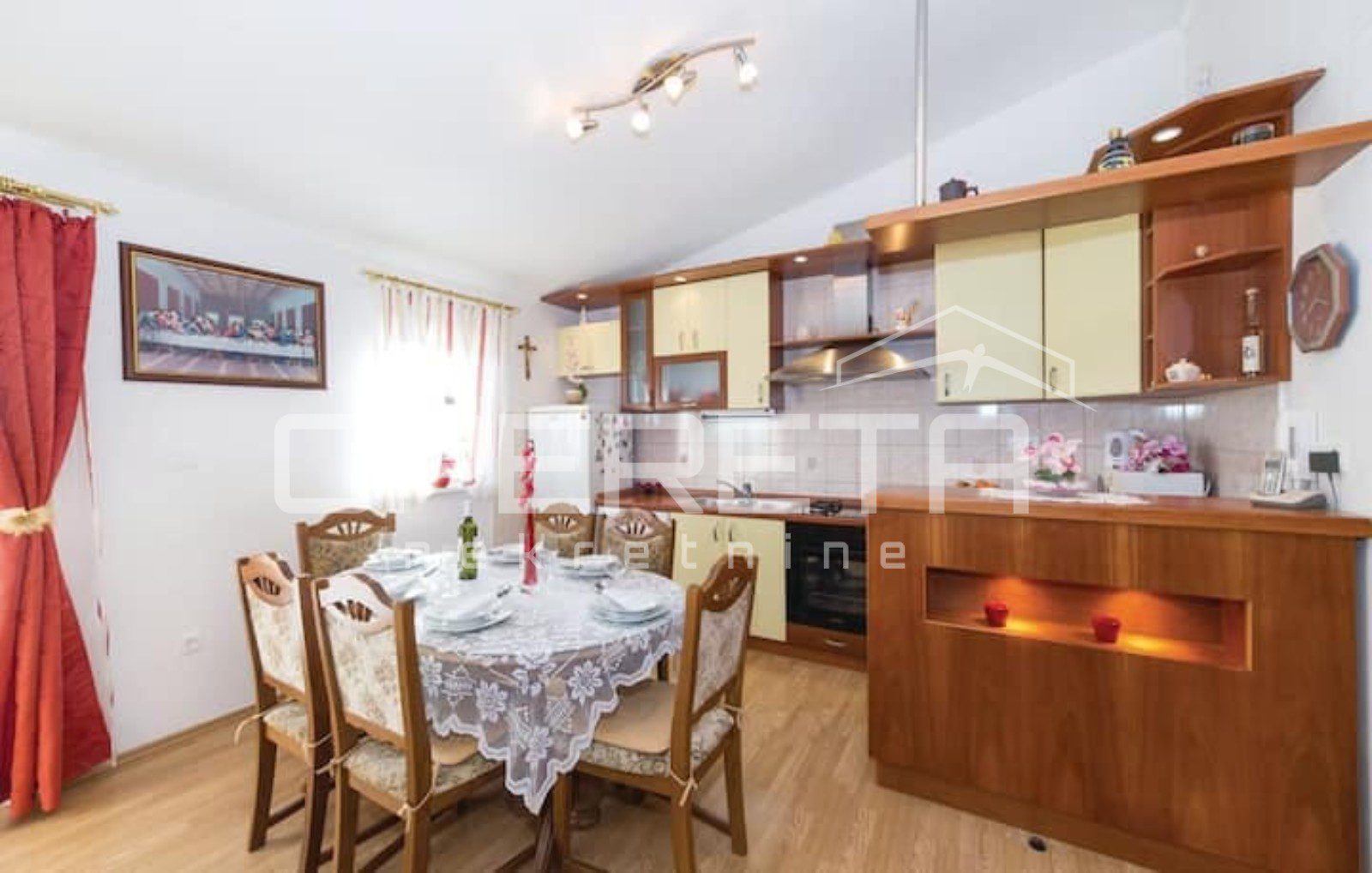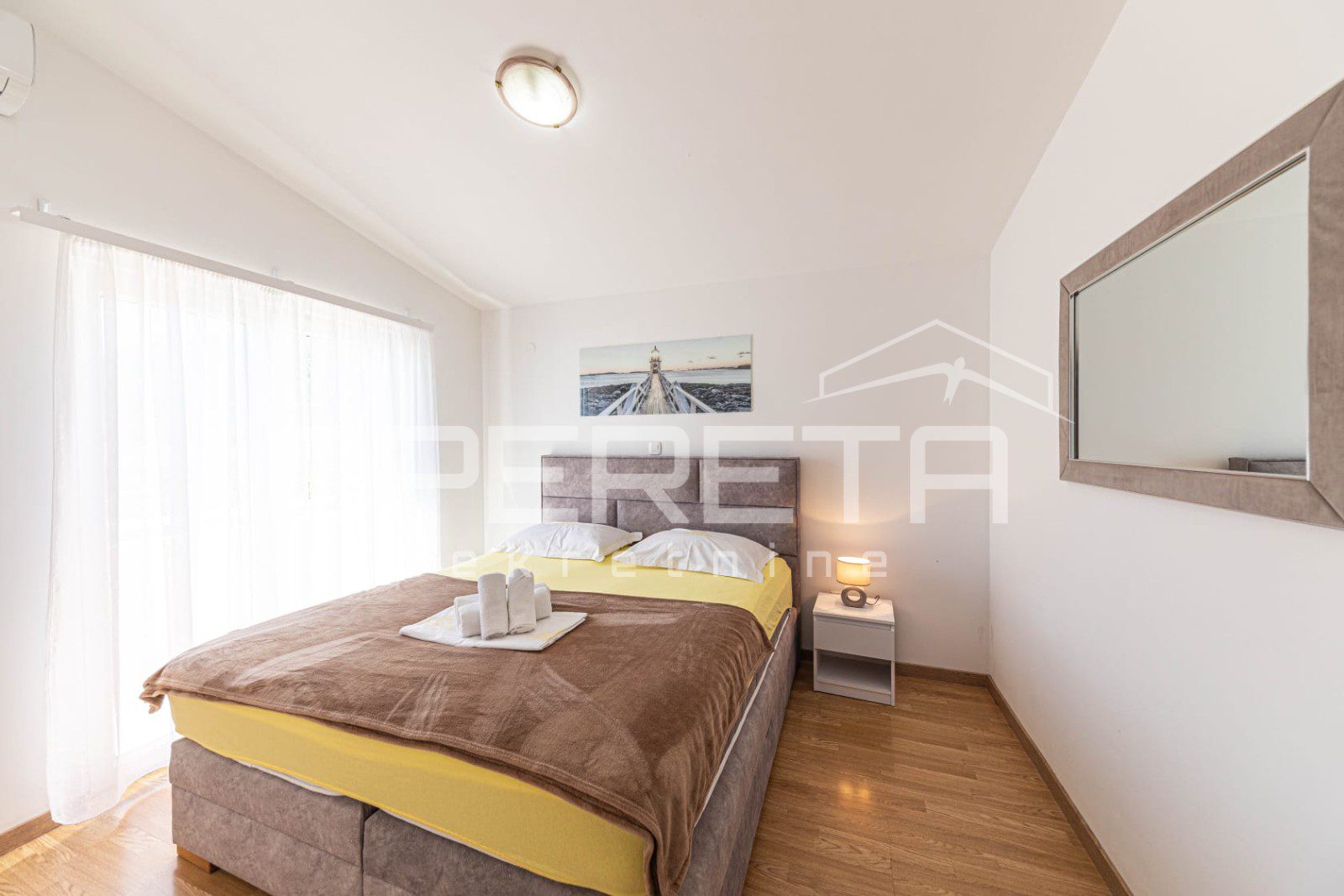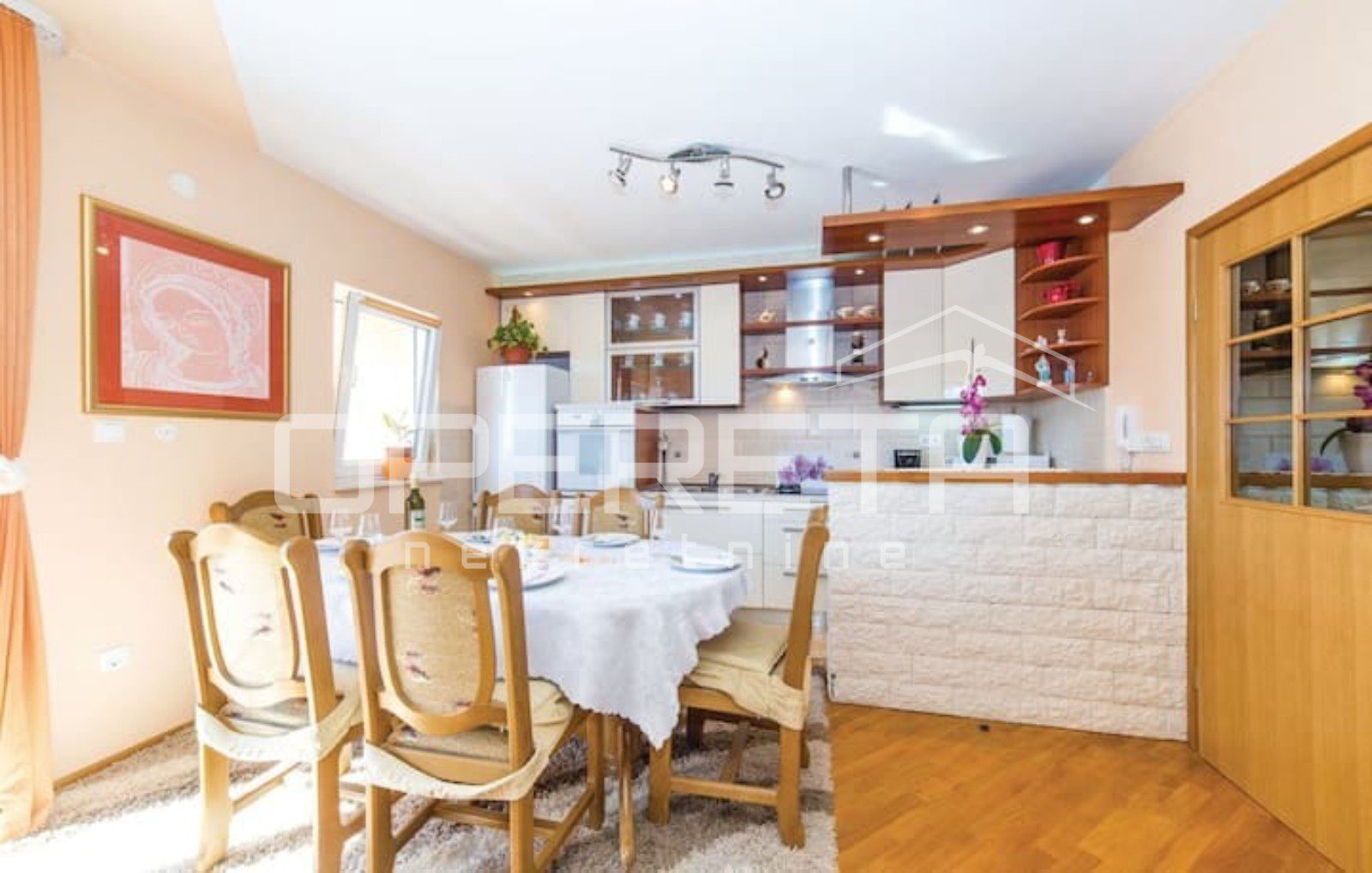 U prizemlju se nalazi funkcionalan apartman s dvije spavaće sobe, kuhinjom, blagovaonicom, dnevnim boravkom i kupaonicom, s izravnim pristupom vrtu i bazenu. Na katu se prostire prostran i svijetao stan s tri spavaće sobe, dvije kupaonice, moderno opremljenom kuhinjom, blagovaonicom i dnevnim boravkom koji vodi na natkrivenu terasu s prekrasnim pogledom na more. Interijer odiše toplinom i suvremenim dizajnom, s naglaskom na udobnost i kvalitetne materijale.