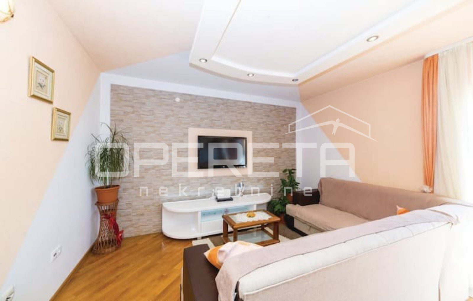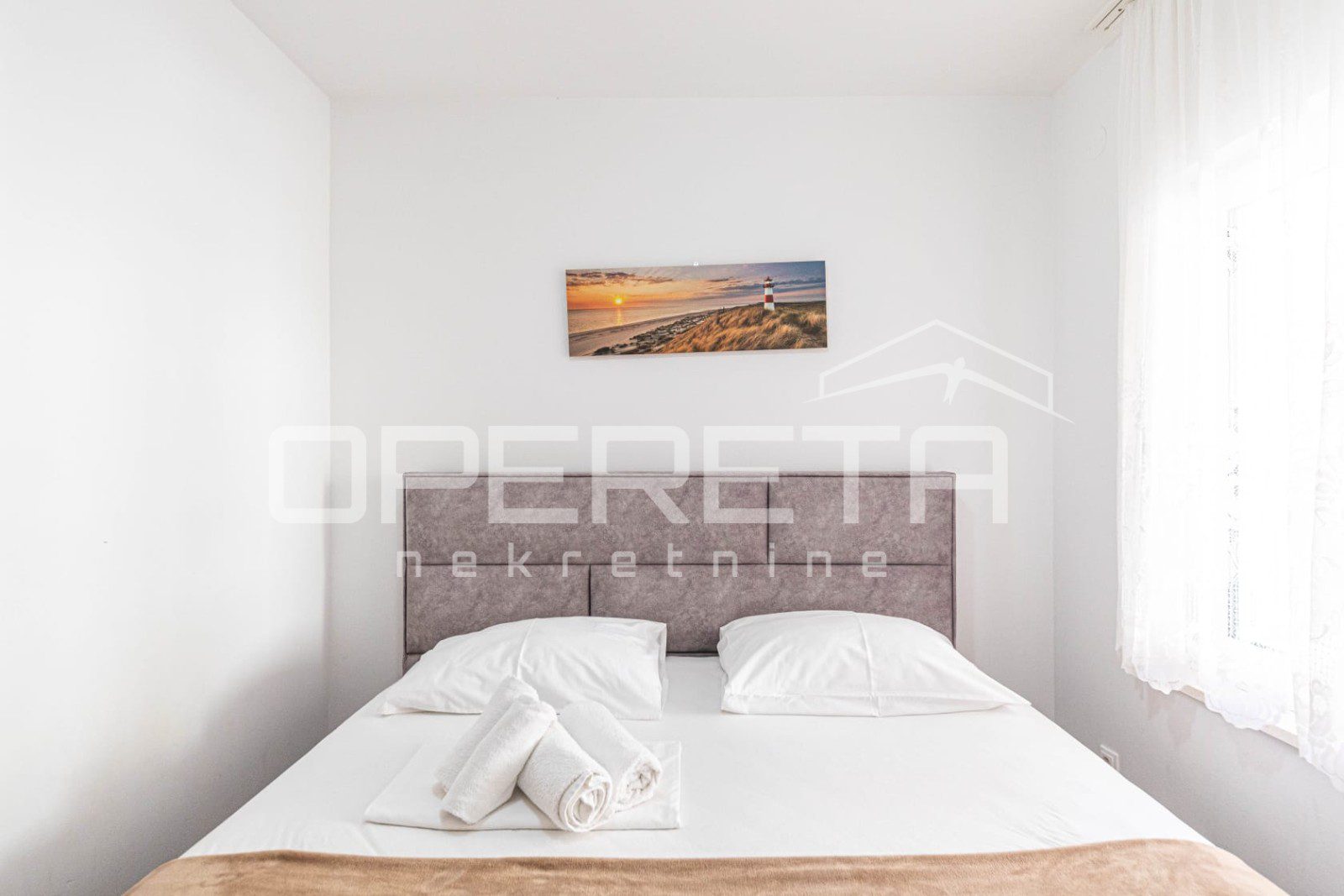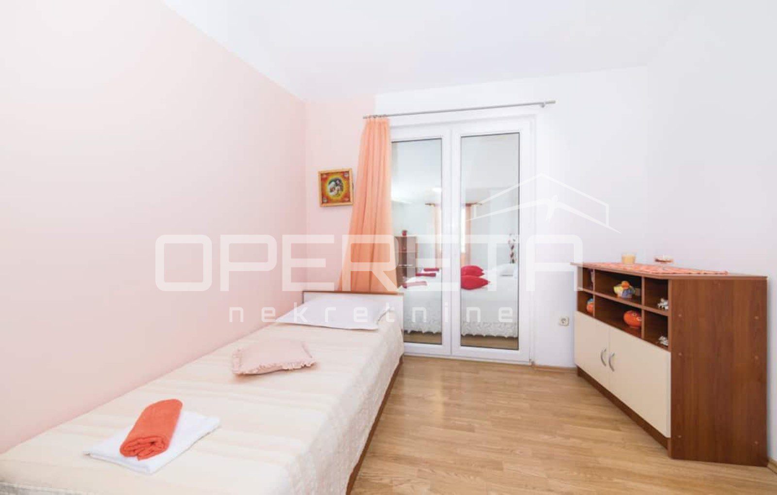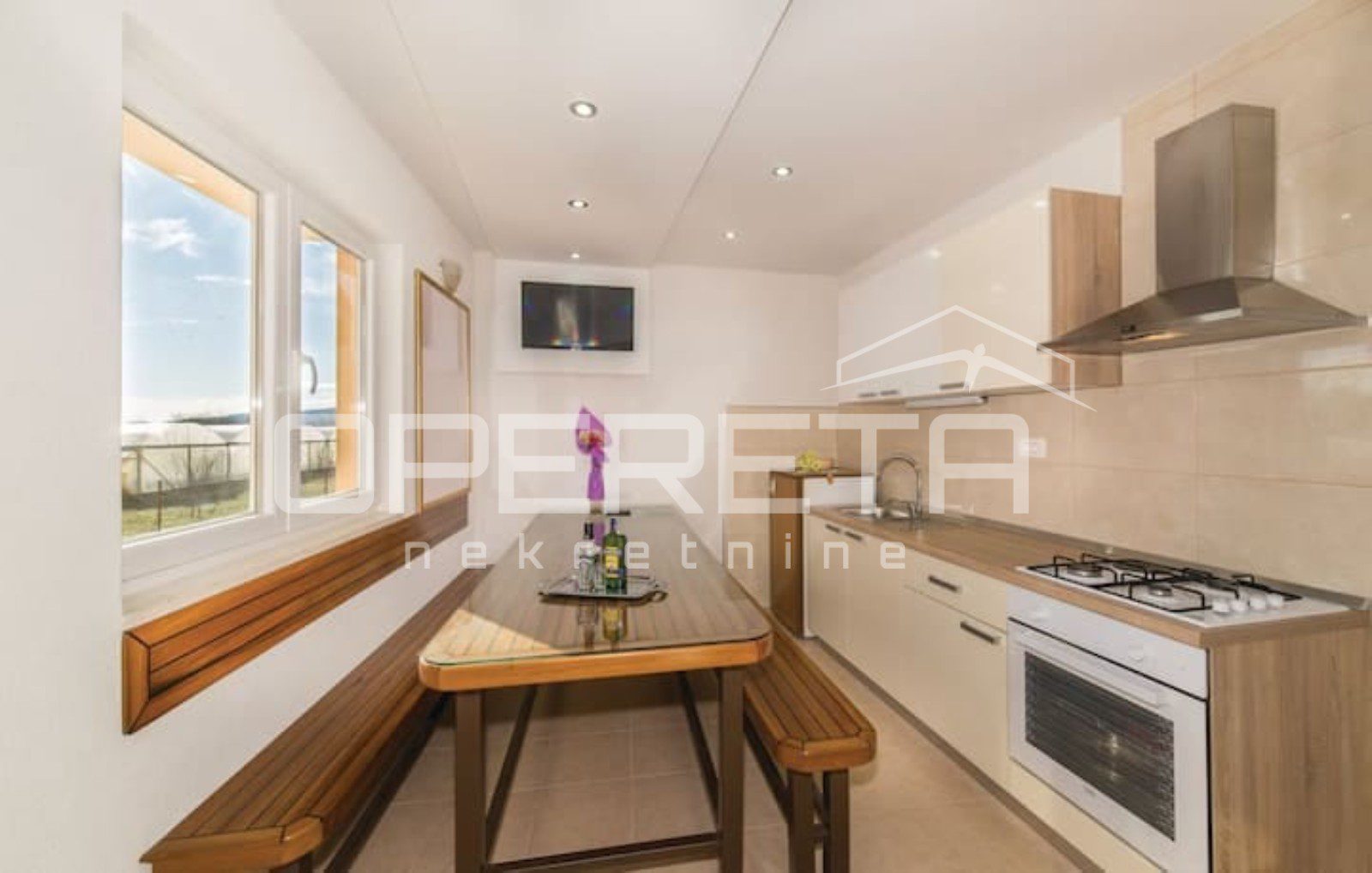 U prizemlju se nalazi funkcionalan apartman s dvije spavaće sobe, kuhinjom, blagovaonicom, dnevnim boravkom i kupaonicom, s izravnim pristupom vrtu i bazenu. Na katu se prostire prostran i svijetao stan s tri spavaće sobe, dvije kupaonice, moderno opremljenom kuhinjom, blagovaonicom i dnevnim boravkom koji vodi na natkrivenu terasu s prekrasnim pogledom na more. Interijer odiše toplinom i suvremenim dizajnom, s naglaskom na udobnost i kvalitetne materijale.