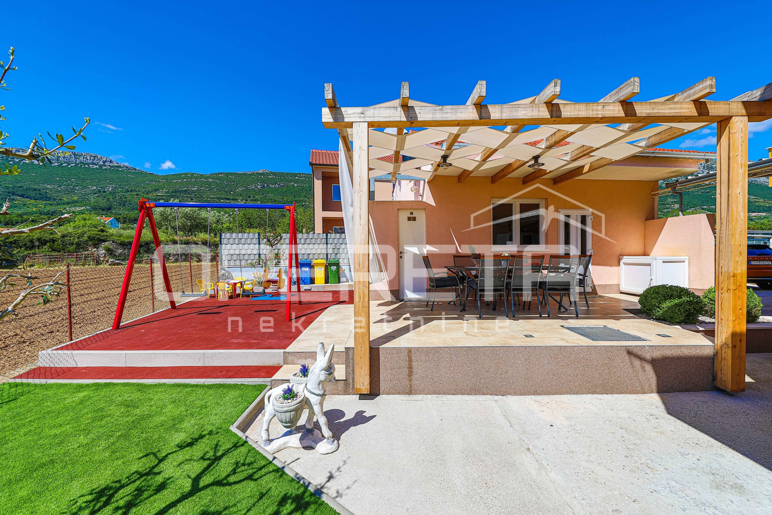 Vanjski prostor oblikovan je kao privatna mediteranska oaza s bazenom, uređenom hortikulturom i prostranim sunčalištem. Posebnu vrijednost daje pomoćni objekt površine 20 četvornih metara koji služi kao ljetna kuhinja s kaminom i natkrivenim prostorom za druženje, savršena za ljetna okupljanja i opuštanje uz dalmatinske specijalitete.
