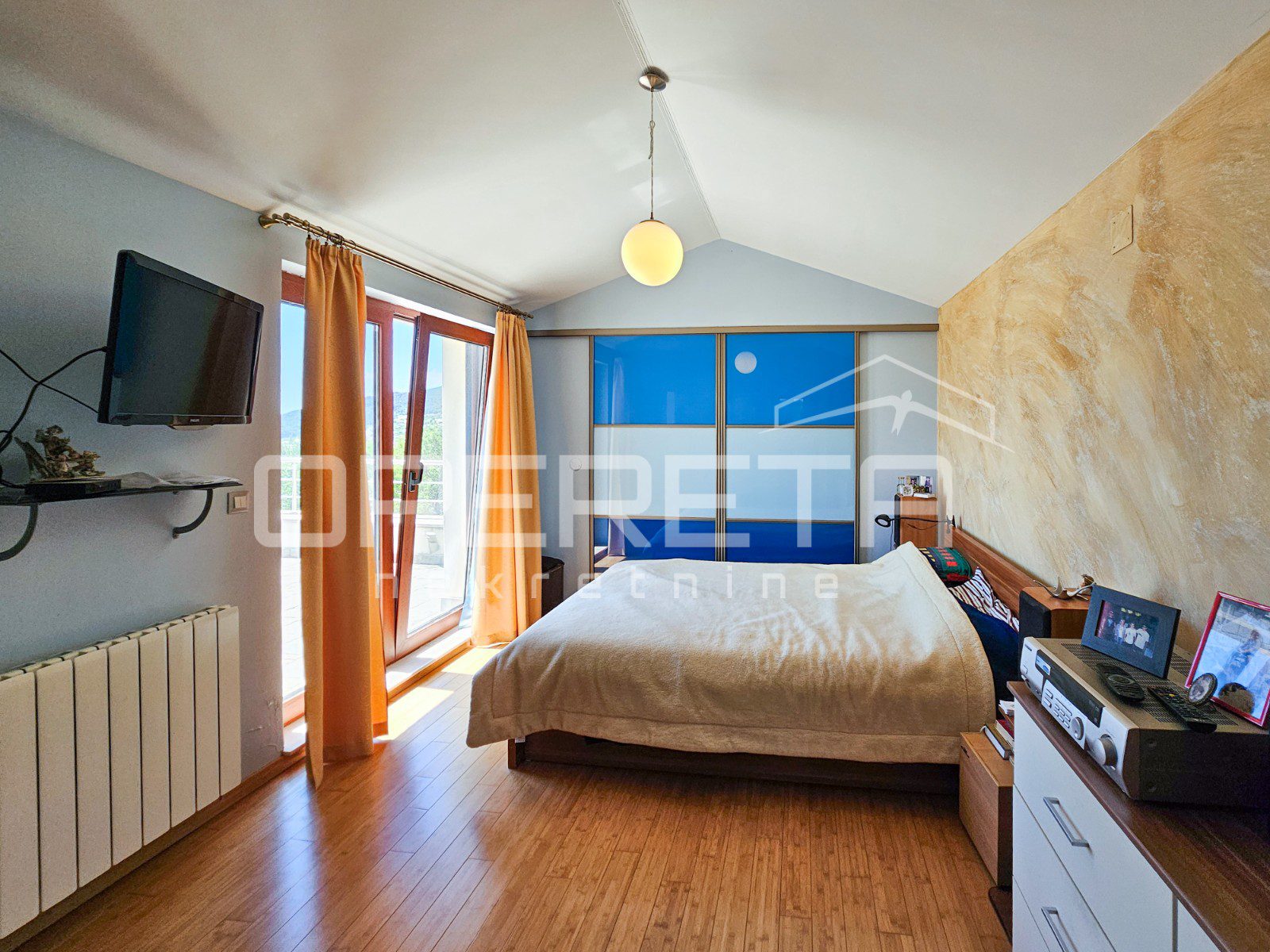 Dvije prostrane spavaće sobe s walk-in ormarima i izlazom na zajedničku prostranu terasu s panoramskim pogledom te kupaonica opremljena vrhunskom sanitarnom opremom, savršeno zaokružuju etažu prvog kata.