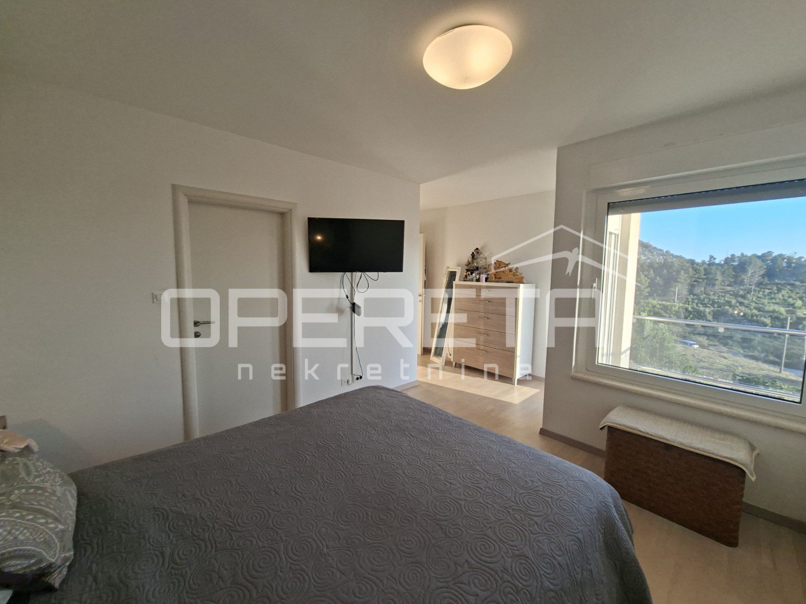 Gornji kat rezerviran je za mirniji, intimniji dio doma – tu se nalaze četiri spavaće sobe, velika kupaonica i loggia. Dvije sobe dijele prostranu terasu s koje se pruža zapanjujući panoramski pogled na Split, Kaštelanski zaljev i dalmatinske otoke – prizor koji oduzima dah u svako doba dana.