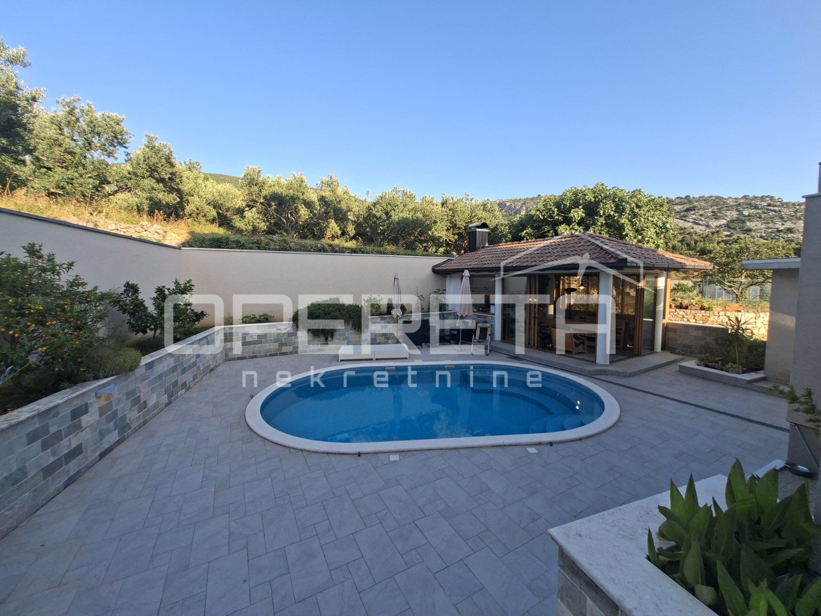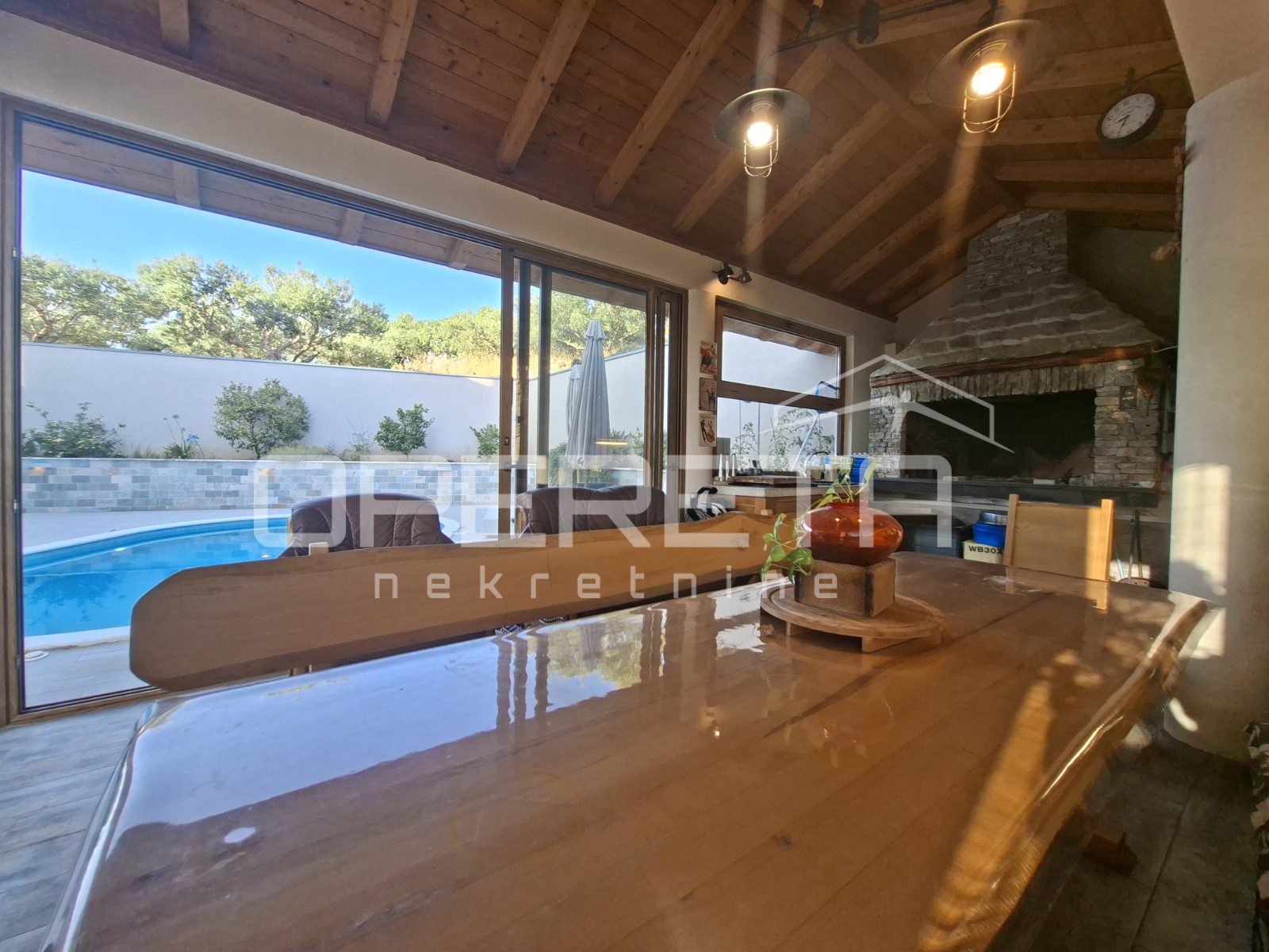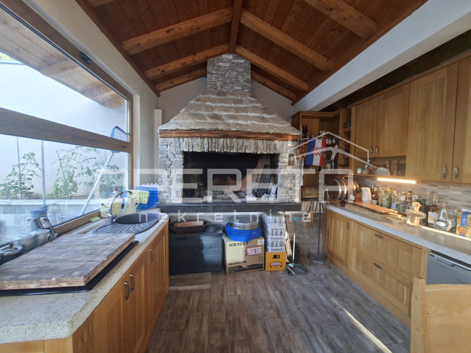 Okućnica ove nekretnine pažljivo je uređena i osmišljena za uživanje – tu se nalazi veliki bazen za osvježenje tijekom ljetnih mjeseci, natkriveni prostor s kominom, idealan za druženja i roštilje, te velika zelena površina koja dodaje osjećaj slobode i prirodne ravnoteže.