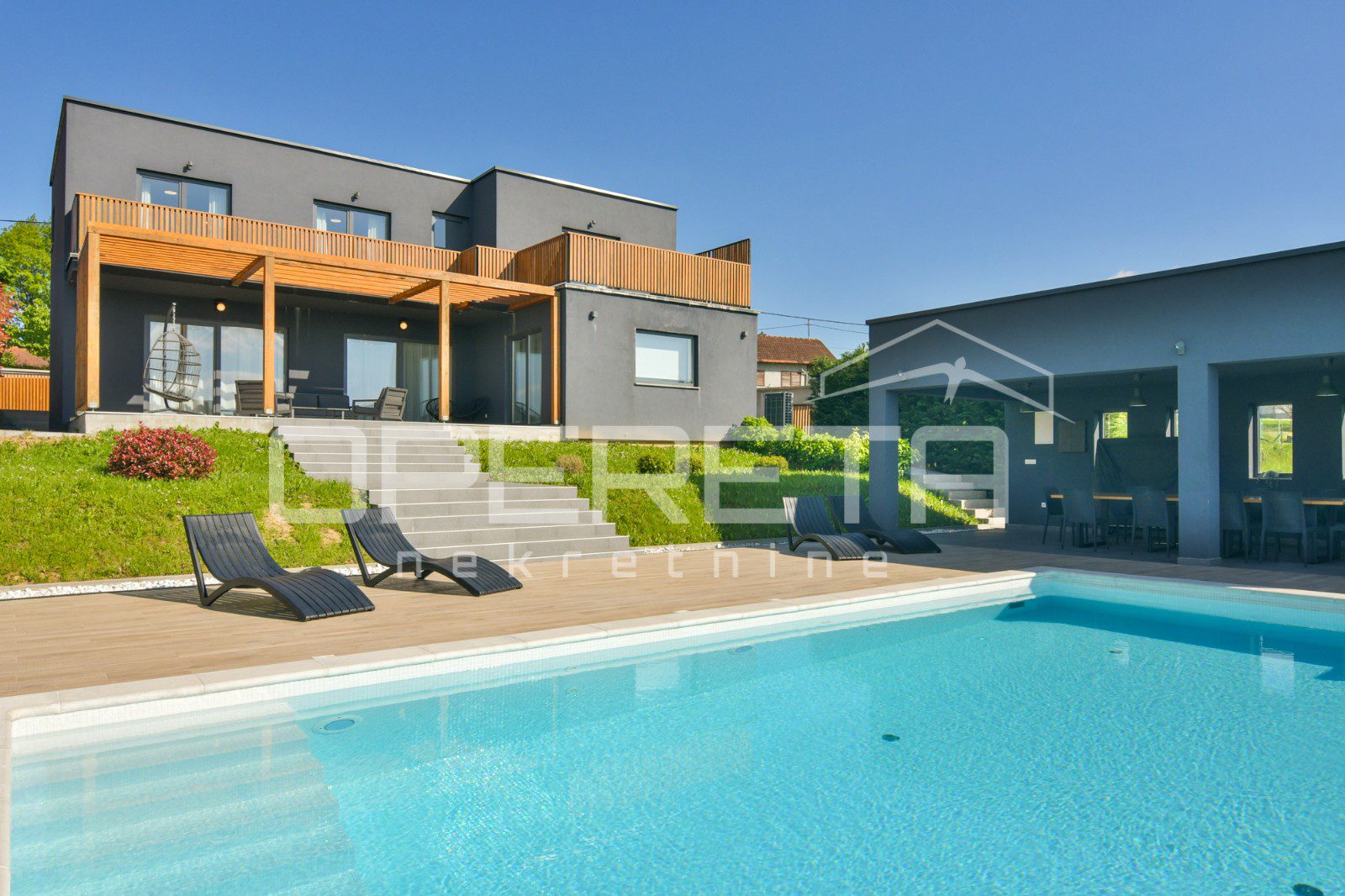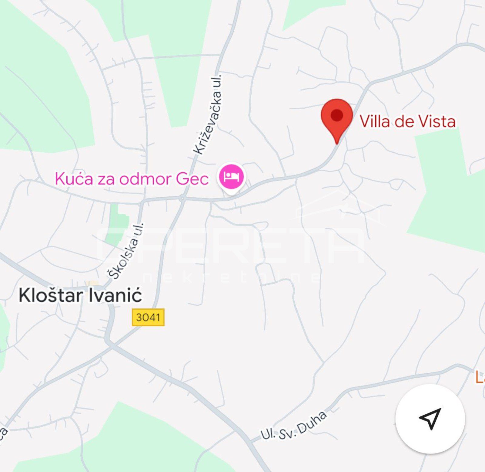 PRODAJA, KUĆA, BAZEN, KLOŠTAR IVANIĆ, 500m2, betonska samostojeća kuća, ima prizemlje i kat. PRIZEMLJE zatvorenog prostora ima 90m2: hodnik, prostrani dnevni boravak s blagovaonicom, potpuno opremljena kuhinja, mali WC i soba (s hidromasažnom kadom). KAT ima zatvorenog prostora 86m2 i to: 3 spavaće sobe s vlastitim kupaonicama s wc-ima, stubište unutarnje, hodnik. Svaka soba ima izlaz na balkon i na terasu (20m2) idealna za opuštanje, razbuđivanje na jutarnjem suncu. U prizemlju iz svake prostorije se može izaći z svakog dijela na sunčanu, veliku terasu od 37m2. Do ove kuće ima još dodatna drvena, autohtona kuća tlocrtne površine 43m2, koja se sastoji od dnevnog boravka s kuhinjom i blagovaonicom, wc-om te spavaćim prostorom na galeriji , natkrivenom terasom od 16m2 i podruma površine 24m2. Ova predivna i jedinstvena nekretnina nudi jošš i :