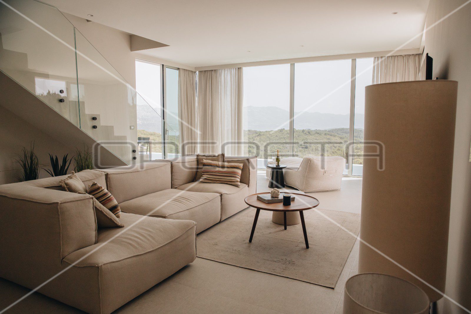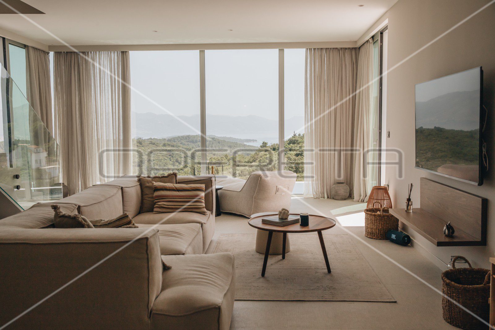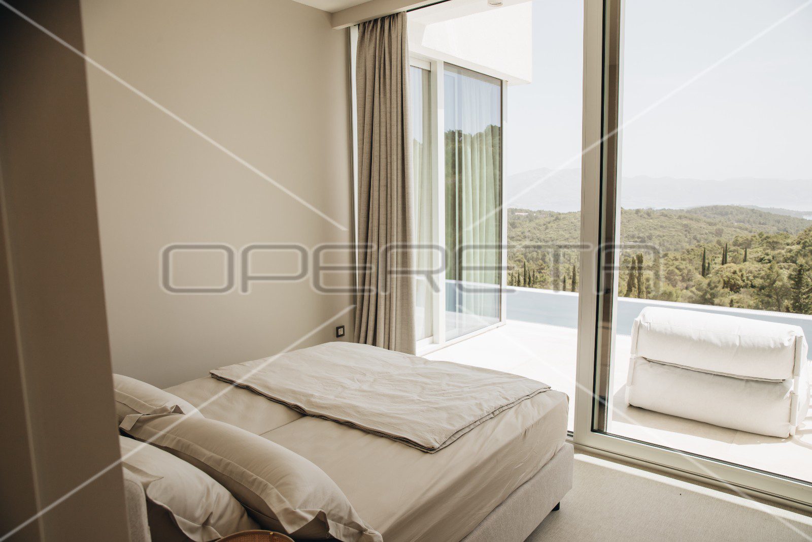 Na prizemlju, prostrani dnevni boravak spojen je s modernom kuhinjom opremljenom Miele aparatima i blagovaonicom, odakle se izlazi na prostranu terasu s infinity bazenom. Tri elegantne spavaće sobe, svaka s vlastitom kupaonicom, smještene su na istoj razini, osiguravajući intimu i udobnost. Posebna pažnja posvećena je gornjoj etaži, gdje se nalazi četvrta raskošna glavna spavaća soba s privatnom kupaonicom i terasom, koja je opremljena jacuzzijem, idealnim za opuštanje uz predivan pogled na more i okolnu prirodu. Iz sve četiri sobe, kao i iz većine prostorija u vili, pruža se panoramski pogled na prirodu i more.