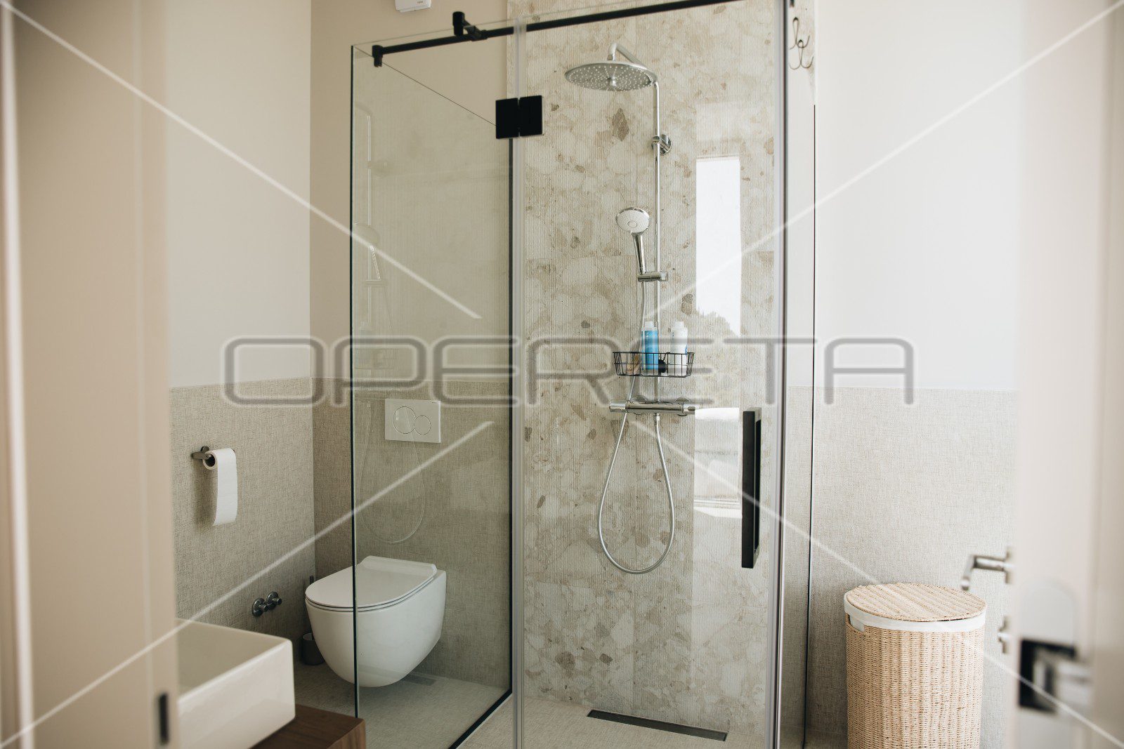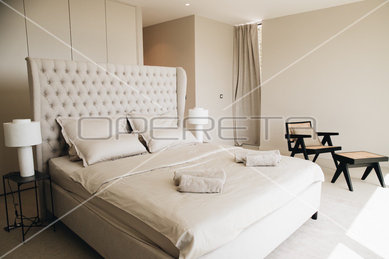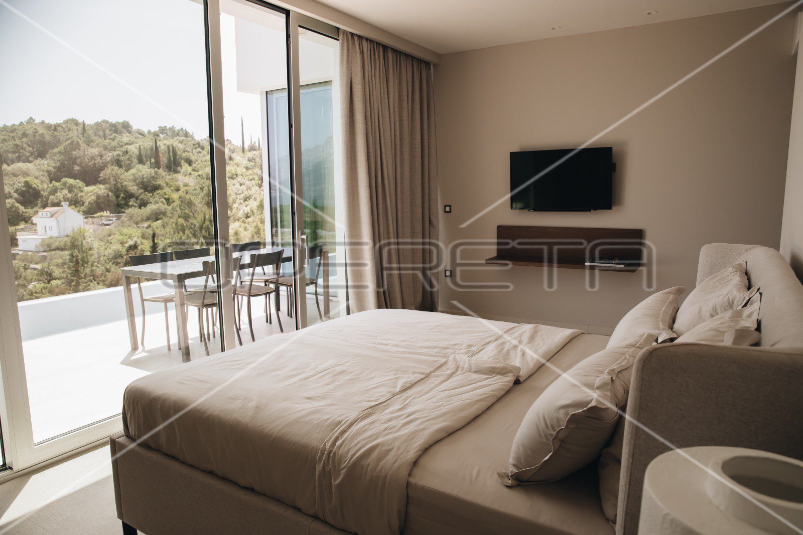 Na prizemlju, prostrani dnevni boravak spojen je s modernom kuhinjom opremljenom Miele aparatima i blagovaonicom, odakle se izlazi na prostranu terasu s infinity bazenom. Tri elegantne spavaće sobe, svaka s vlastitom kupaonicom, smještene su na istoj razini, osiguravajući intimu i udobnost. Posebna pažnja posvećena je gornjoj etaži, gdje se nalazi četvrta raskošna glavna spavaća soba s privatnom kupaonicom i terasom, koja je opremljena jacuzzijem, idealnim za opuštanje uz predivan pogled na more i okolnu prirodu. Iz sve četiri sobe, kao i iz većine prostorija u vili, pruža se panoramski pogled na prirodu i more.