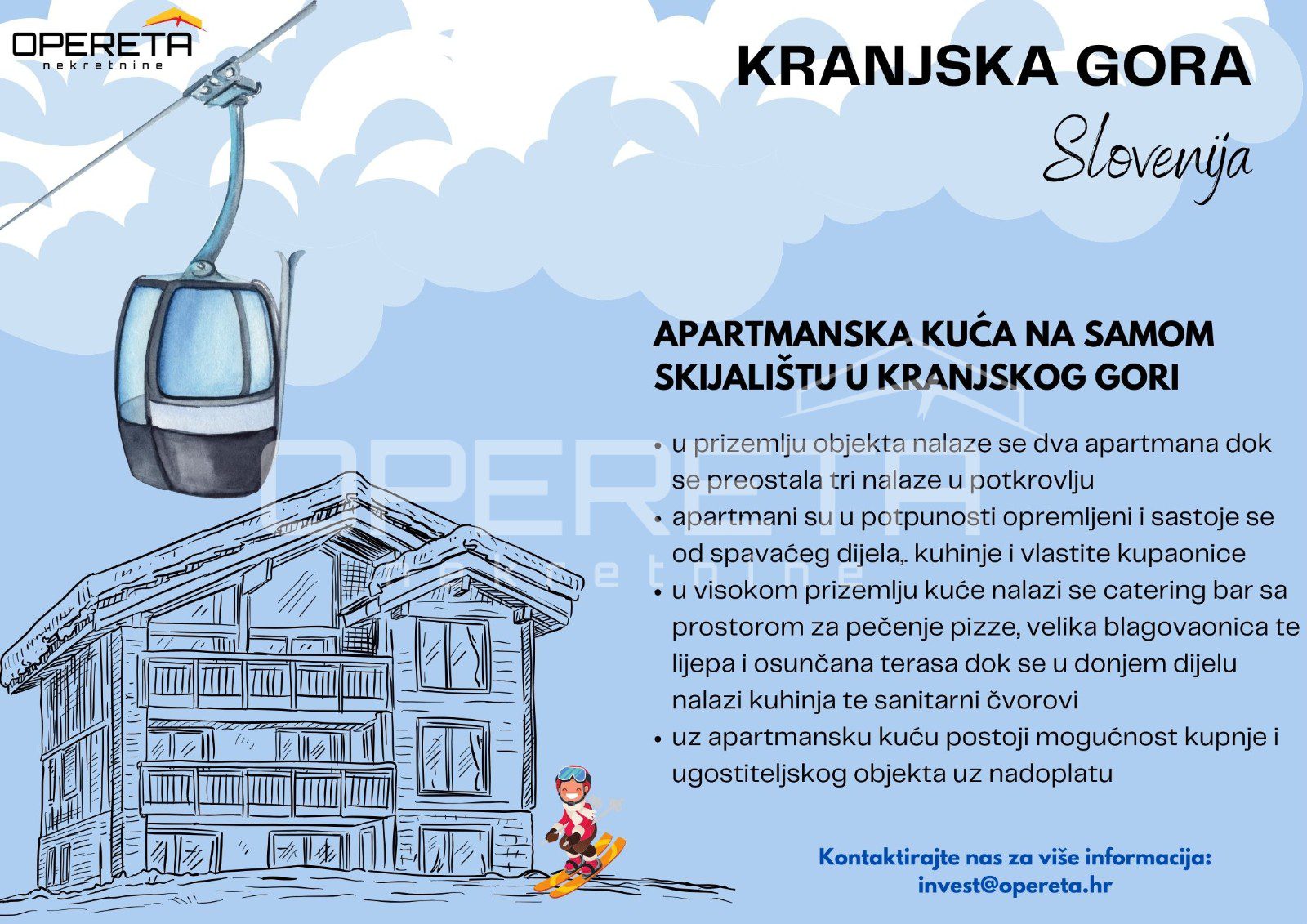 Na samom skijalištu u Kranjskoj gori, prodaje se apartmanska kuća sa 5 apartmana. Kuća se sastoji od podruma, prizemlja i potkrovlja. Dva apartmana nalaze se u prizemlju te imaju direktan pristup sa parkirališta dok se preostala 3 apartmana nalaze u potkrovlju kuće. Apartmani su u potpunosti opremljeni sa spavaćim djelom, kuhinjom i vlastitom kupaonicom. U visokom prizemlju kuće nalazi se catering bar sa prostorom za pečenje pizze, velika blagovaonica te lijepa i osunčana terasa dok se u donjem dijelu nalazi kuhinja te sanitarni čvorovi.