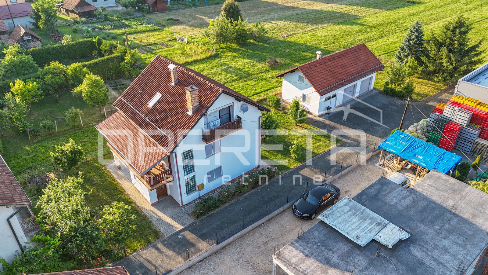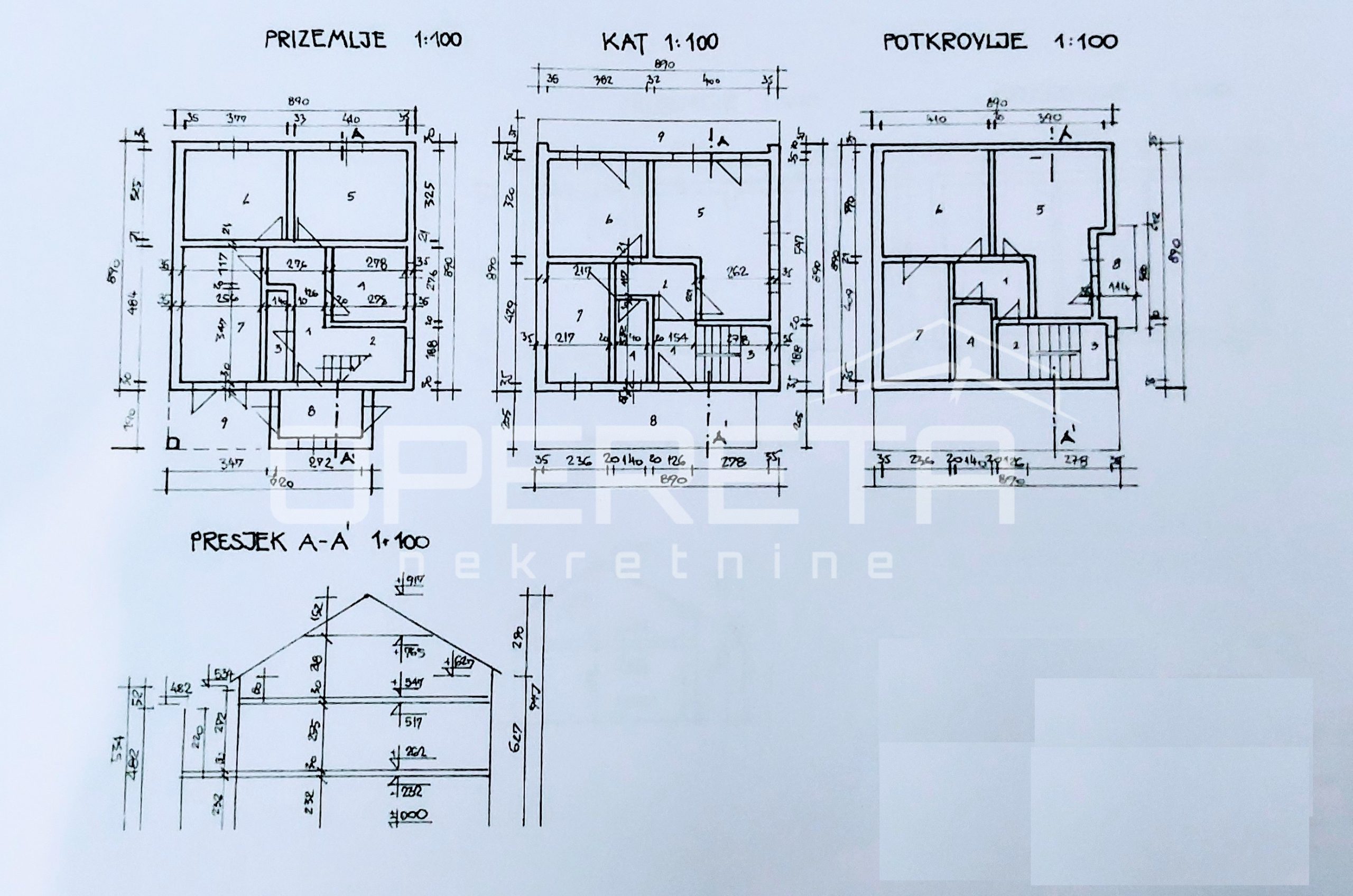 Samostojeća, kvalitetno građena katnica, prozračna i puna svjetla, stambene površine od 243 m2 na parceli pravilnog pravokutnog oblika, na mirnoj lokaciji, odmaknutoj od glavne ceste. Otvorene orijentacije prema centru Krapinskih Toplica i Aquae Vivae vodenom parku do kojeg ima 3 minute vožnje. Orjentirana na sve 4 strane svijeta, razvedena je na tri etaže odnosno potencijalno tri zasebne stambene jedinice. Prizemlje se sastoji od trijema, ulaznog hodnika, dnevnog boravka, spavaće/radne sobe, kuhinje, kupaonice s wc-om, ostave te prostorije s direktnim izlazom na ulaznu terasu.