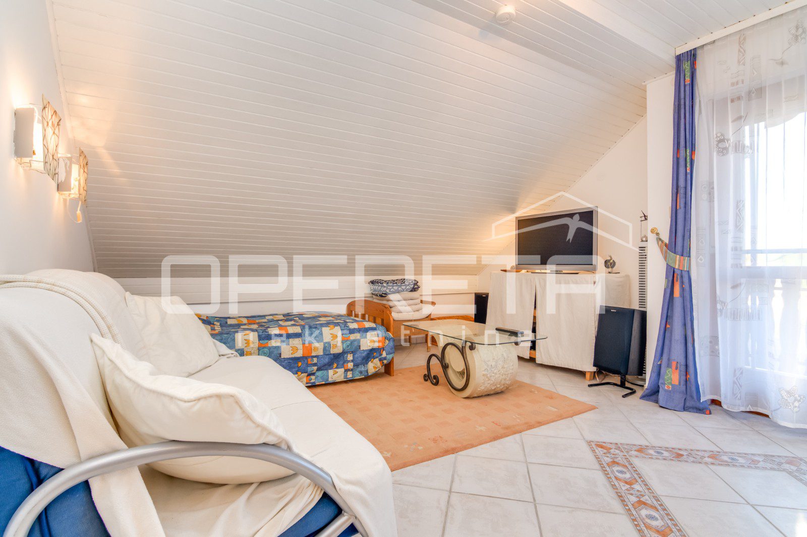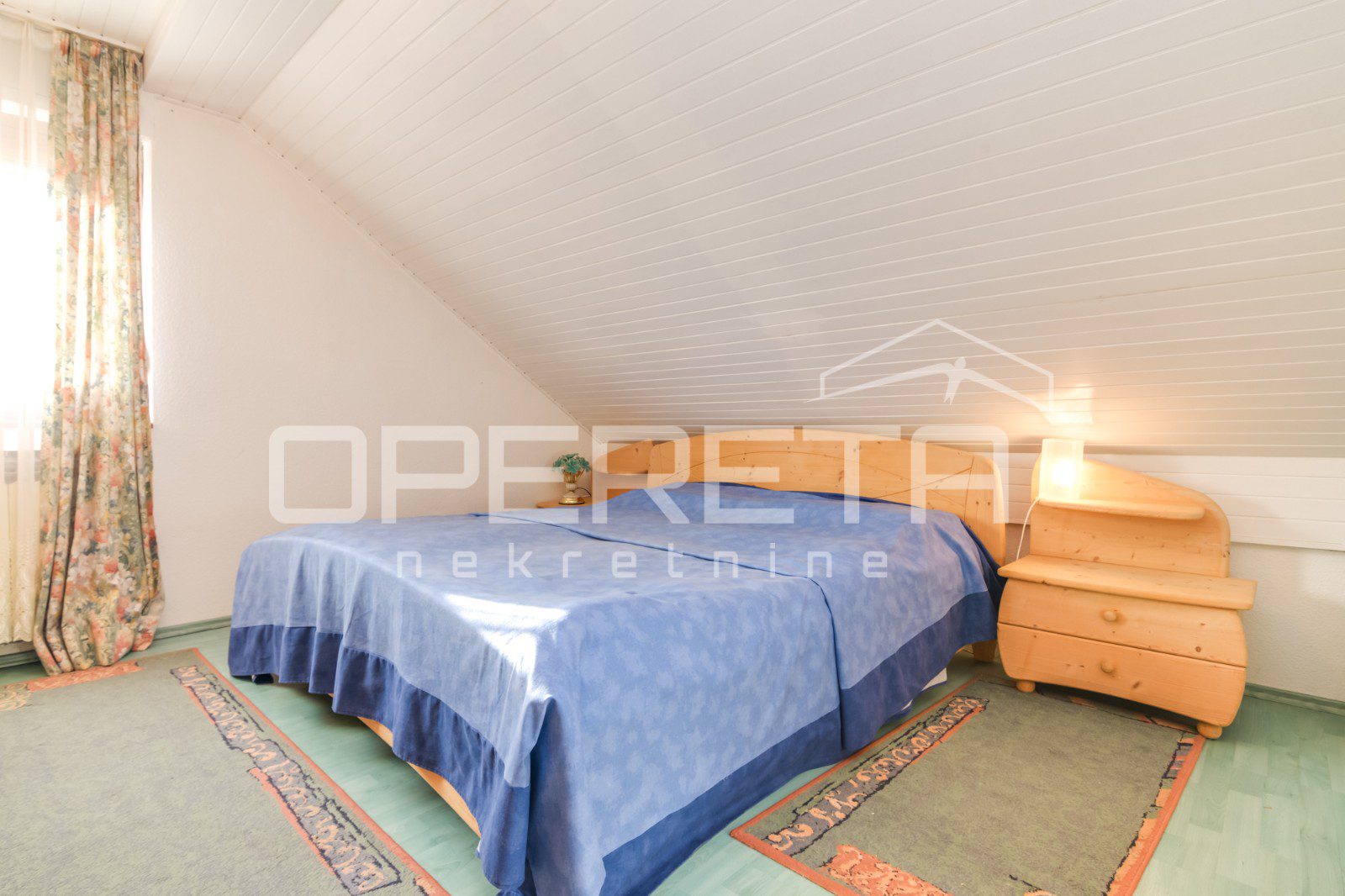 Unutarnje stubište povezuje ga s katom gdje se nalaze 2 sobe s izlazom na zajednički balkon, priprema za kuhinju, kupaonica s wc-om i hodnik. Potkrovlje se sastoji od dnevnog boravka s izlazom na balkon, radno/spavaće sobe i kuhinje.