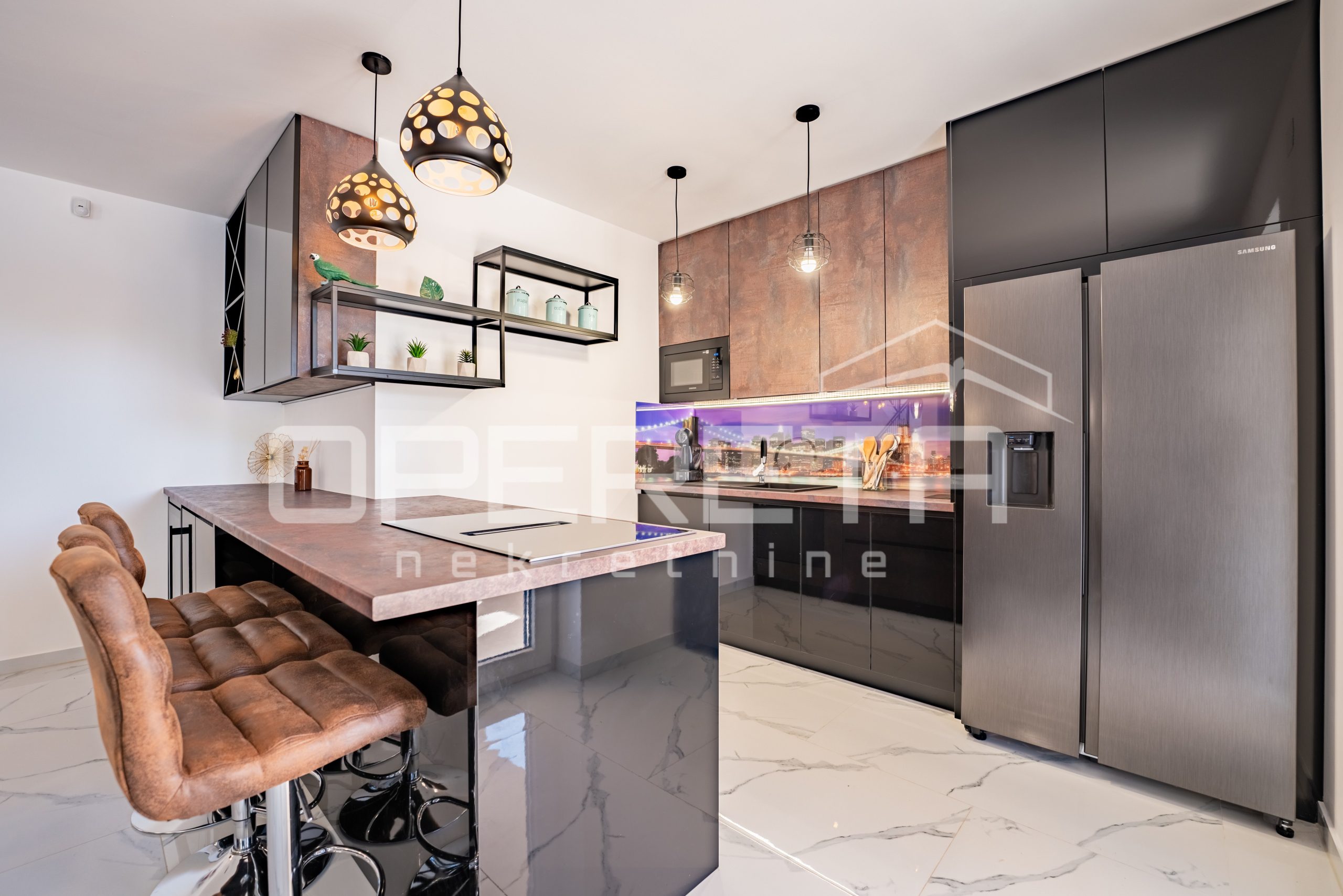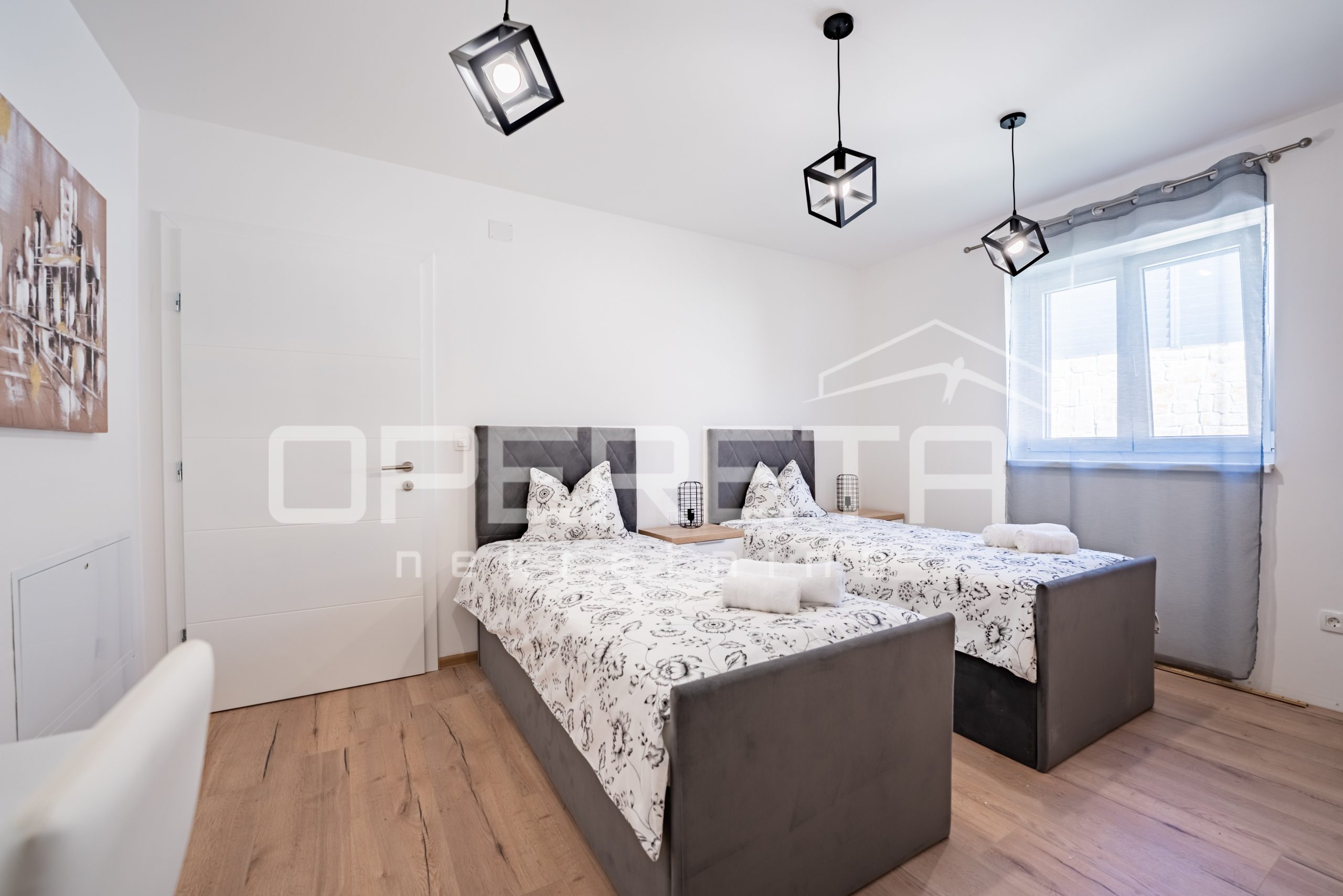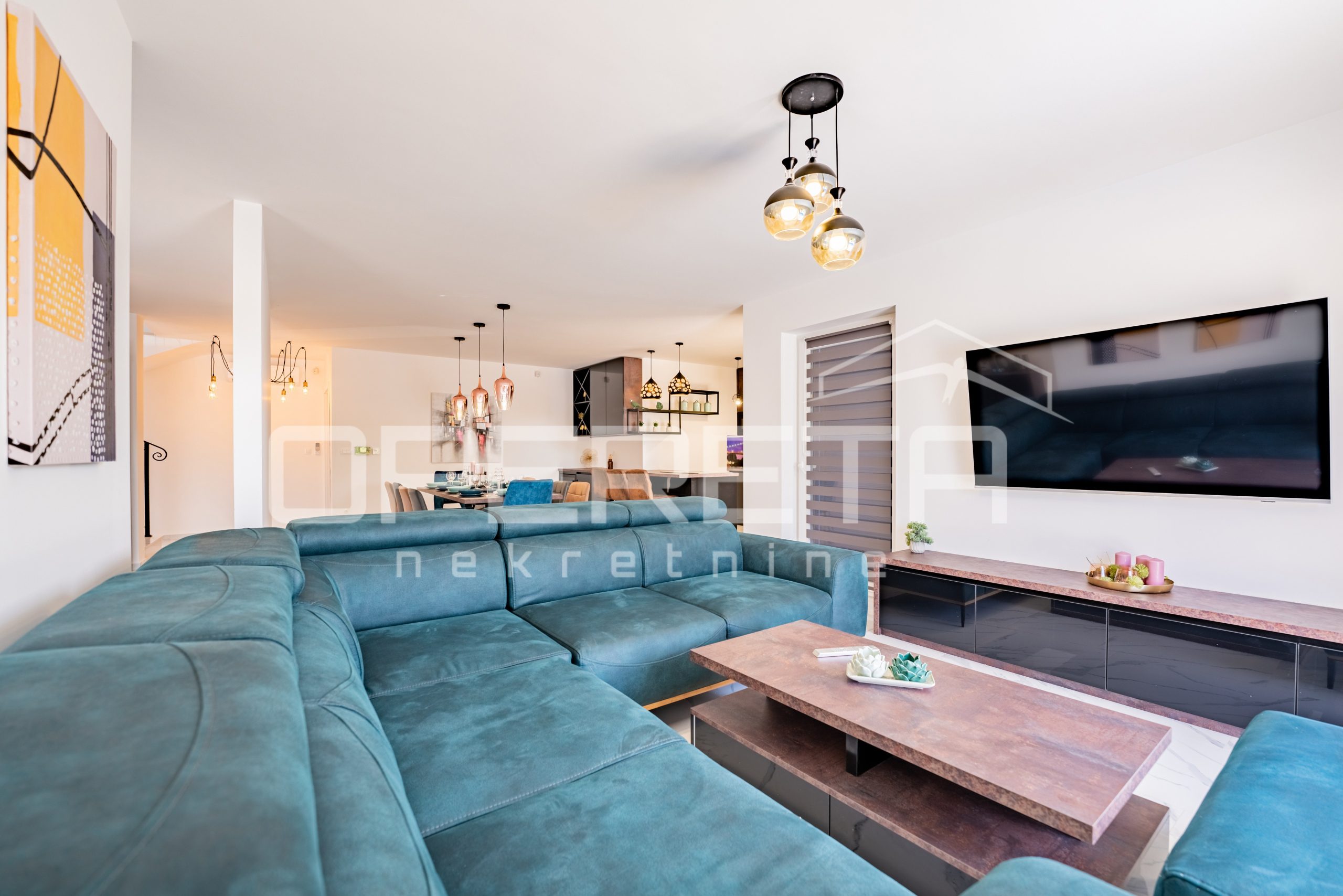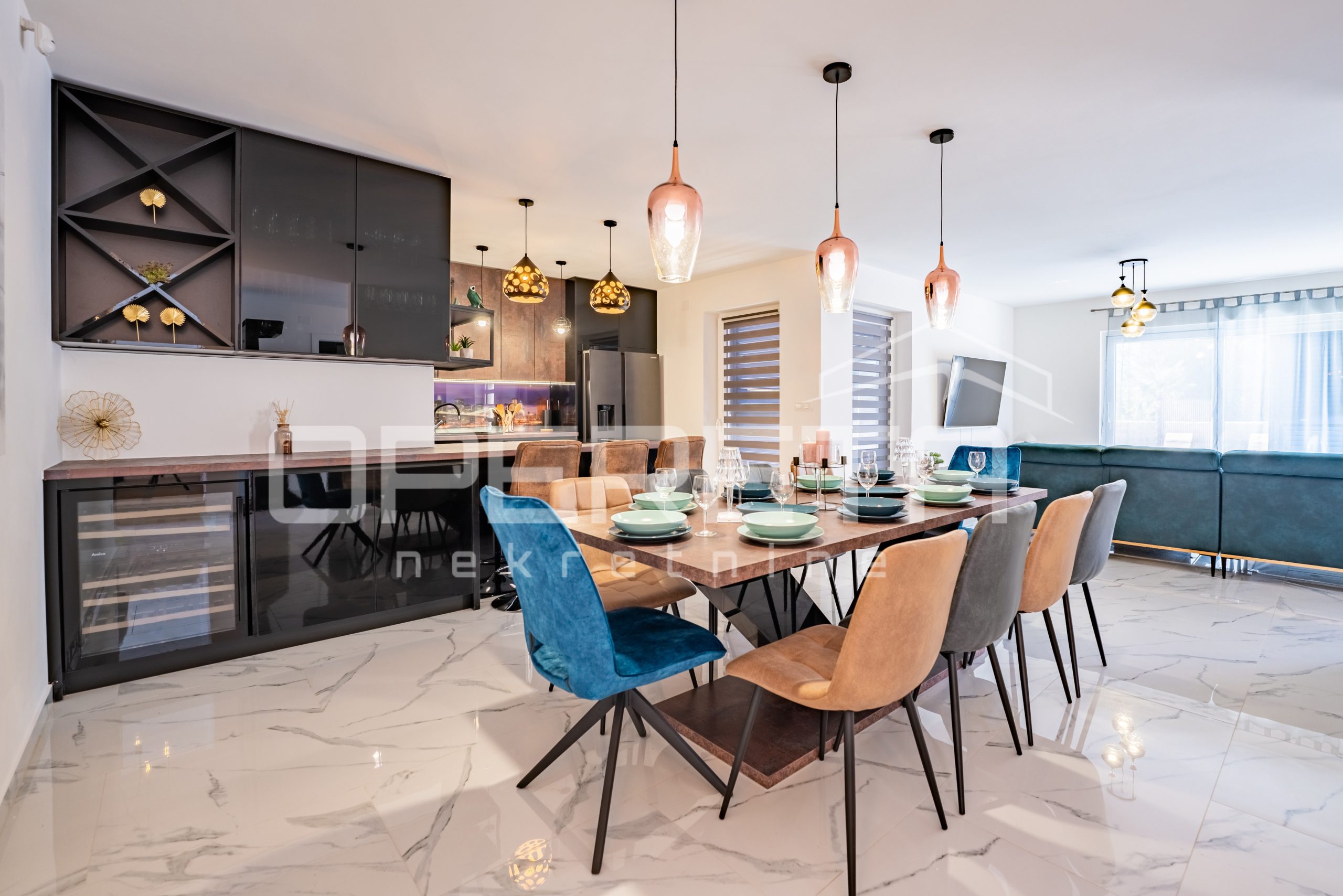 Kuća se prostire na dvije etaže i odiše pažljivo biranim detaljima te promišljenim rasporedom prostora: