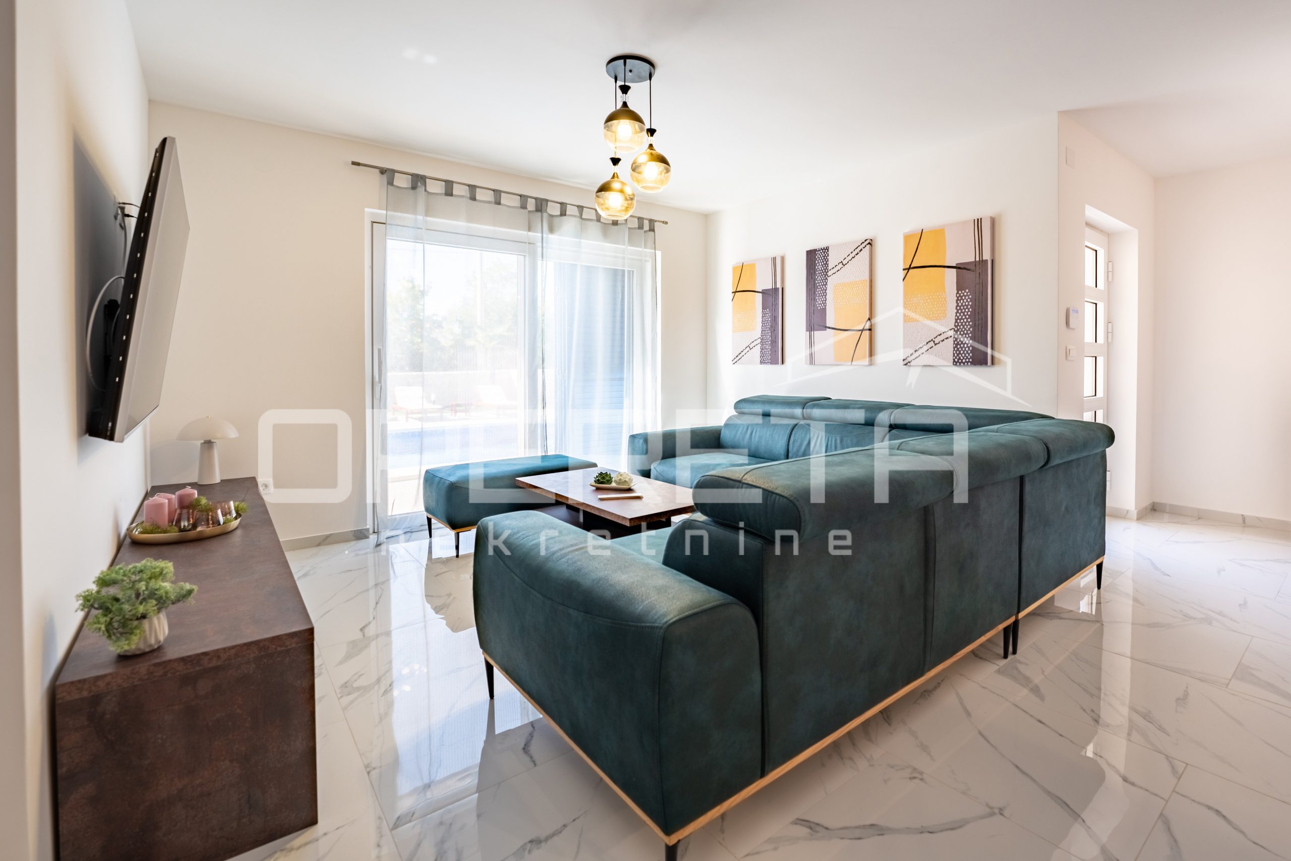 Prizemlje: otvoreni dnevni boravak s blagovaonicom i potpuno opremljenom kuhinjom, koji se prirodno nadovezuje na prostranu natkrivenu terasu s pogledom na bazen i vrt. Tu se nalaze i jedna spavaća soba s vlastitom kupaonicom te gostinjski toalet.