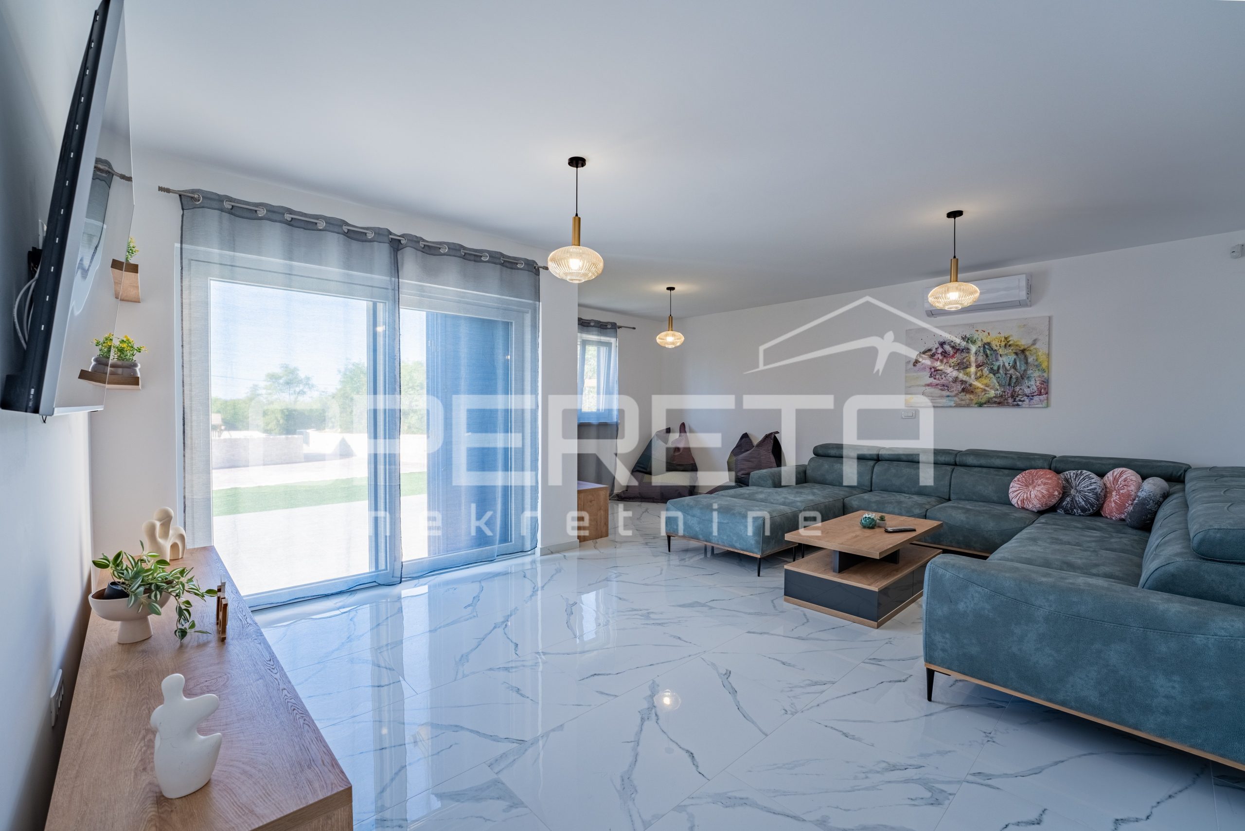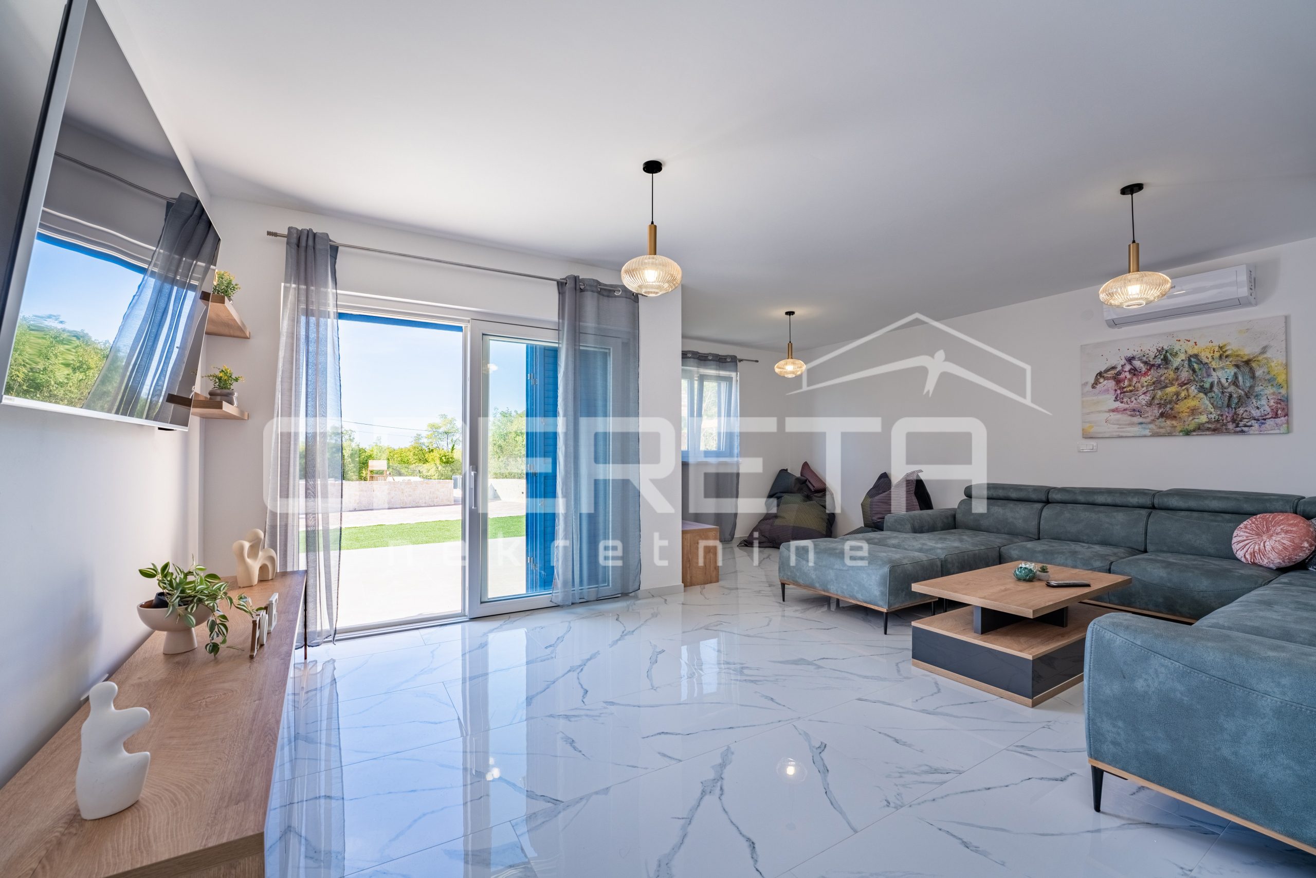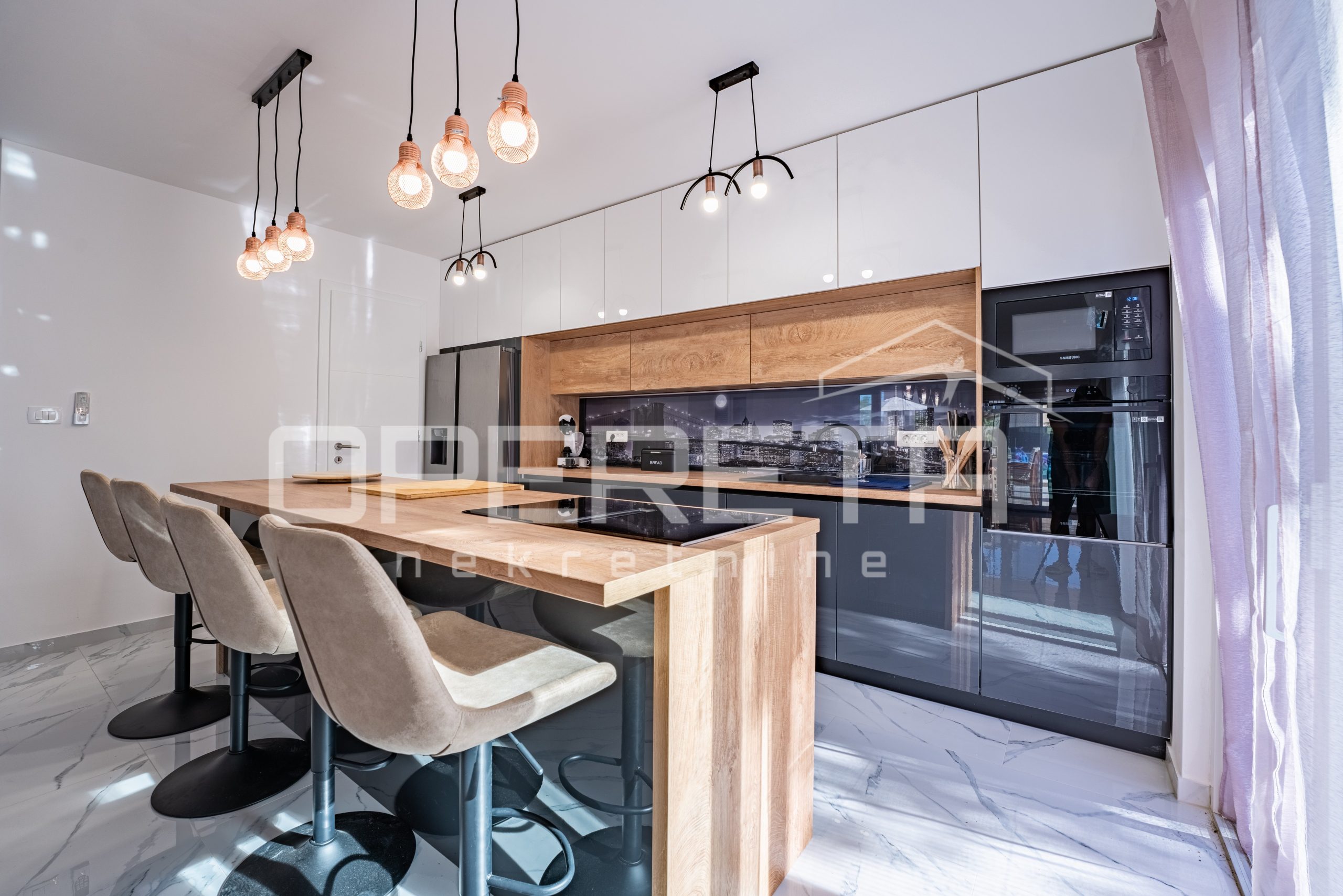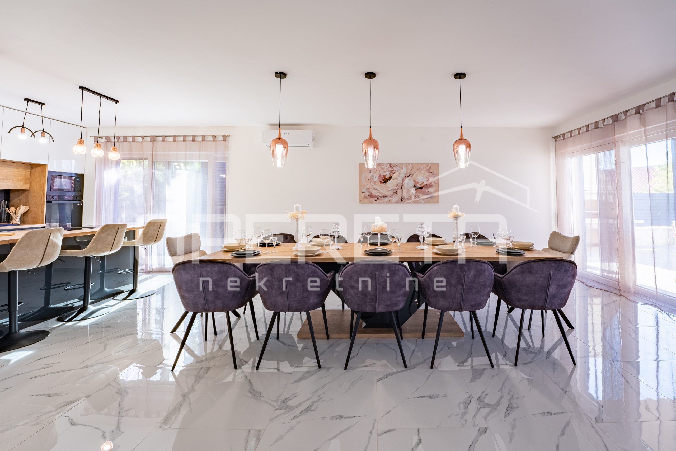 Otvoreni dnevni boravak povezan je s modernom kuhinjom i blagovaonicom, stvarajući središnji prostor za druženje i opuštanje, s izlazom na prostranu terasu i vrt.