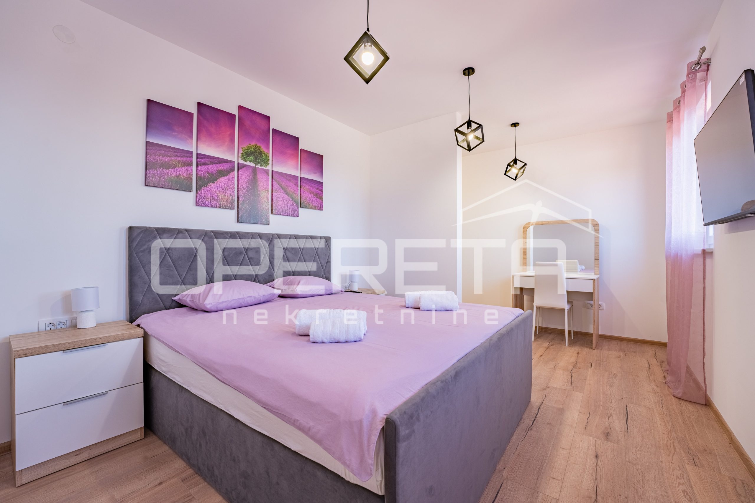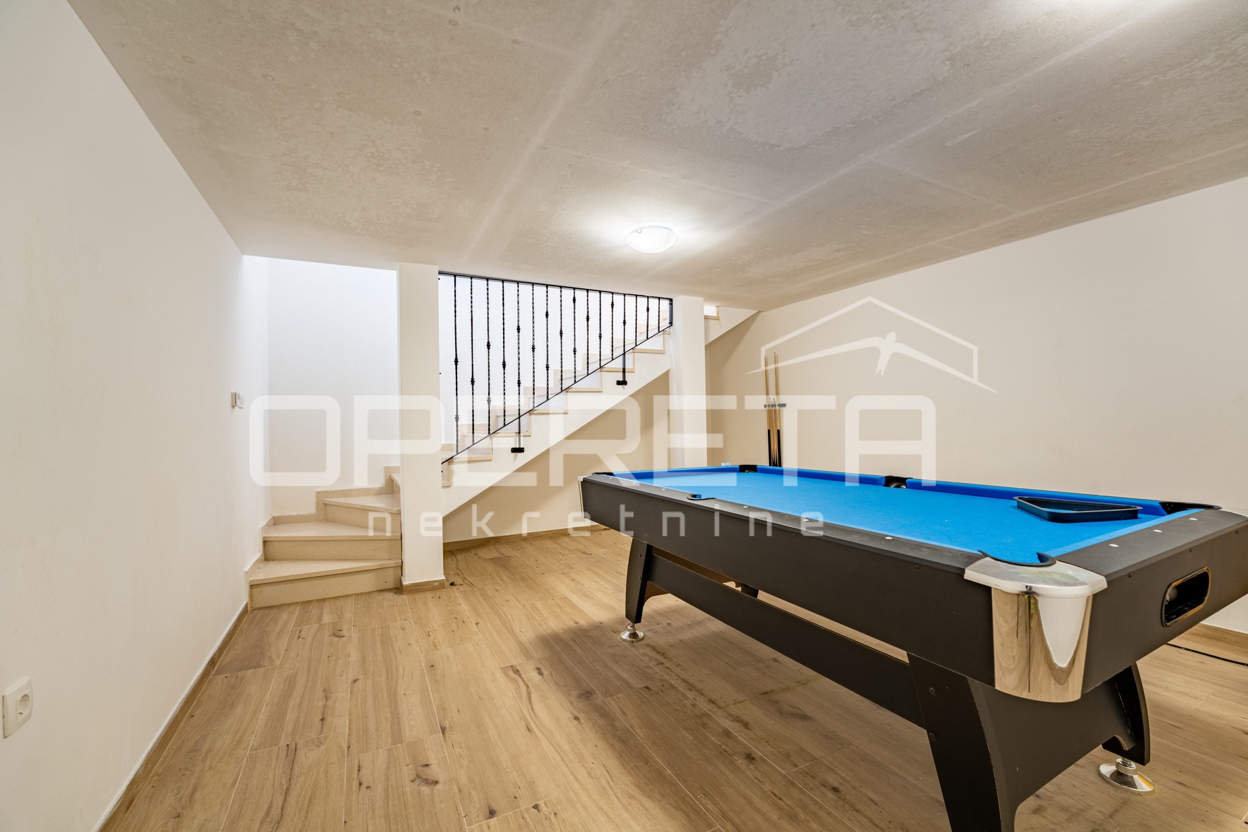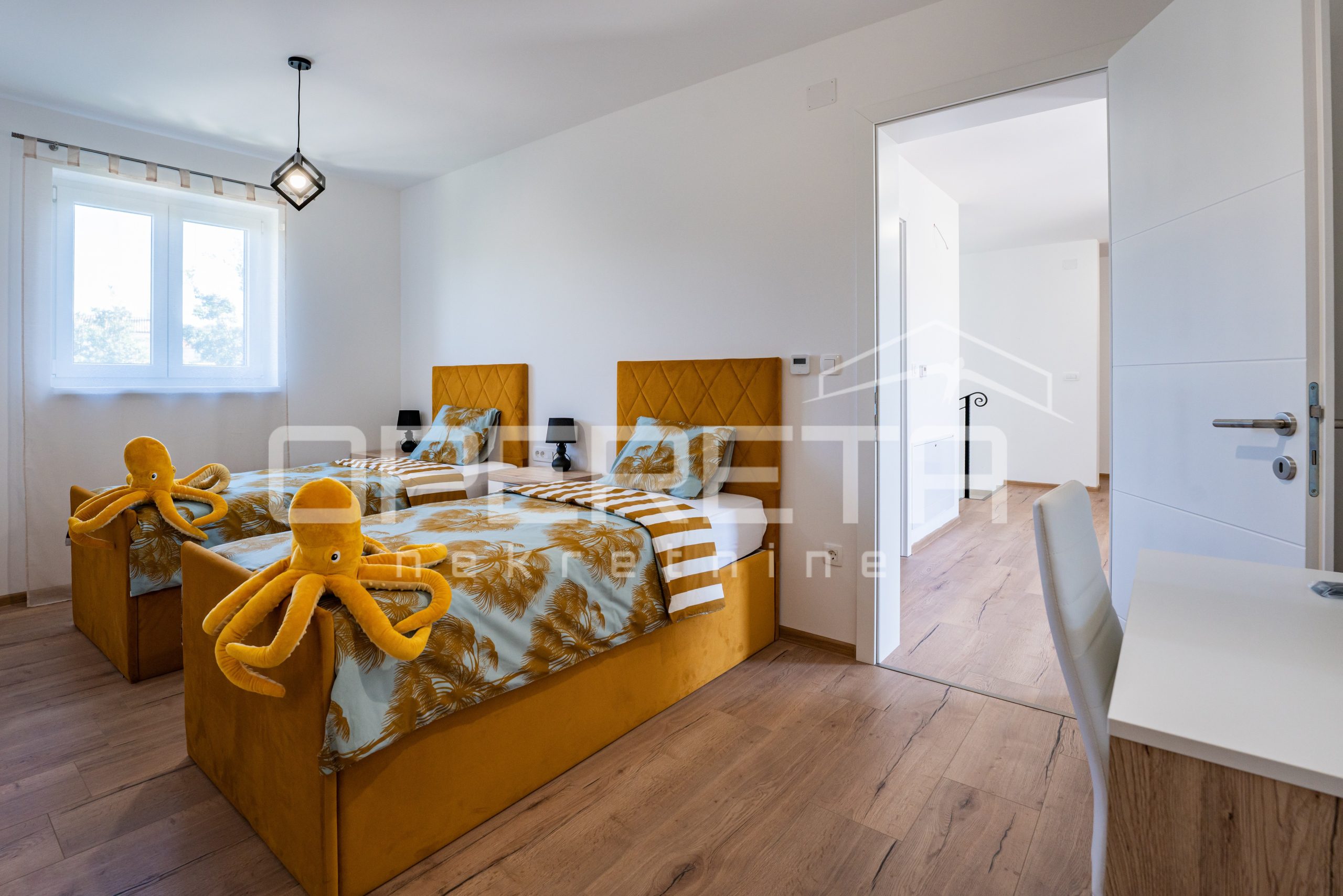 Vila se prostire na dvije etaže i sadrži čak pet prostranih spavaćih soba, svaka s vlastitom kupaonicom, čime se osigurava maksimalna privatnost i udobnost za sve članove obitelji ili goste. Dodatna šesta soba pruža fleksibilnost – idealna kao radna soba, fitness, igraonica ili dodatna spavaća soba prema potrebi.