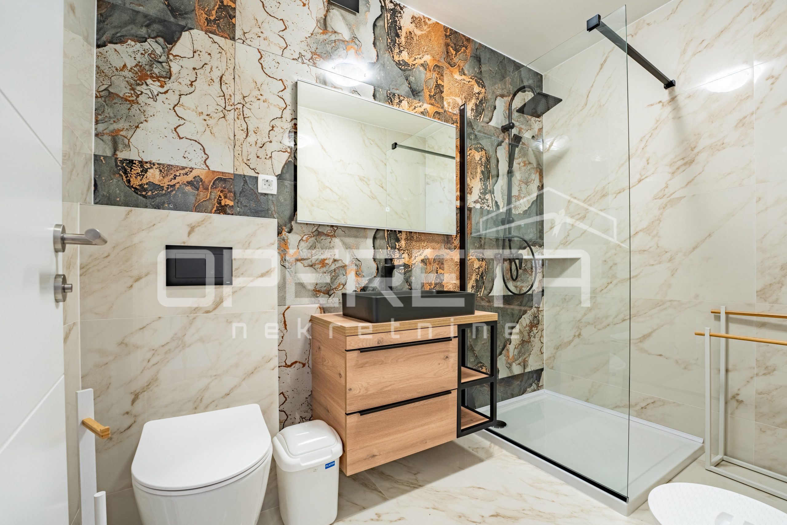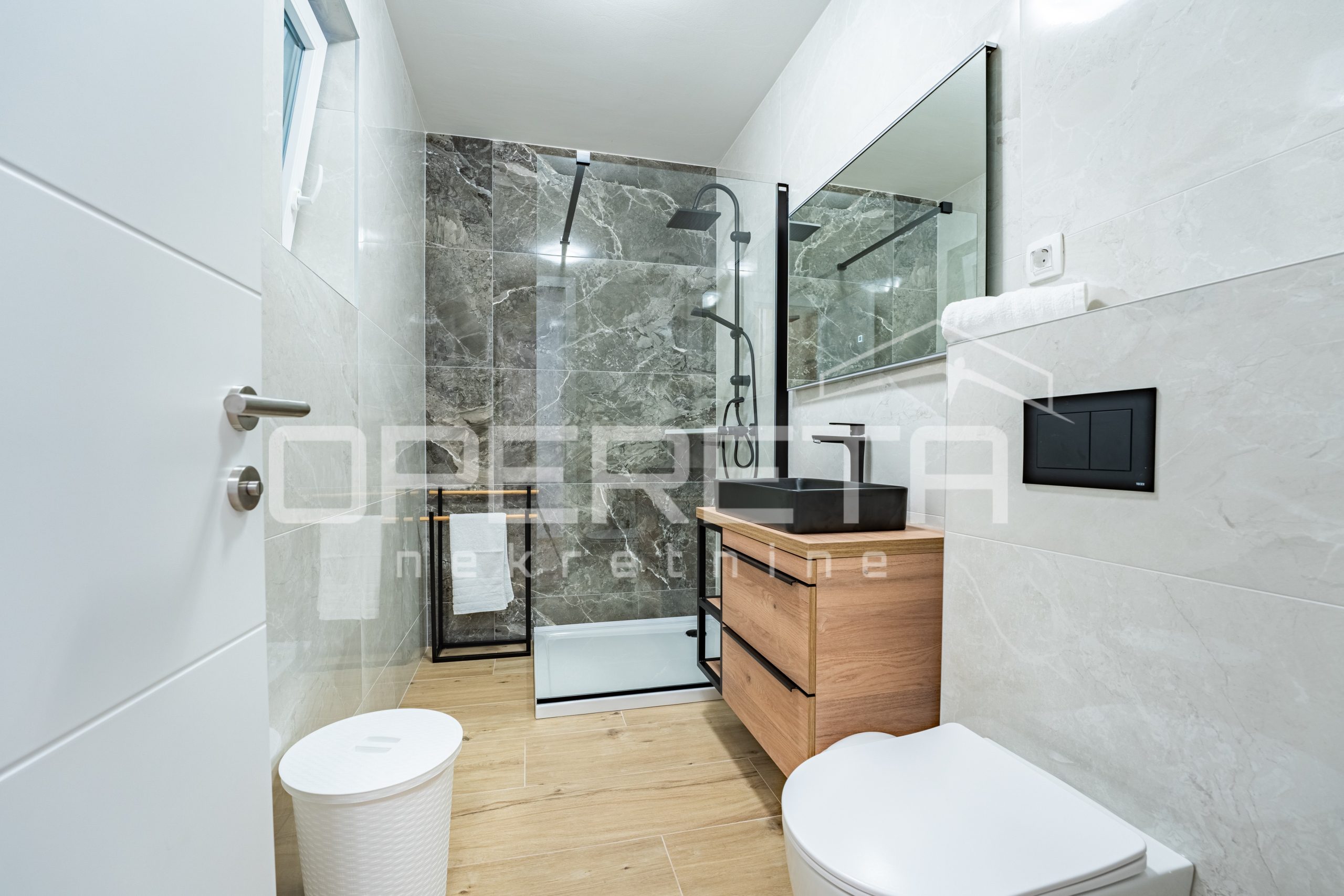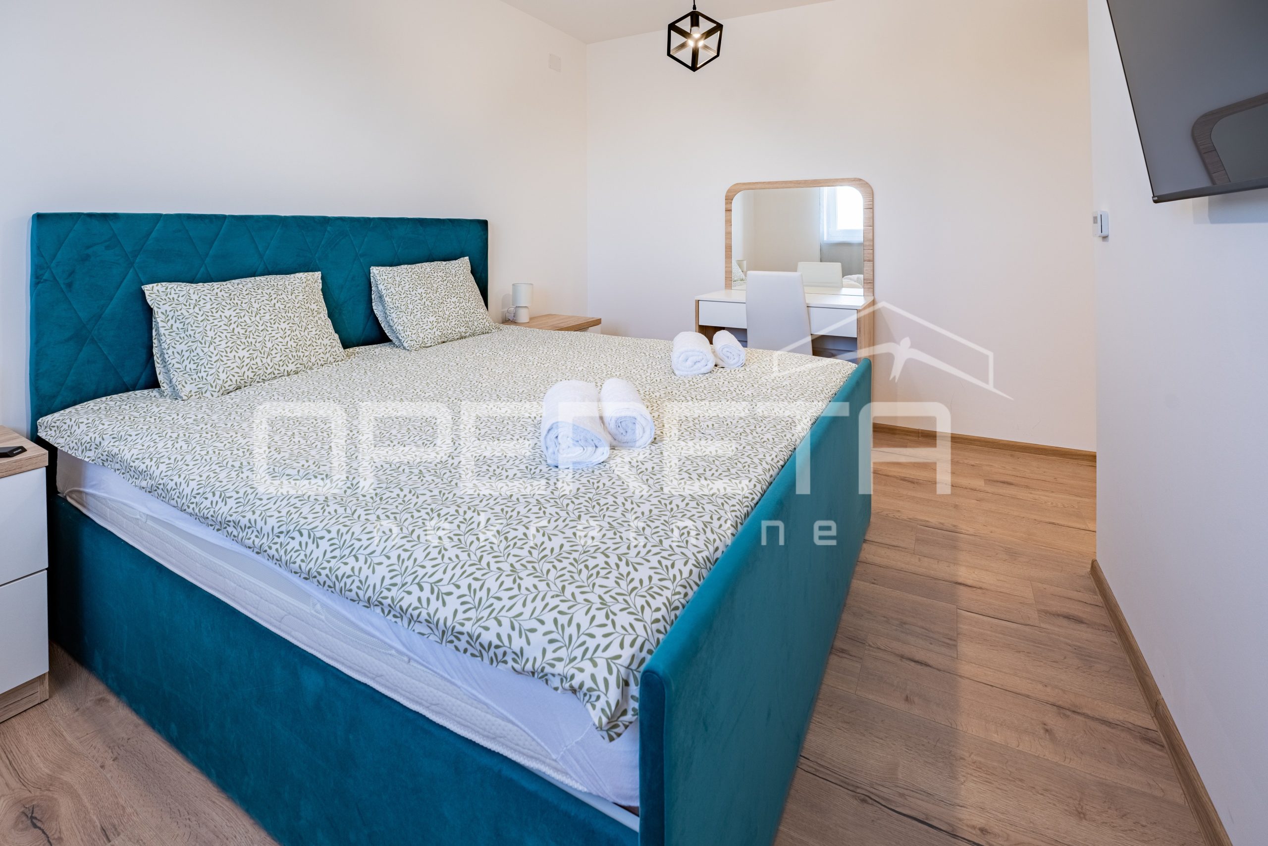Vila se prostire na dvije etaže i sadrži čak pet prostranih spavaćih soba, svaka s vlastitom kupaonicom, čime se osigurava maksimalna privatnost i udobnost za sve članove obitelji ili goste. Dodatna šesta soba pruža fleksibilnost – idealna kao radna soba, fitness, igraonica ili dodatna spavaća soba prema potrebi.