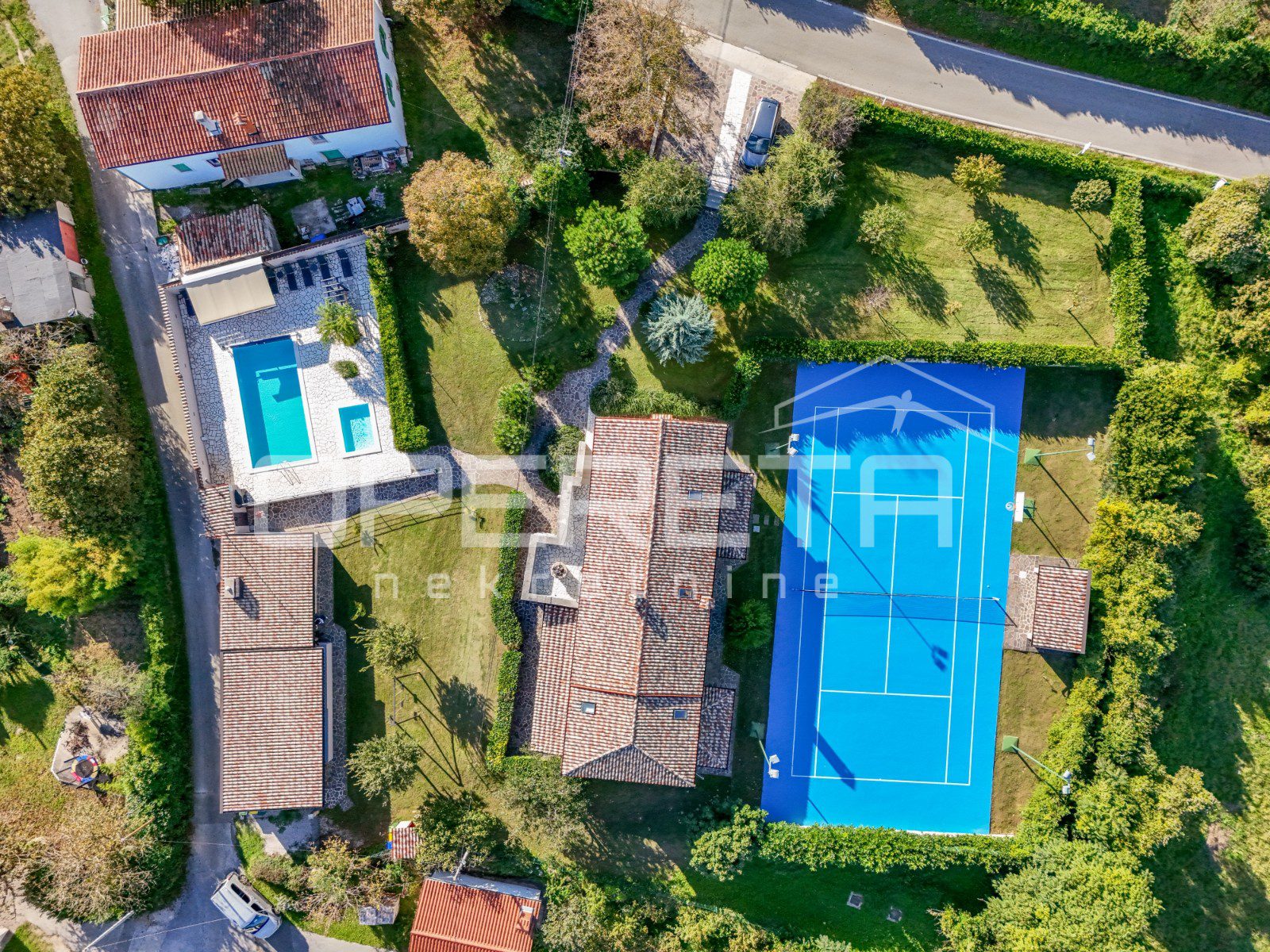 Prostrana ograđena okućnica nudi potpunu privatnost i obilje sadržaja za uživanje na otvorenom. Na raspolaganju su dva bazena – veći od 54 m² i manji, dječji od 9 m² – te teniski teren s pomoćnim objektom. Ljetna kuhinja s krušnom peći i zidanim roštiljem, savršena za druženja u toplim večerima. Tu su i dvije terase s prekrasnim pogledom, a čitav prostor obogaćen je zasađenim mediteranskim biljem i voćnjakom s raznim voćkama.