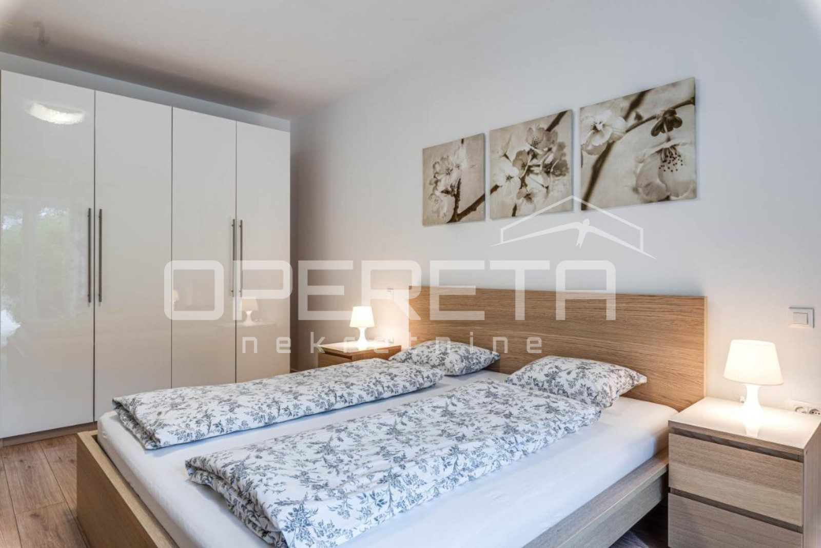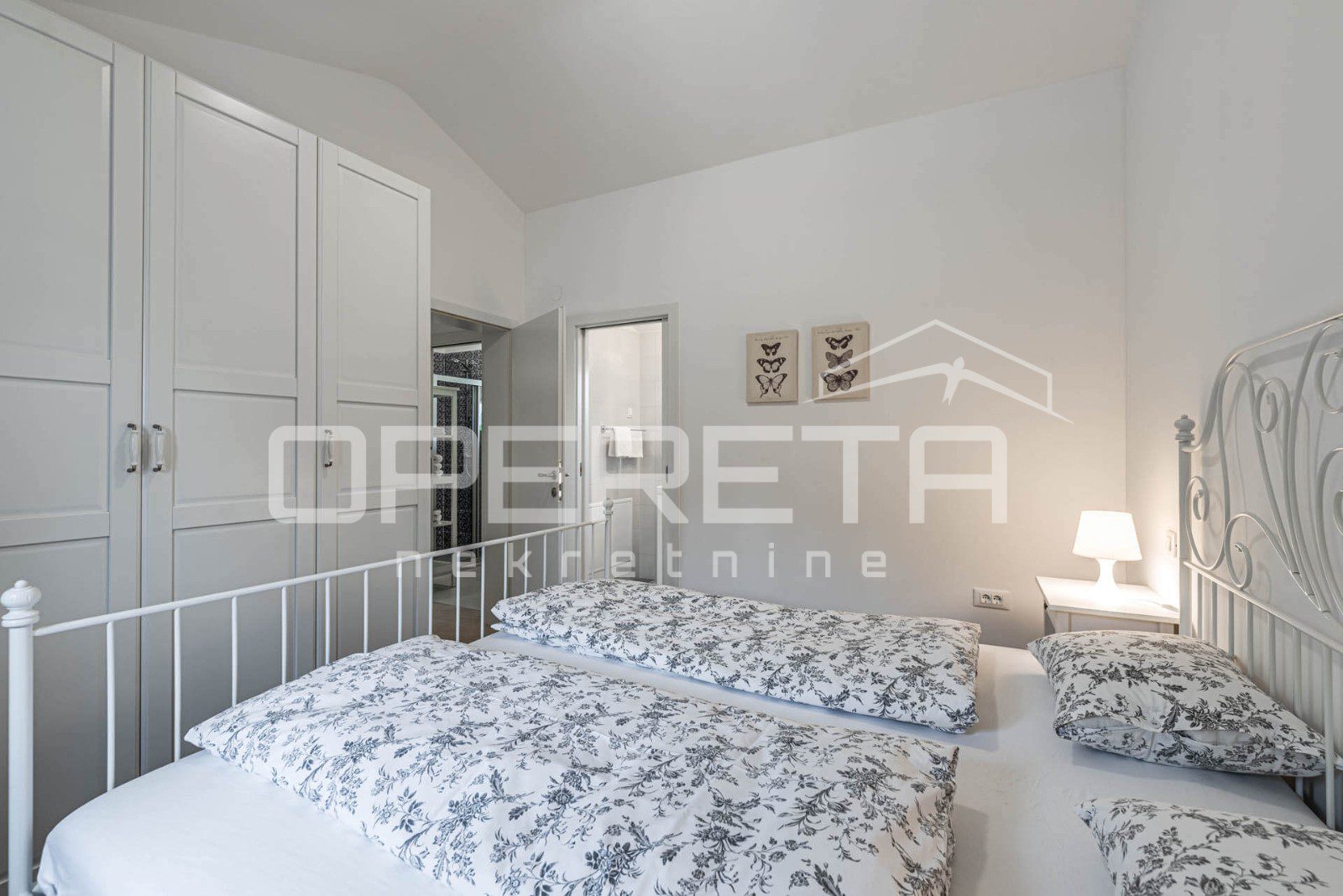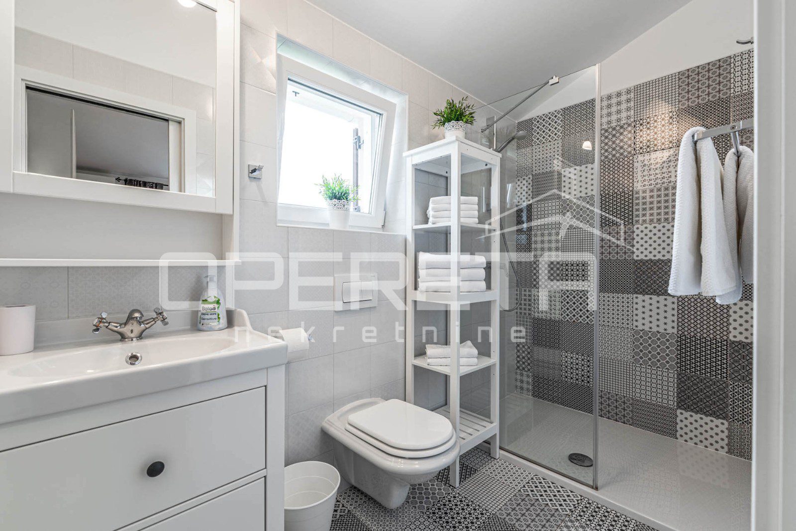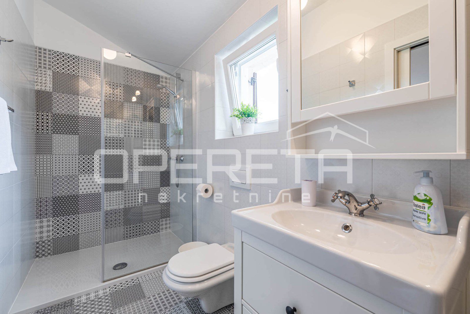Na gornjoj etaži smjestile su se tri spavaće sobe( dvije imaju vlastitu kupaonicu) te jedna dodatna kupaonica i terasa.