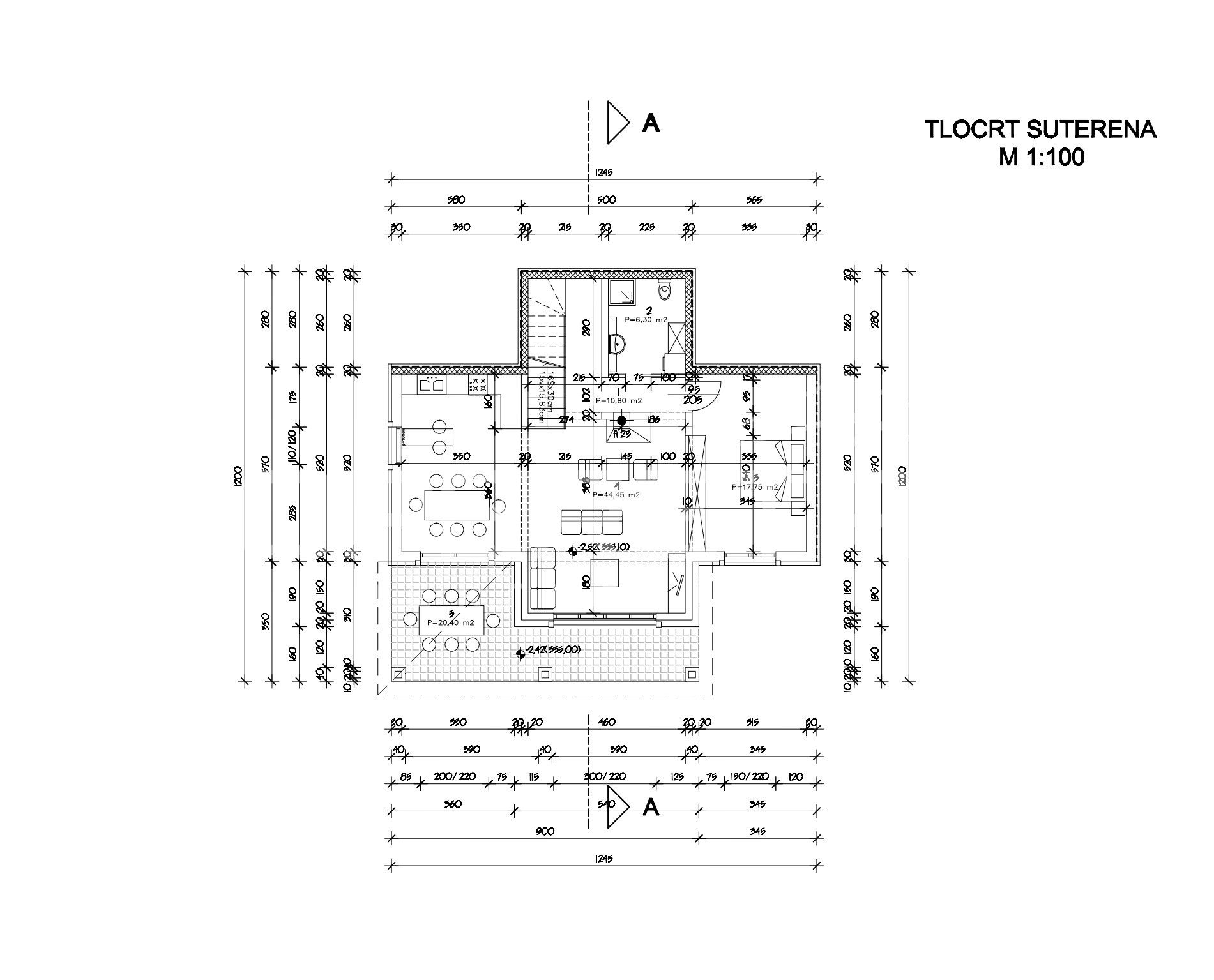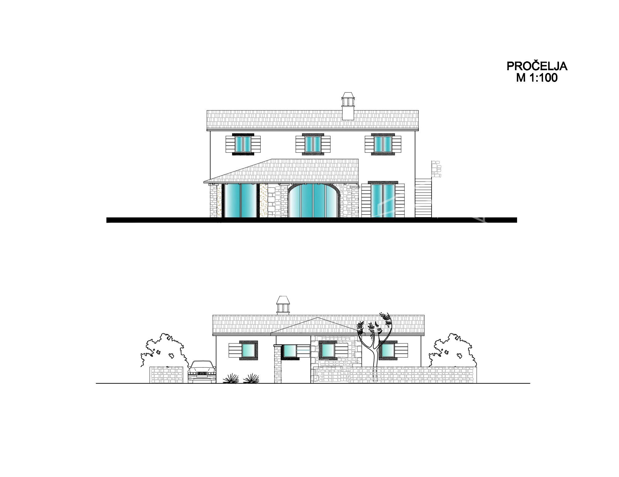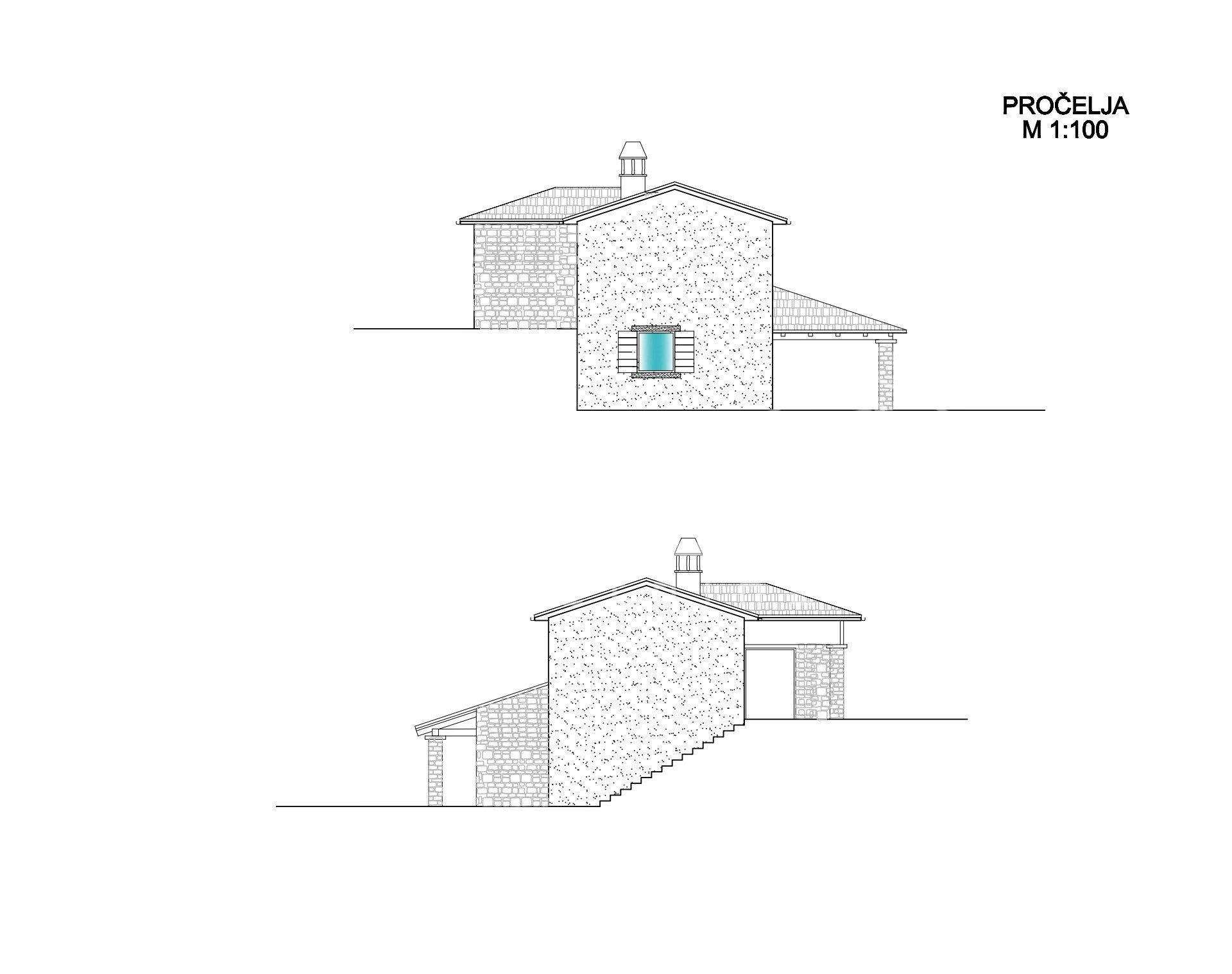 Na donjoj etaži nalaze se dnevni boravak sa izlazom na terasu površine 20 m2, kuhinja sa blagovaonicom i izlazom na terasu, kupaonica i jedna spavaća soba.