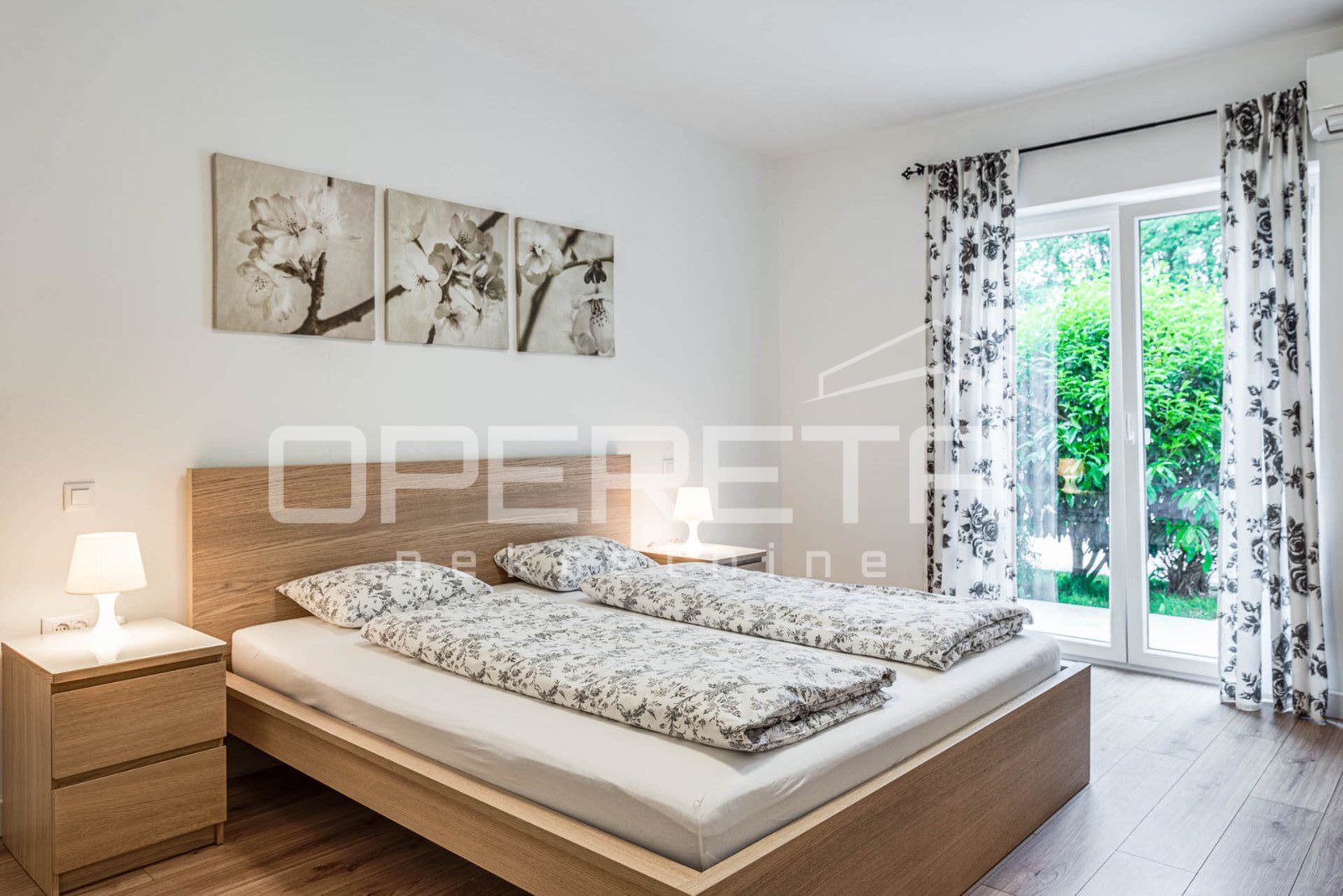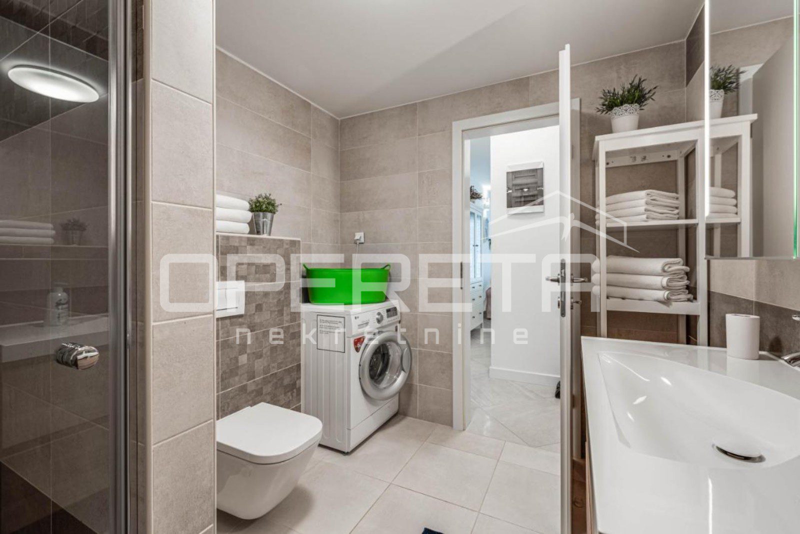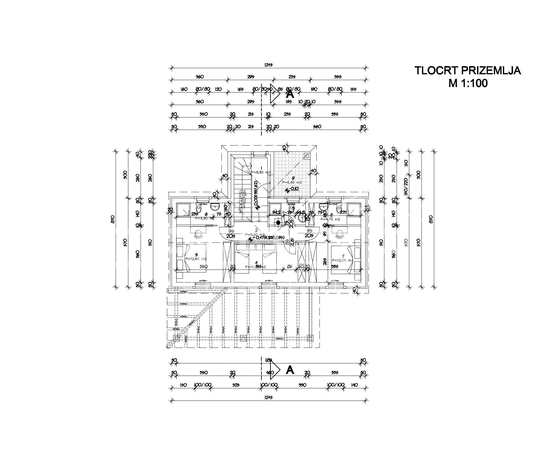 Na donjoj etaži nalaze se dnevni boravak sa izlazom na terasu površine 20 m2, kuhinja sa blagovaonicom i izlazom na terasu, kupaonica i jedna spavaća soba.