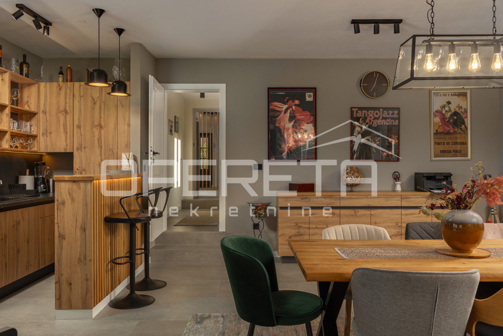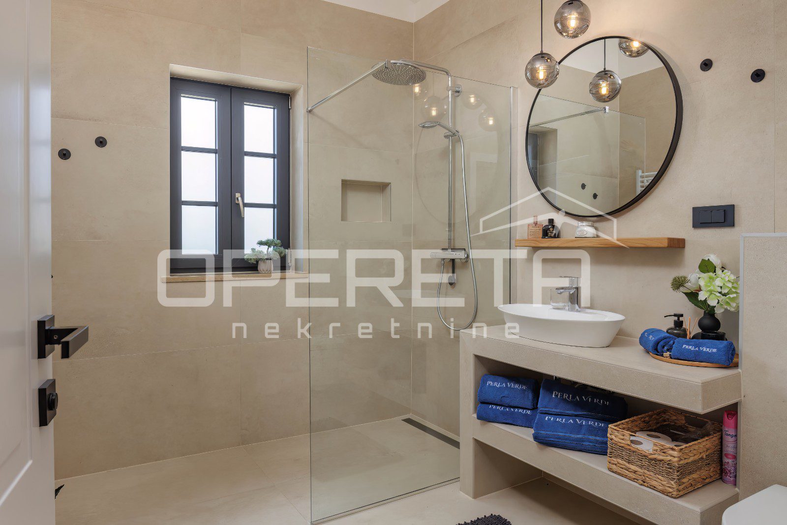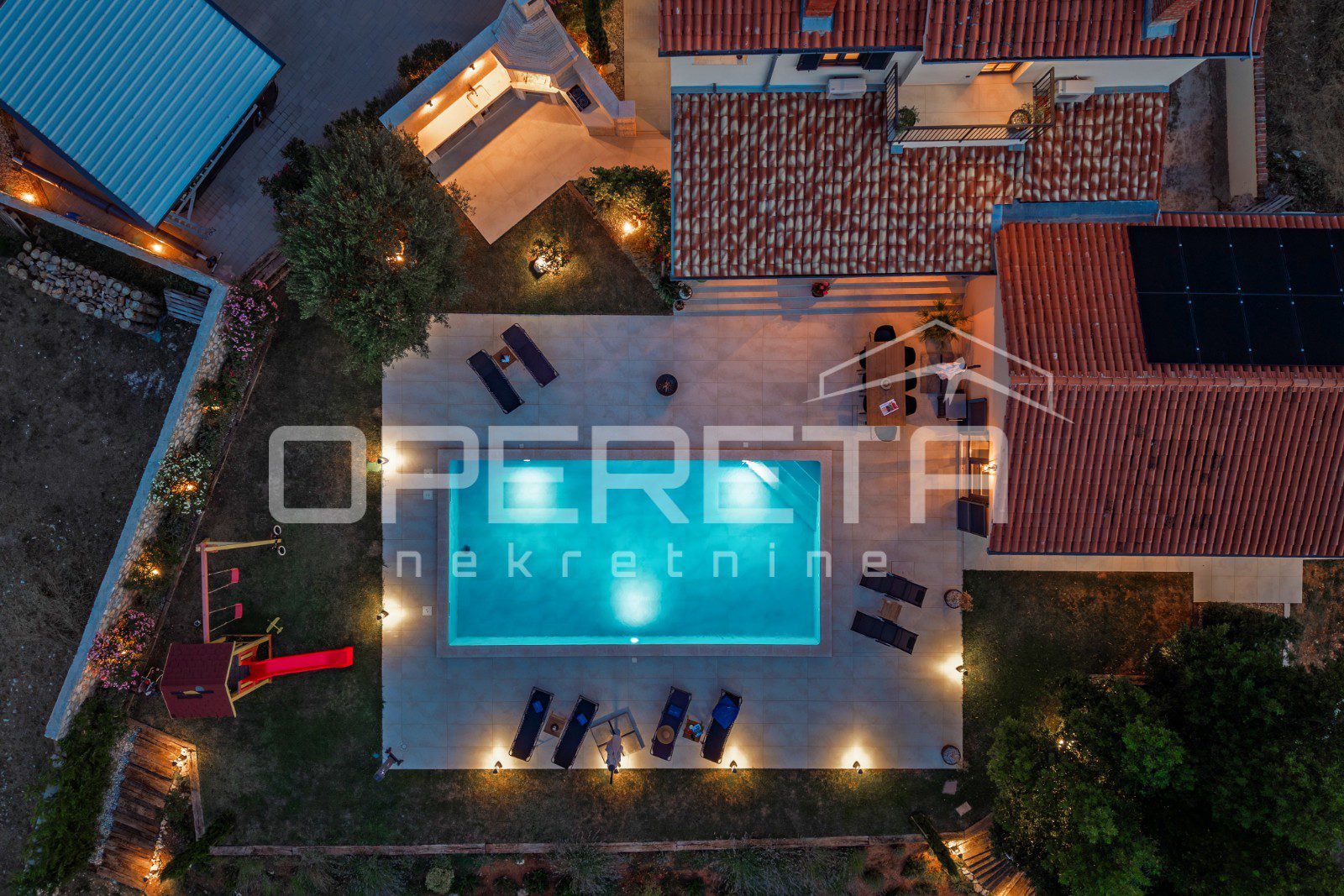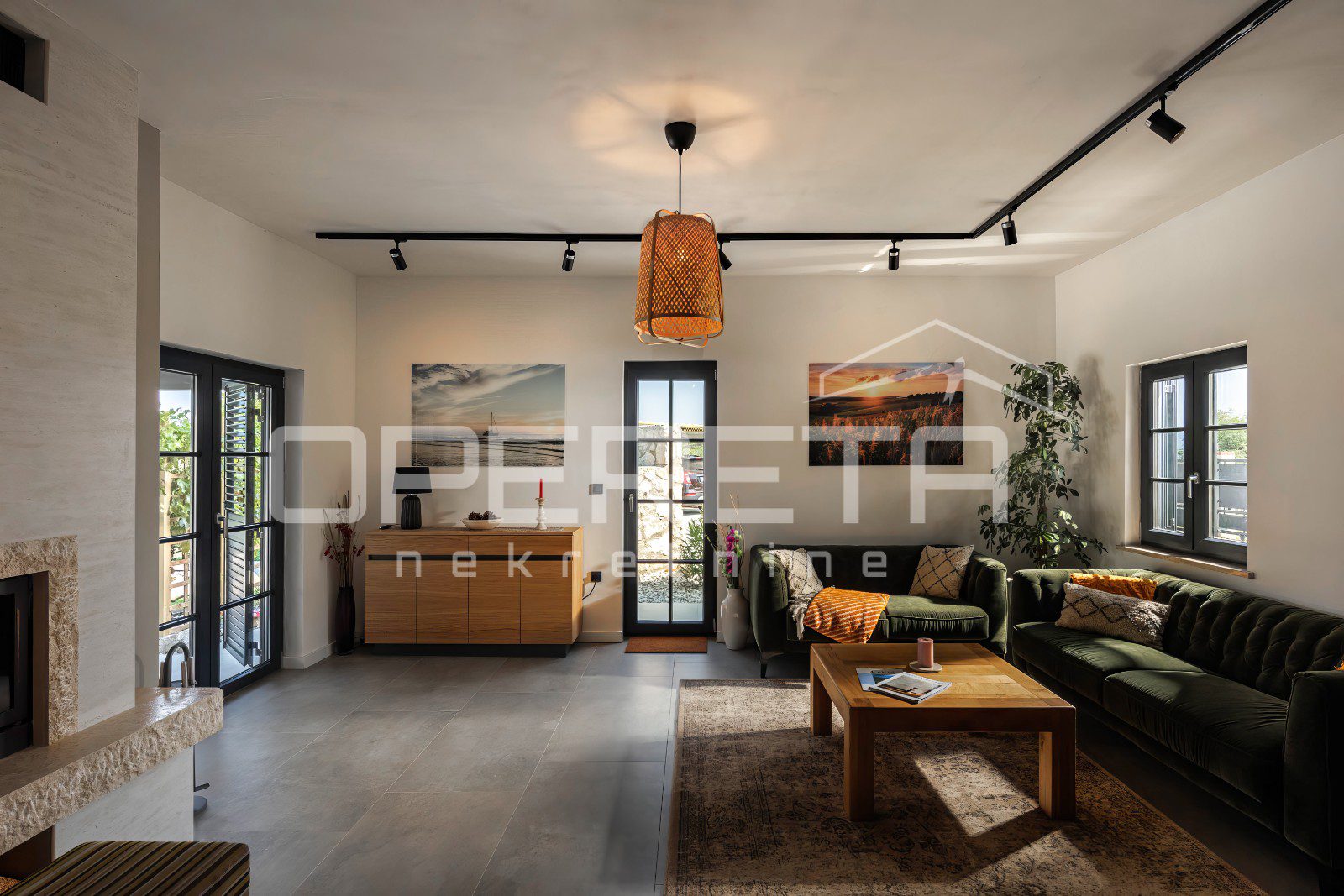 Unutrašnjost je osmišljena s naglaskom na udobnost i eleganciju. Četiri prostrane spavaće sobe imaju vlastite kupaonice uređene talijanskom keramikom, dok dnevni dio krasi autentični kameni kamin koji prostoru daje poseban karakter. Moderna kuhinja izrađena po mjeri povezana je s blagovaonicom i barom, stvarajući savršeno mjesto za zajednička druženja, dok su svi prostori pažljivo povezani s vanjskim terasama kako bi se naglasio sklad unutarnjeg i vanjskog života.