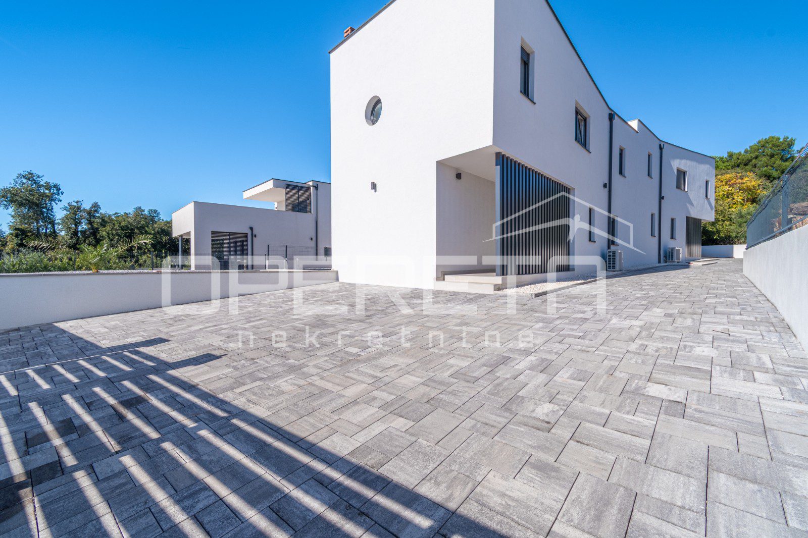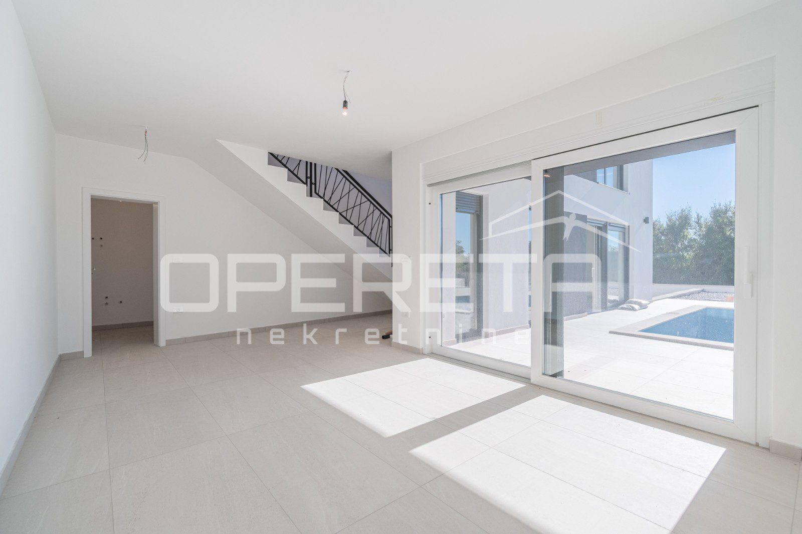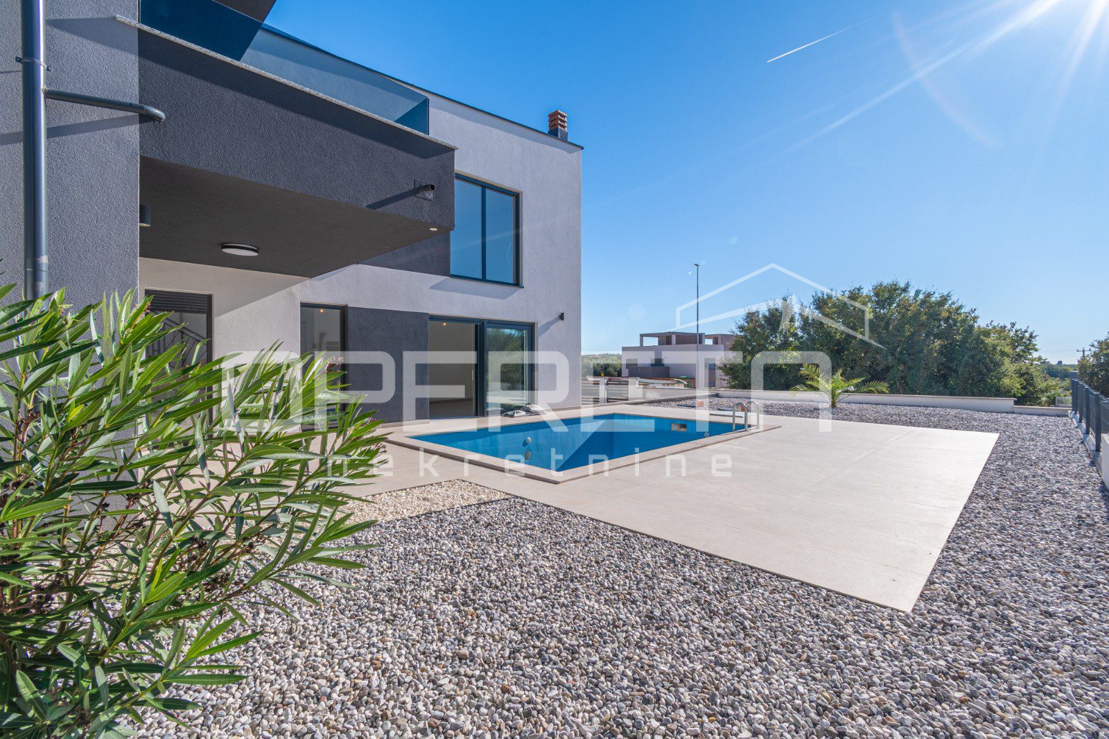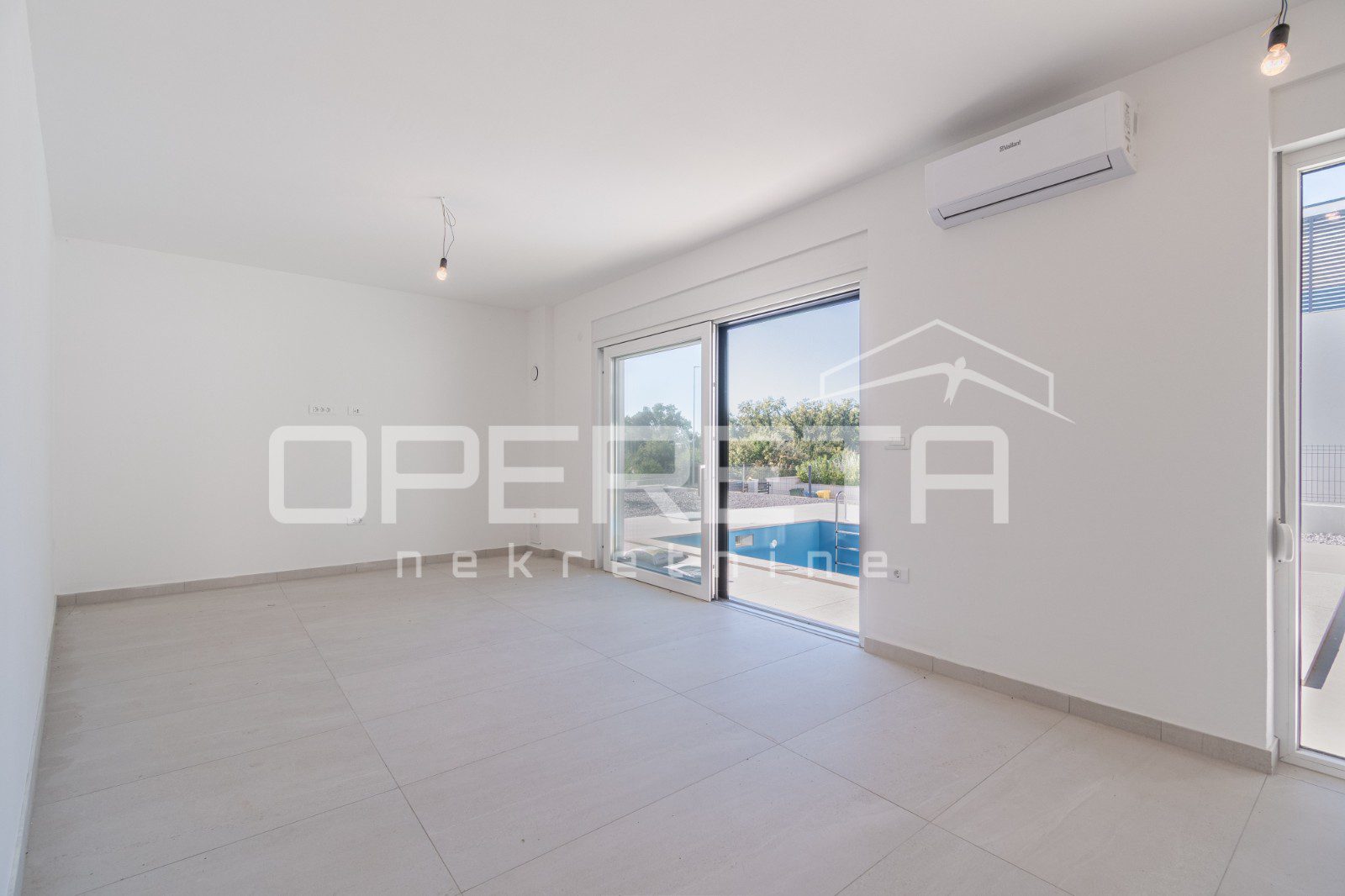 Kuća je orijentirana prema jugu, s ravnim krovom. Stolarija je PVC, s troslojnim staklima i električnim podizačima. Sve prostorije osim soba su obložene pločicama, a postavljene su 4 klima uređaja (u svakoj sobi i dnevnom boravku). Okućnica uključuje bazen veličine 28 m2 (7×4 m), idealan za uživanje u toplim ljetnim danima, vrt i parkirna mjesta.