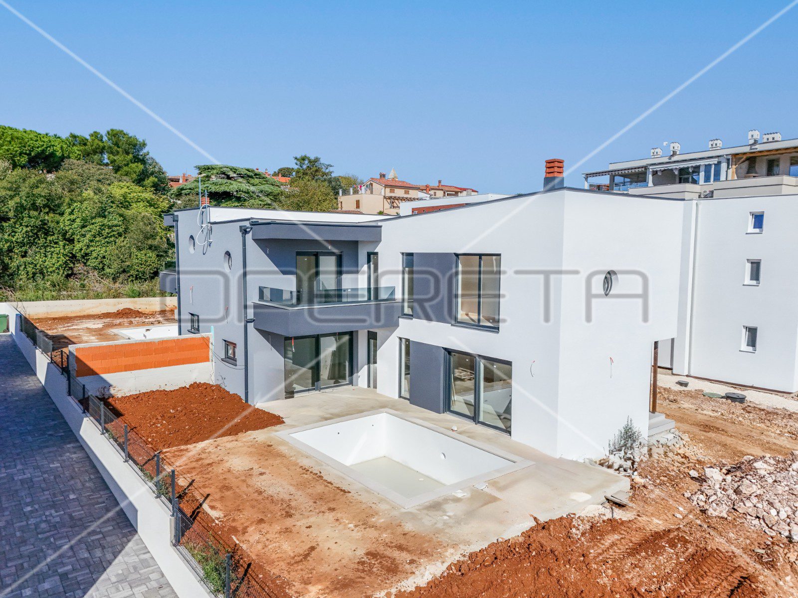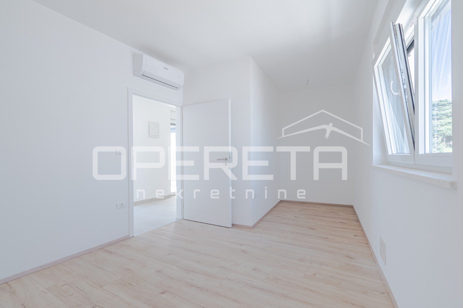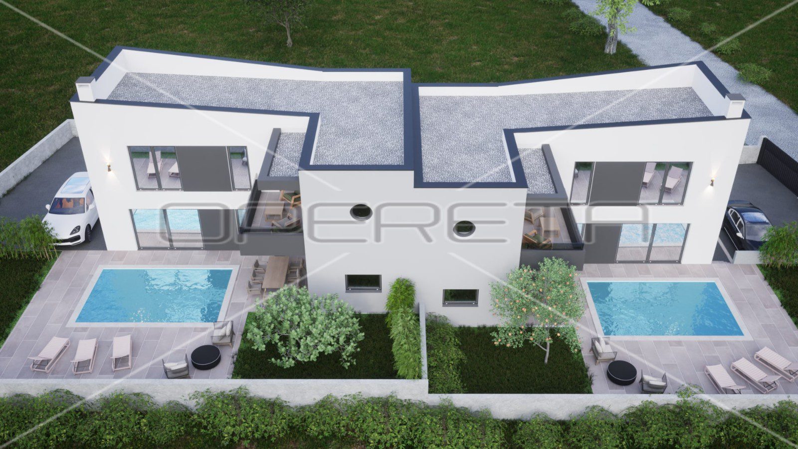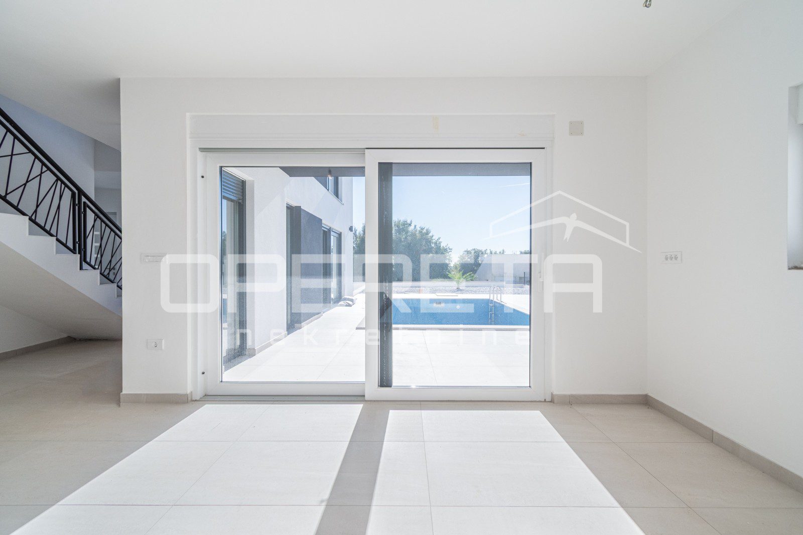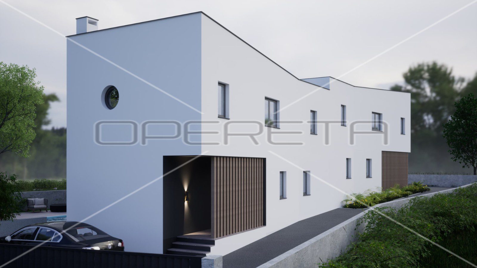 Kuća je orijentirana prema jugu, s ravnim krovom. Stolarija je PVC, s troslojnim staklima i električnim podizačima. Sve prostorije osim soba su obložene pločicama, a postavljene su 4 klima uređaja (u svakoj sobi i dnevnom boravku). Okućnica uključuje bazen veličine 28 m2 (7×4 m), idealan za uživanje u toplim ljetnim danima, vrt i parkirna mjesta.