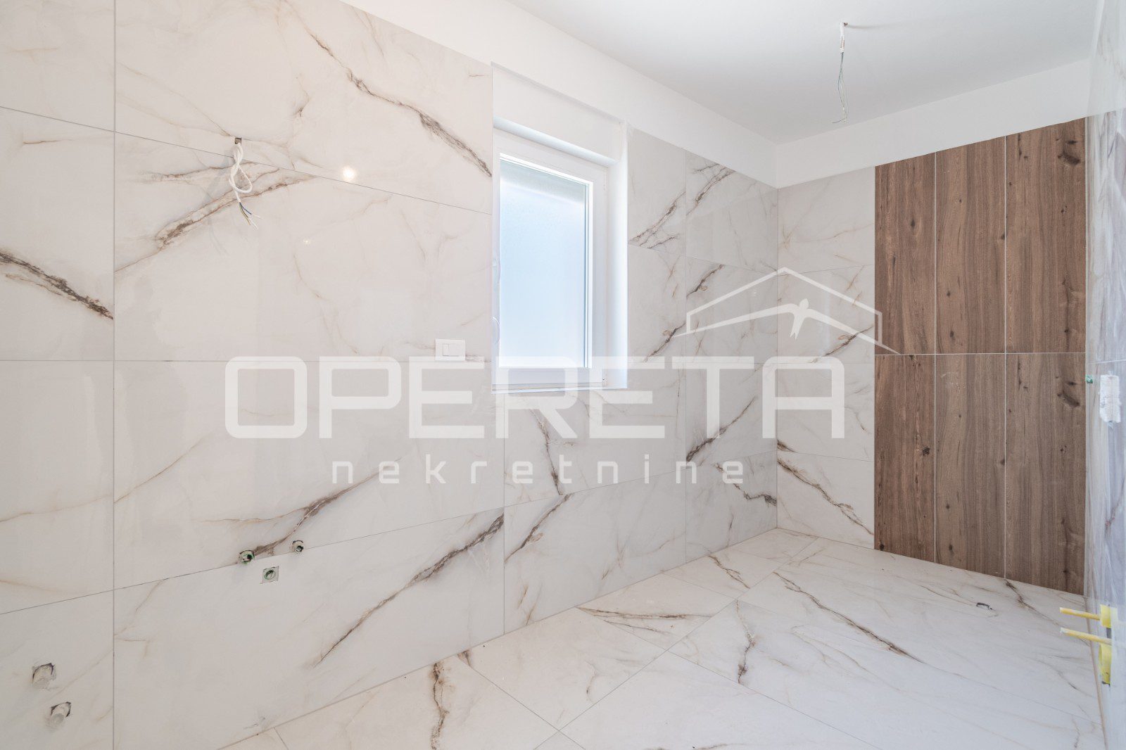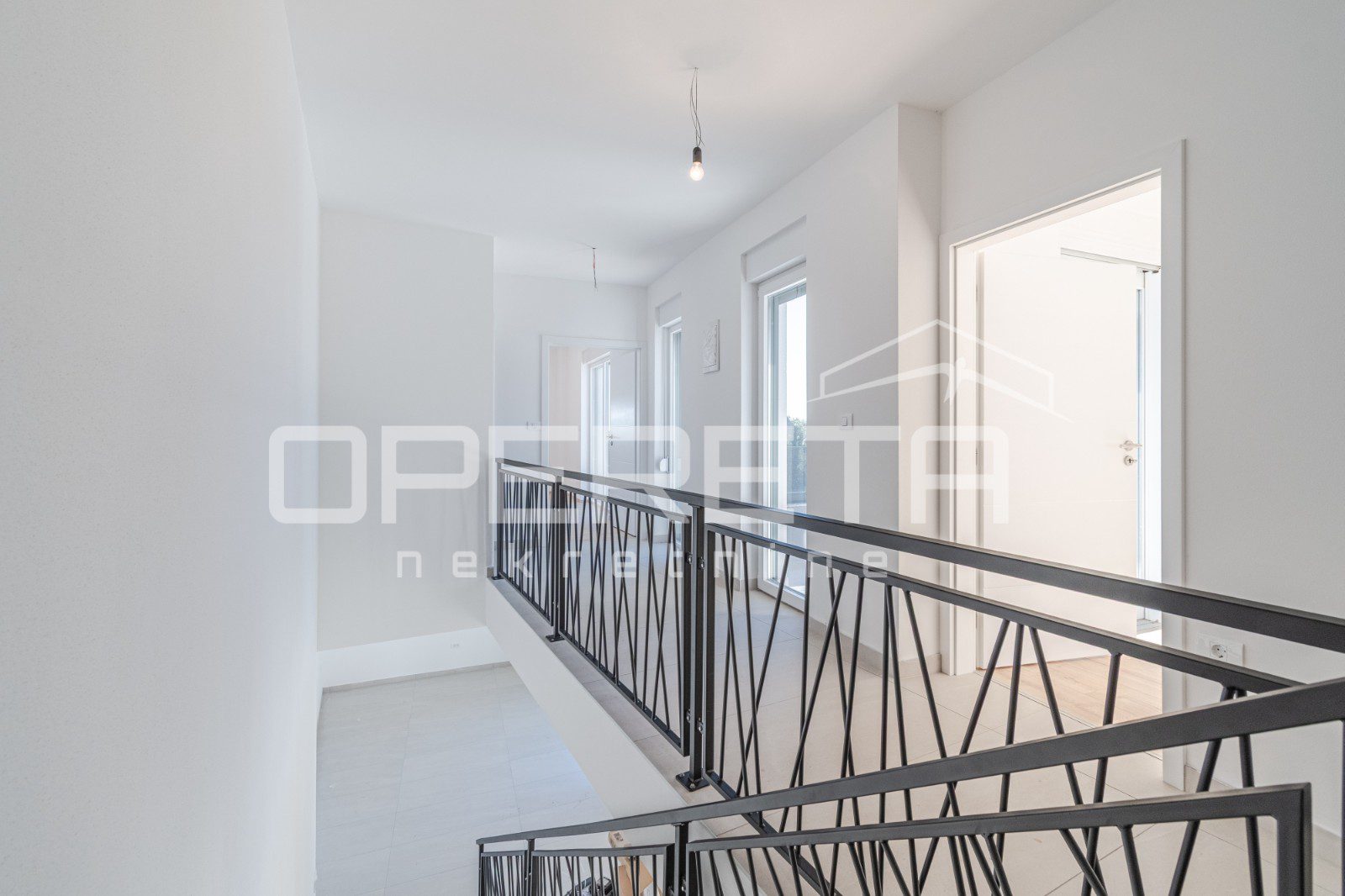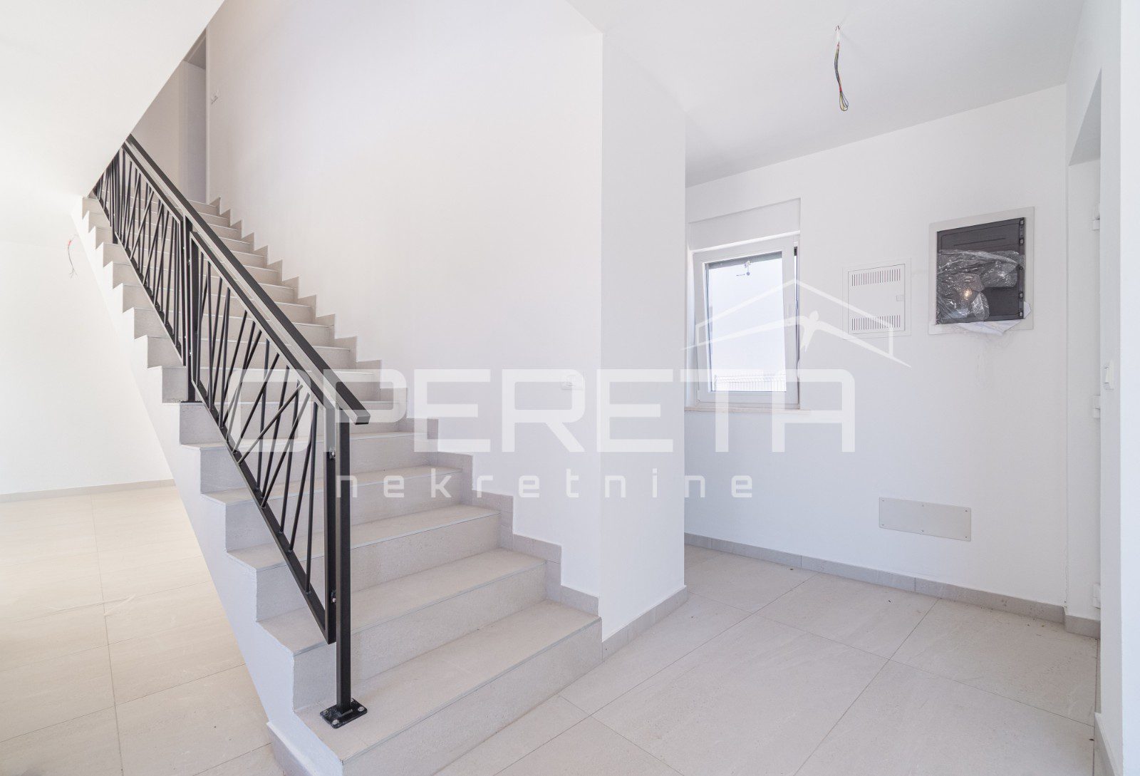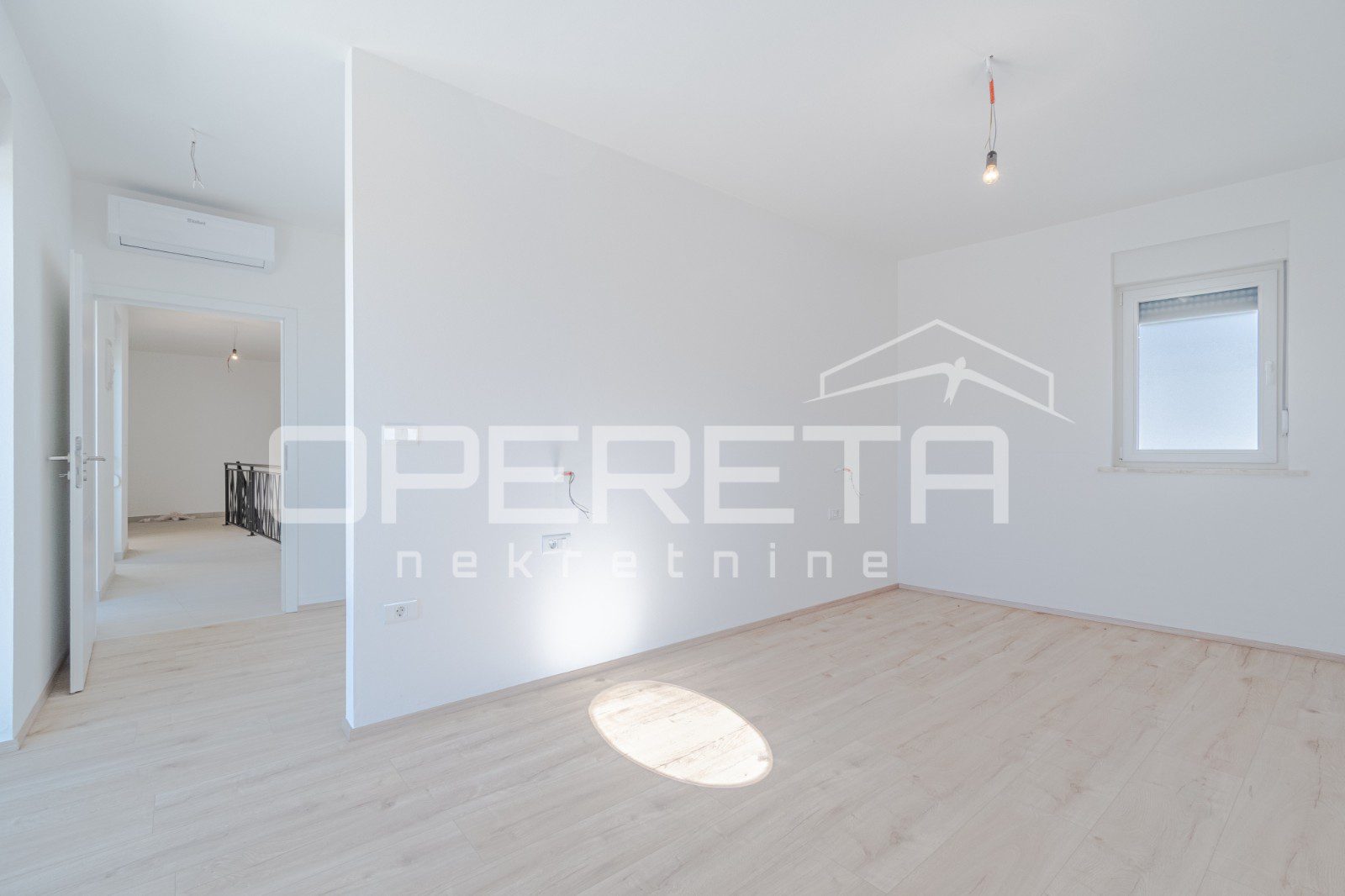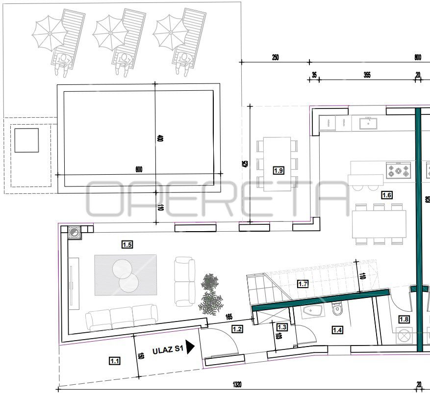 Kuća je orijentirana prema jugu, s ravnim krovom. Stolarija je PVC, s troslojnim staklima i električnim podizačima. Sve prostorije osim soba su obložene pločicama, a postavljene su 4 klima uređaja (u svakoj sobi i dnevnom boravku). Okućnica uključuje bazen veličine 28 m2 (7×4 m), idealan za uživanje u toplim ljetnim danima, vrt i parkirna mjesta.