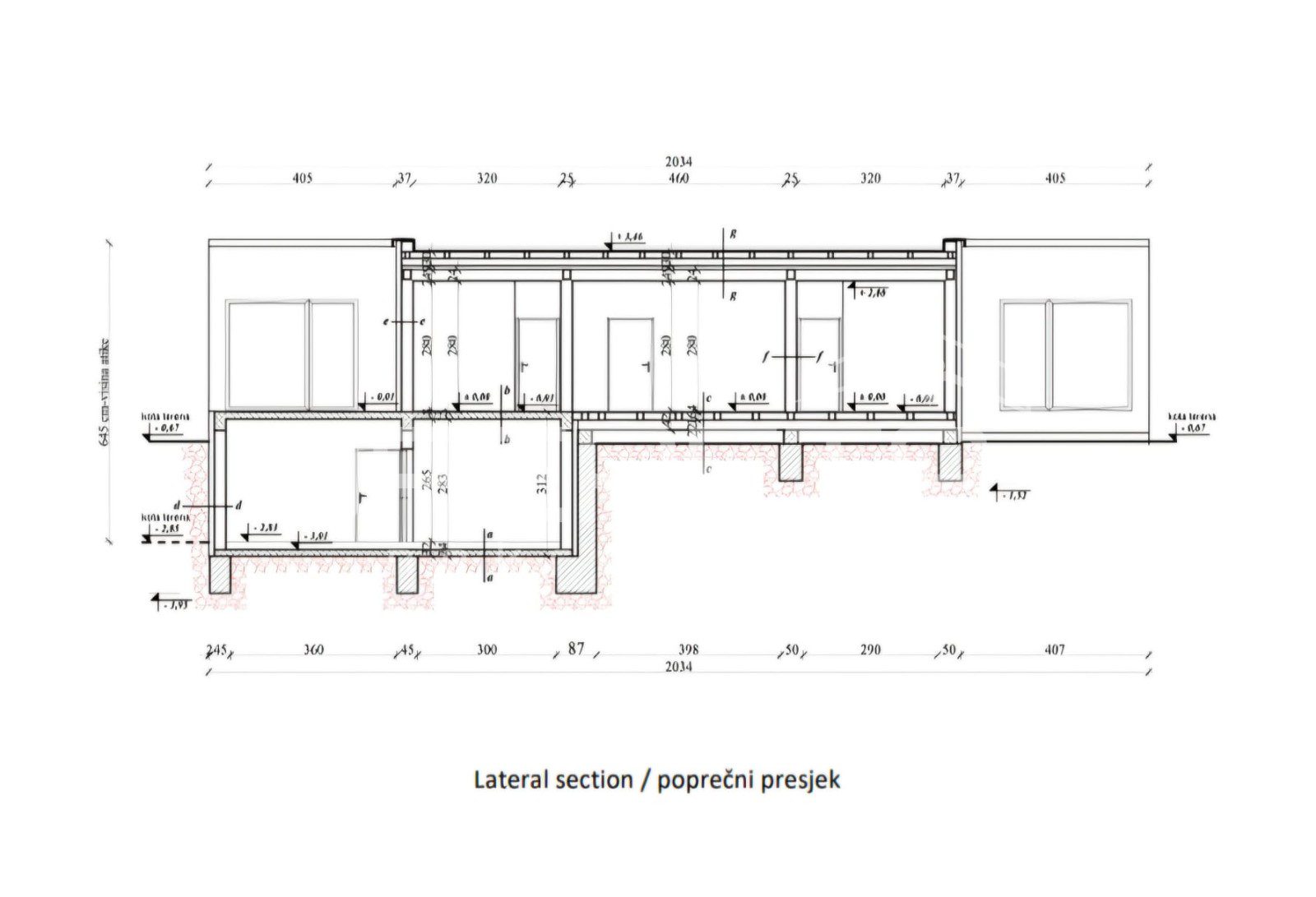 Prizemlje je podijeljeno u dva funkcionalna krila, svako s dvije spavaće sobe. Kupaonice su kompaktne i praktično organizirane, dok su ormari diskretno integrirani u zidne niše. Podovi su izvedeni od suvremenih materijala na bazi epoksidne smole, a konstrukcija kuće kombinira drvene nosive elemente (ariš) s armiranobetonskim temeljima i zidovima podruma. Završna obrada fasade izvedena je u ETICS sustavu s 12 cm termoizolacije i završnim slojem silikatne žbuke.