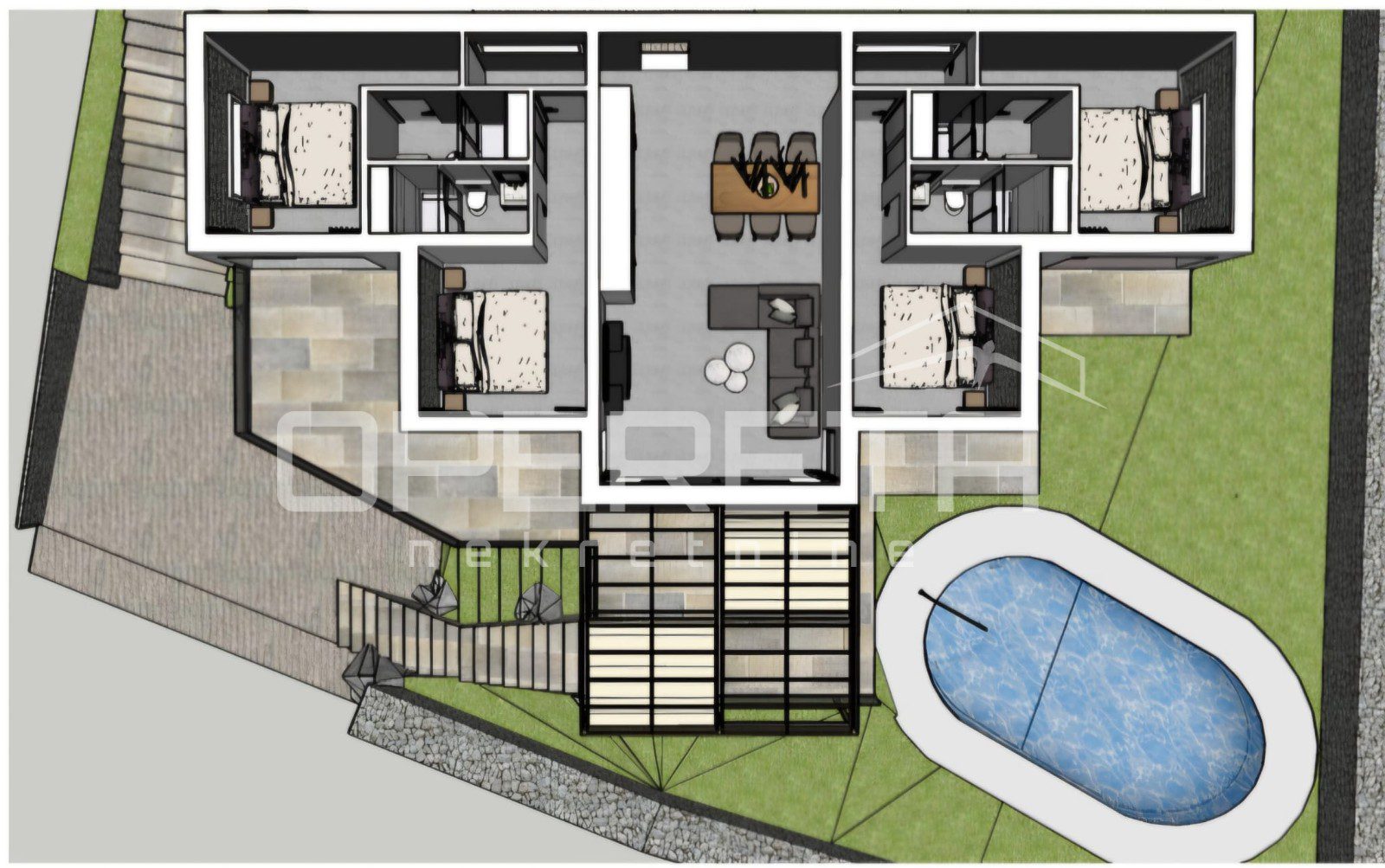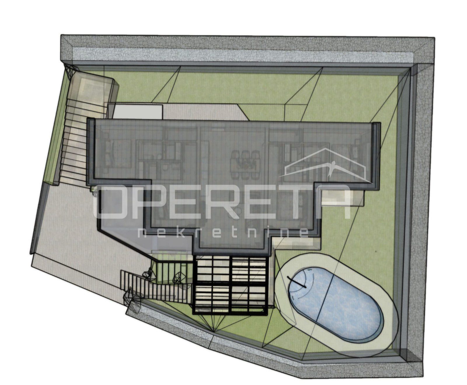 Krov je ravan, s mogućnošću formiranja velike krovne terase s pogledom na more. Okućnica je uređena u mediteranskom stilu, sa suhozidima, maslinama i aromatičnim biljem, a u središtu se nalazi ovalni bazen s kamenim popločanjem.