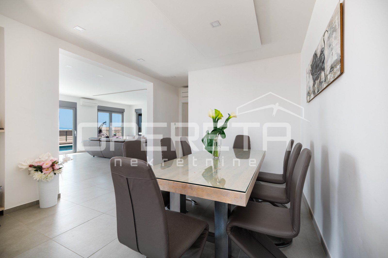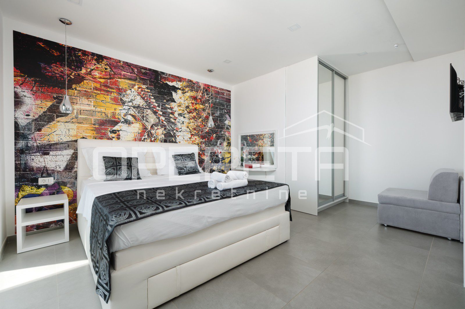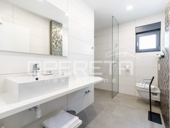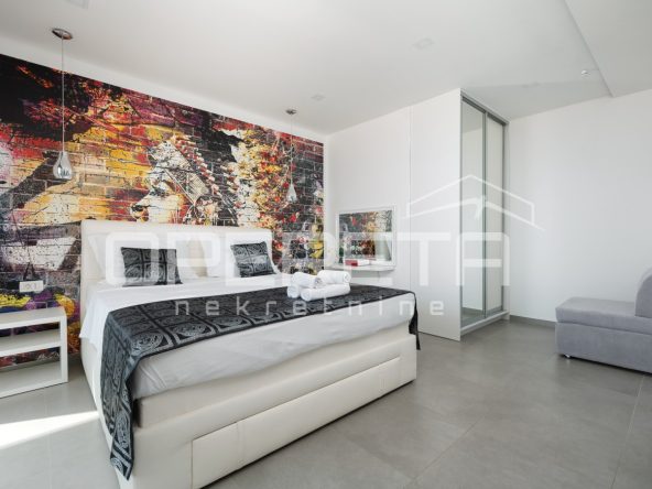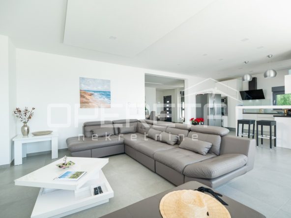Prostrani interijeri uređeni su s posebnom pažnjom prema detaljima, nudeći pet elegantnih spavaćih soba i jednako raskošne kupaonice. Osjećaj privatnosti i ekskluzivnosti prati vas u svakom kutku, od sunčanog vrta do bazena sa sunčalištem koji se skladno uklapa u mediteransko zelenilo.