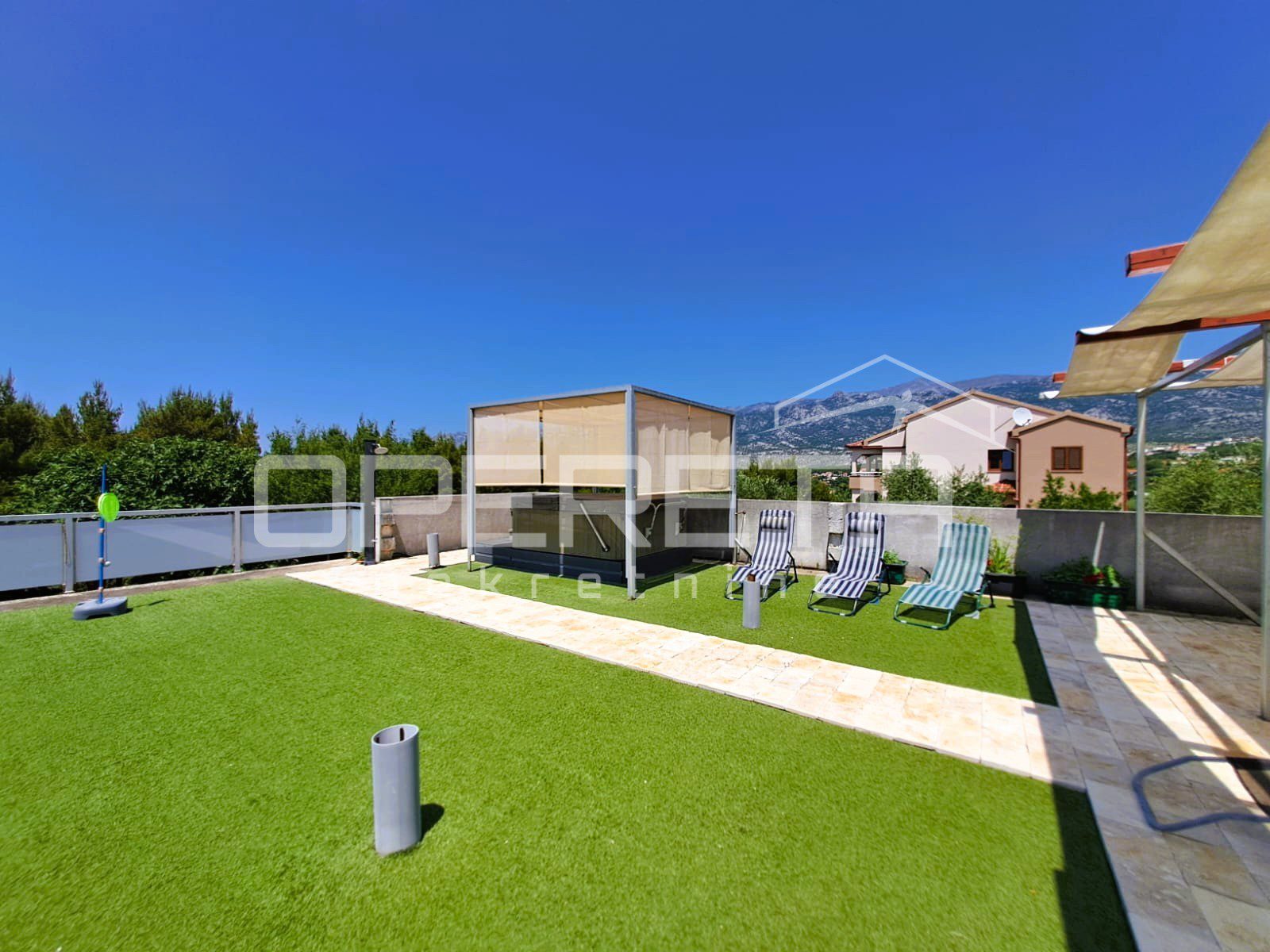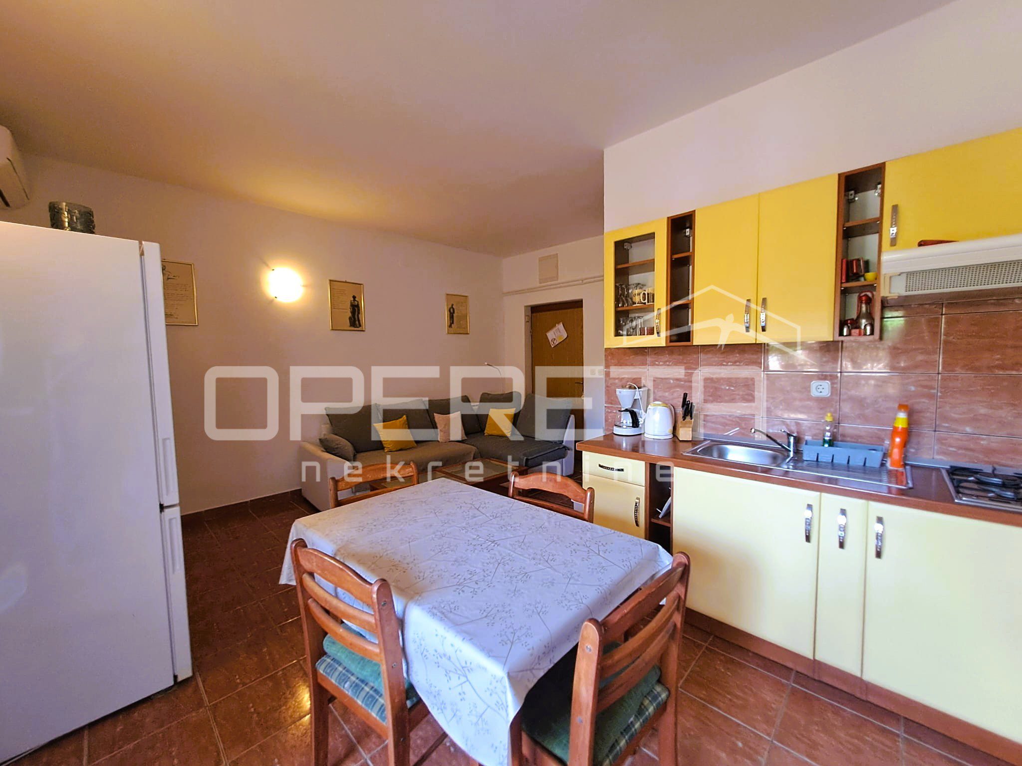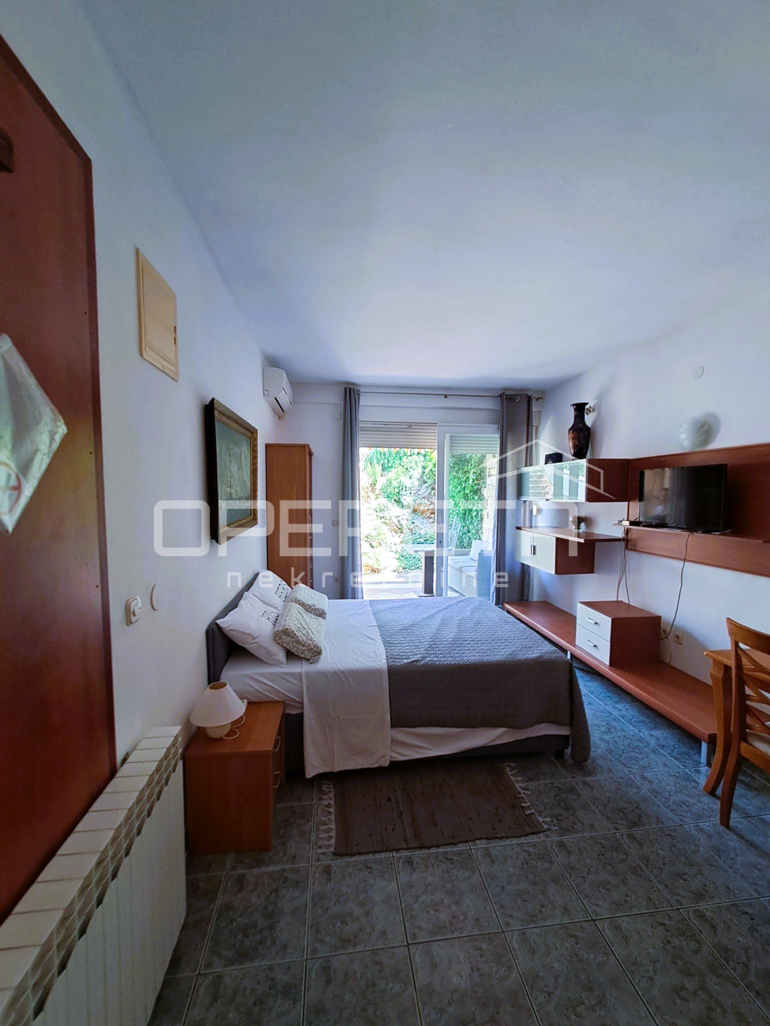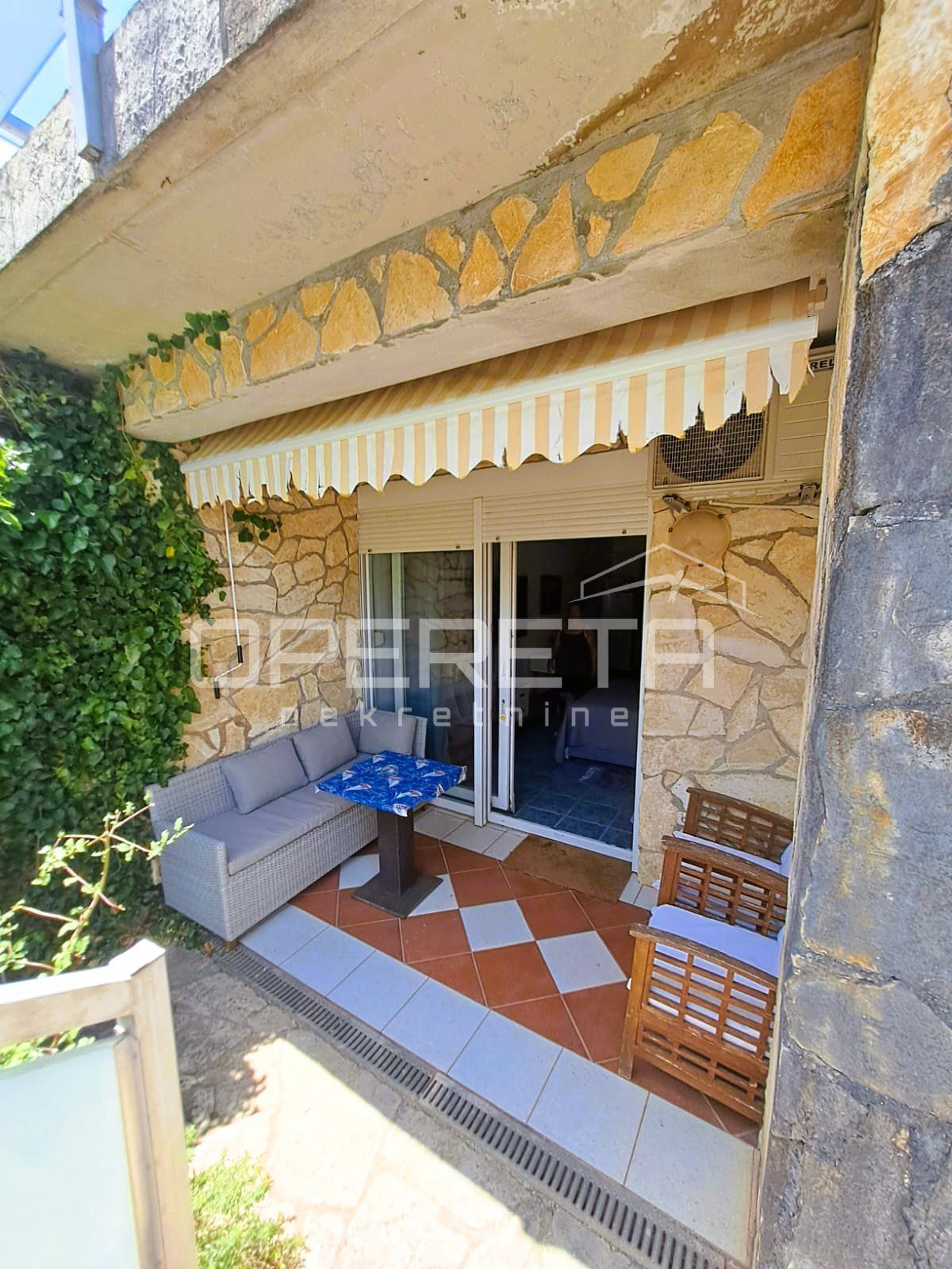 Ova nekretnina prostire se u prizemlju i sastoji se od četiri potpuno namještena apartmana, svaki s vlastitim ulazom i terasom, što omogućava maksimalnu privatnost i udobnost. Osim toga, na parceli se nalaze i dvije prostrane garaže, pogodne kako za parkiranje tako i za dodatnu ostavu ili prenamjenu u poslovni prostor. Dvorište je ograđeno i uređeno, a cijeli prostor odiše mirom i privatnošću, što je izuzetno cijenjeno u turističkom najmu, ali i za obiteljski život.