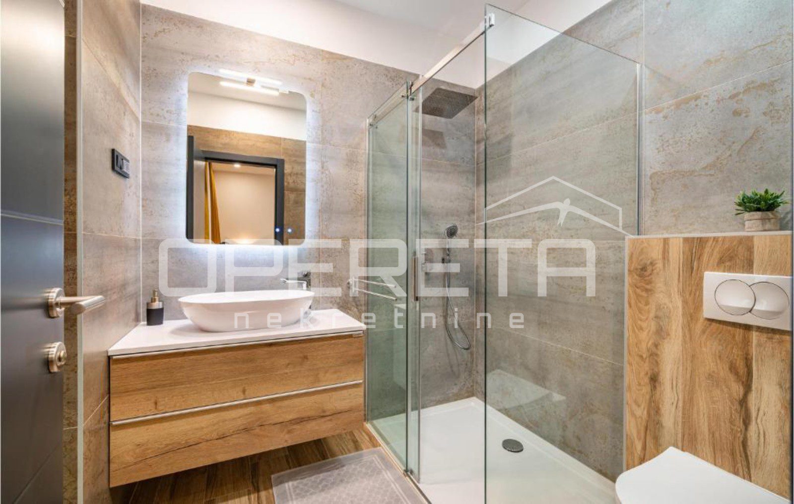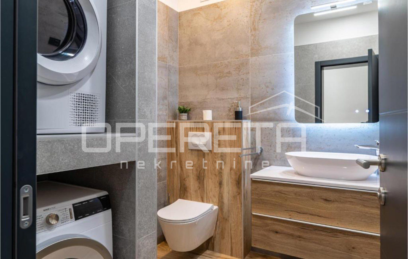 Prizemlje se sastoji od ulaznog prostora s kvalitetno opremljenom kuhinjom i blagovaonicom, dnevnim boravkom te prostorom za uživanje i opuštanje. Na istoj etaži nalazi se i jedna spavaća soba s kupaonicom te dodatni WC opremljen perilicom i sušilicom rublja. Iz svih prostorija omogućen je izlaz na prostranu terasu.